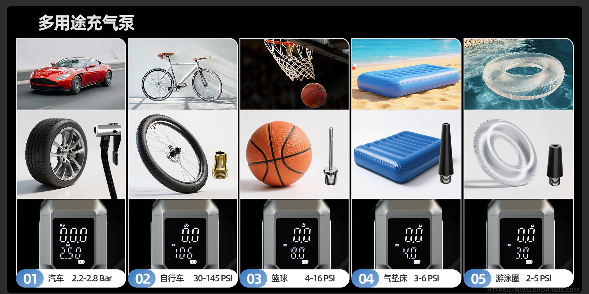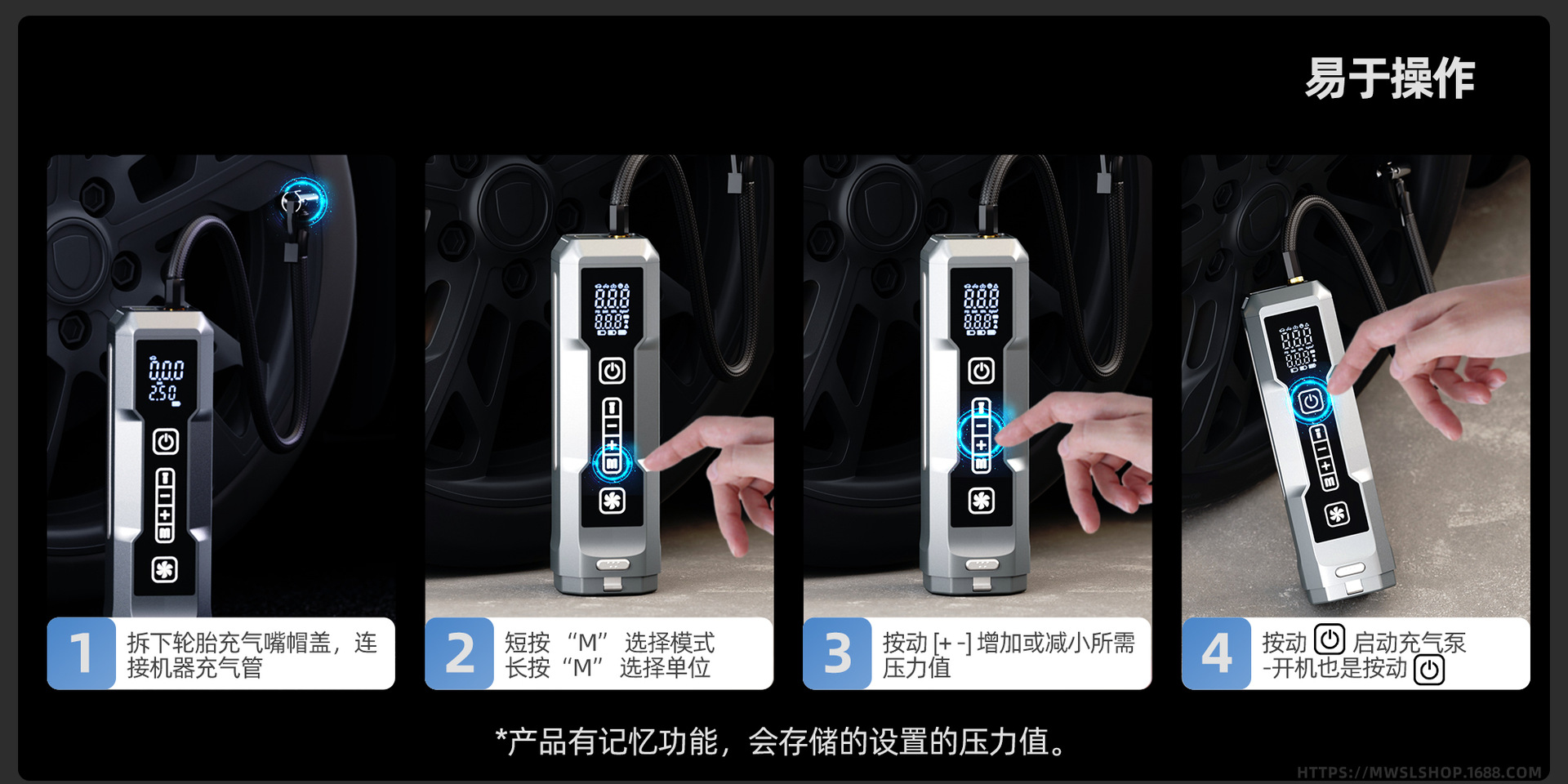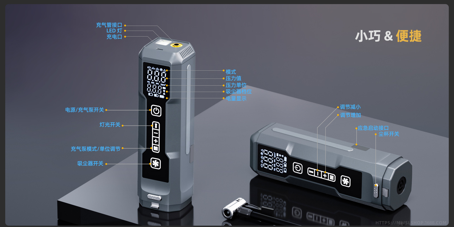 Succión de polvo + inflado + presión de neumáticos + iluminación + puesta en marcha