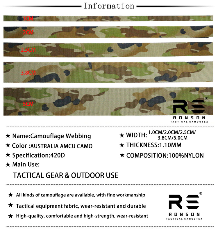 | Especificaciones y modelos | Nueva Australia camuflaje * 1.0cm * 400D * pits * 50 yardas, Nueva Australia camuflaje * 2.0cm * 400D * pits * 50 yardas, Nueva Australia camuflaje * 2.5cm * 400D * pits * 50 yardas, Nueva Australia camuflaje * 3.8cm * 400D * pits * 50 yardas, Nueva Australia camuflaje * 5.0cm * 400D * pits * 50 yardas |