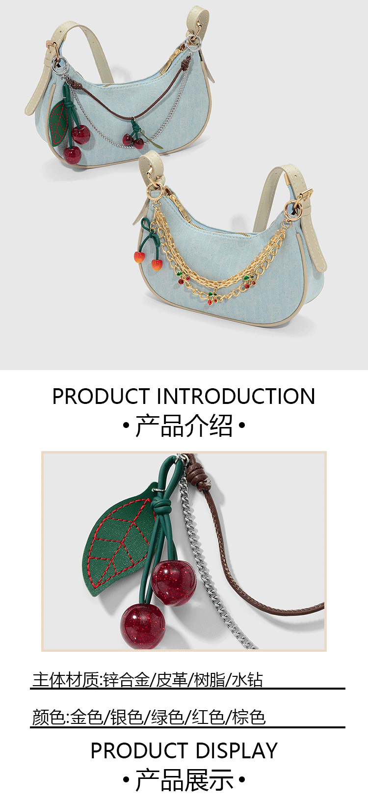 Nuevo y2k exquisito dulce y fresco moda cadena multicolor resina diamantes de imitación destello fino cuero cereza hoja DIY colgante de bolsa