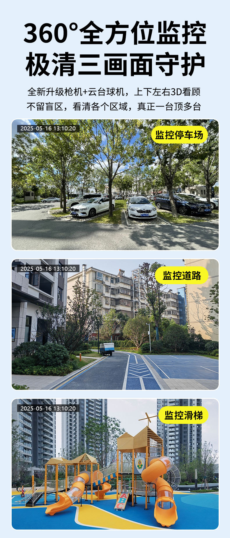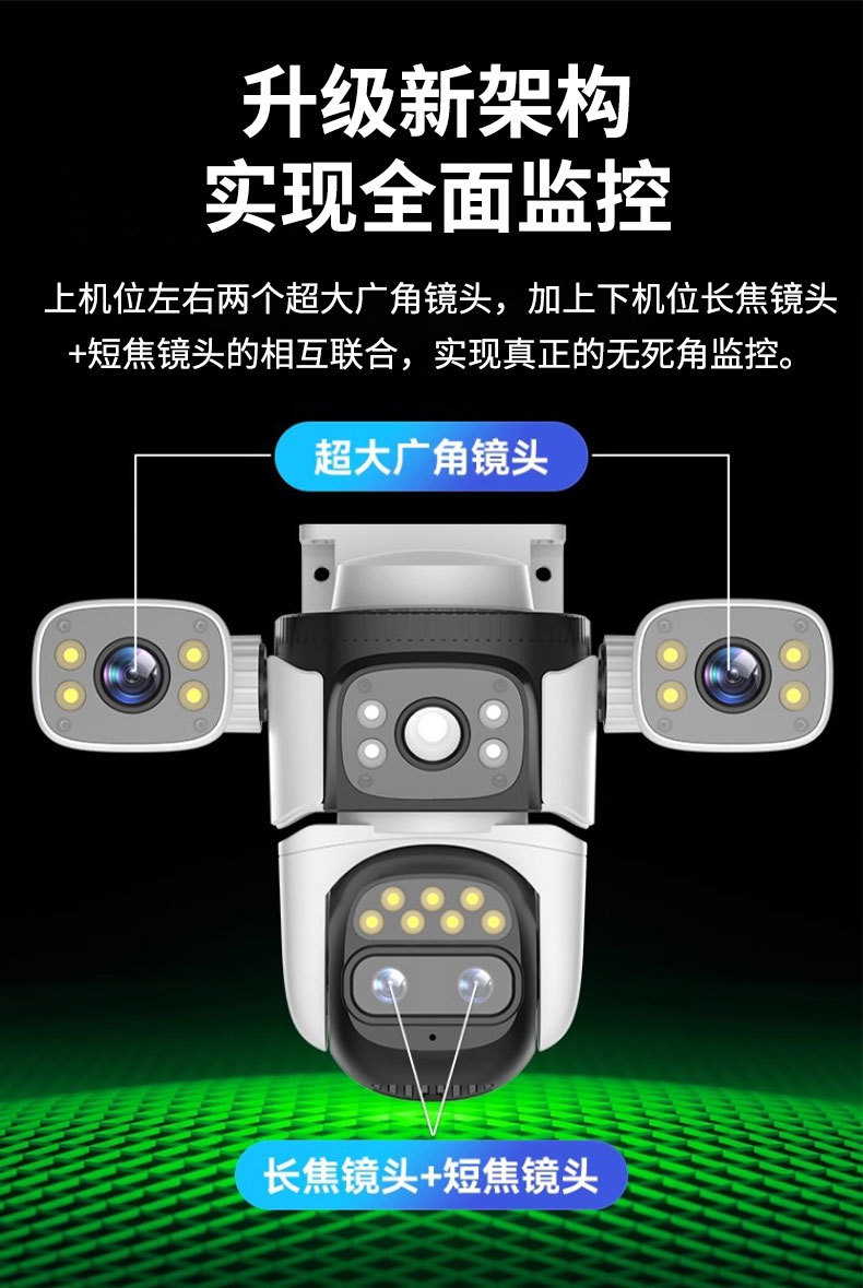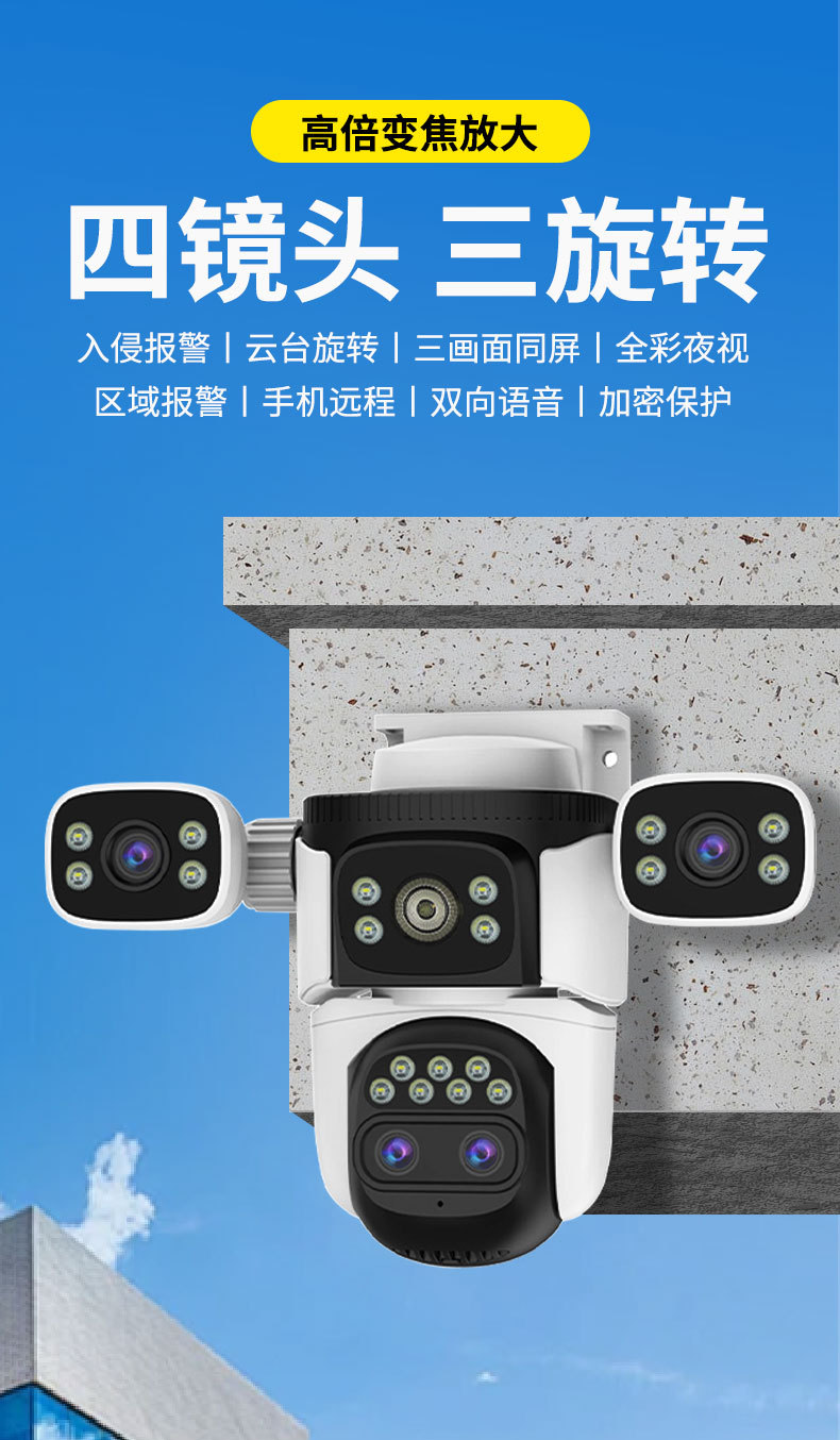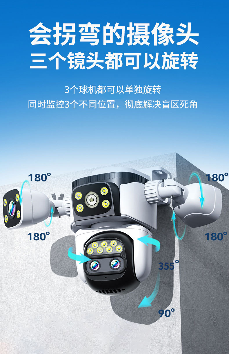 Cámara WiFi inalámbrica para exteriores de tres pantallas con enlace tipo bala giratoria de 360° ° Cámara de vigilancia remota para teléfono móvil sin puntos ciegos