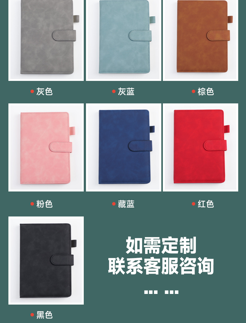 | Colores de la cubierta | A5 rosa/piel suave serie-60,A5 negro/piel suave serie-60,Libro de cuero suave A5 gris/piel-serie 60,Libro de cuero suave A5 azul oscuro/piel-serie 60,A5 rojo grande/piel suave serie-60,Libro de cuero suave A5 marrón/piel-serie 60,A5 azul claro/piel suave serie-60,Caja de regalo de gama alta de negocios A5 personalizada serie-54 |
