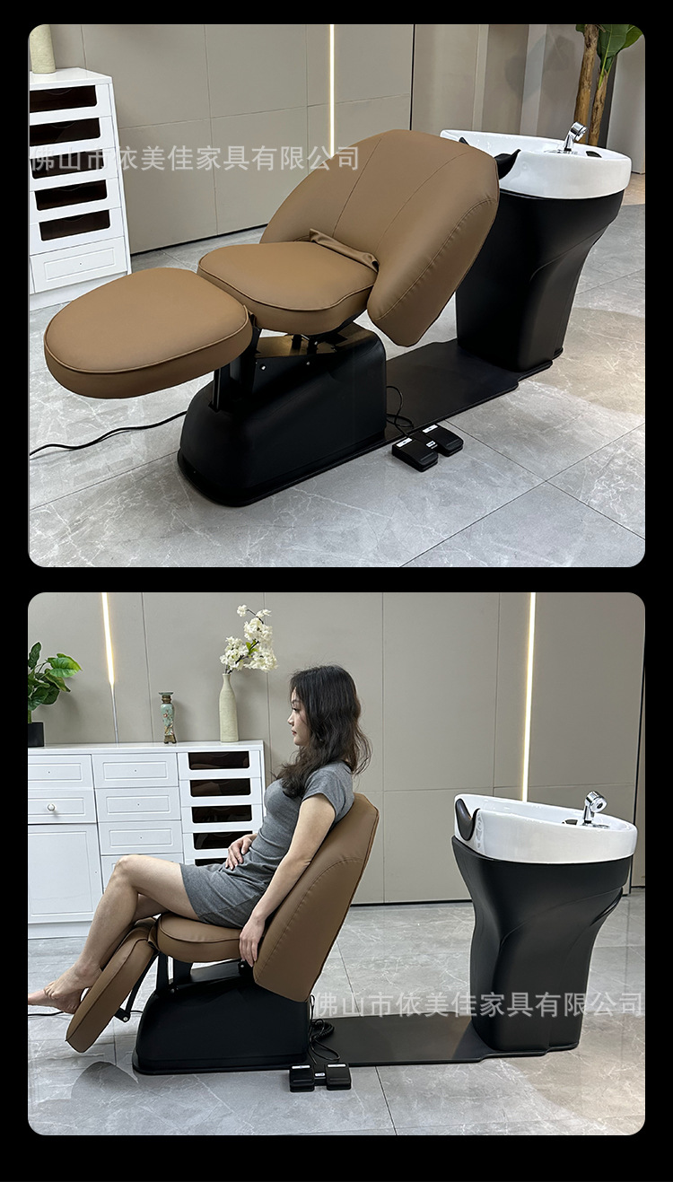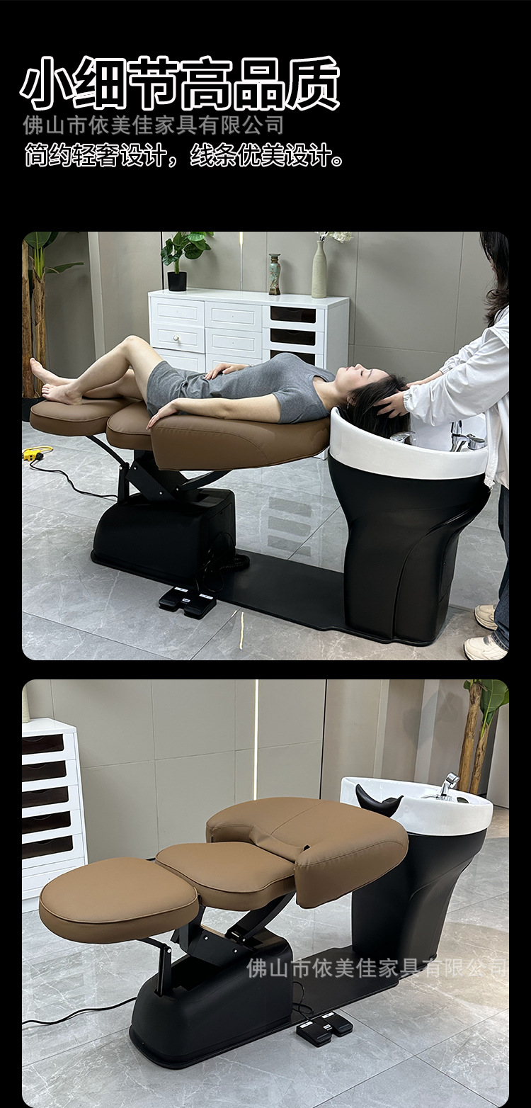 Cama de lavado de cabello eléctrica de lujo, cama de lavado de masaje, asiento ajustable hacia arriba y hacia abajo, cama cerámica de tratamiento de cabello con control de pies