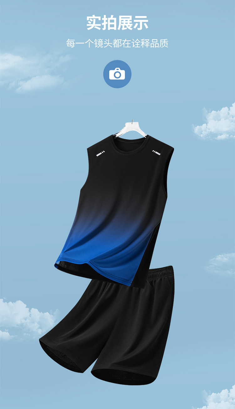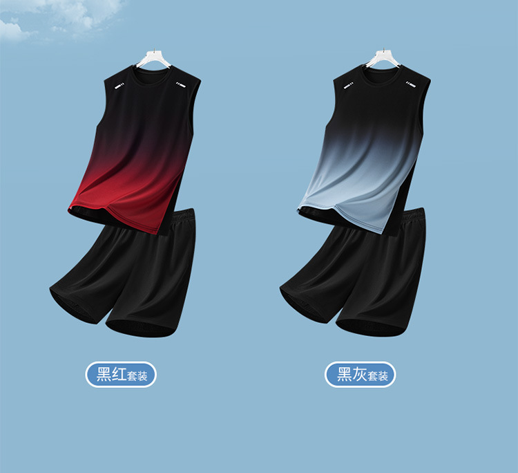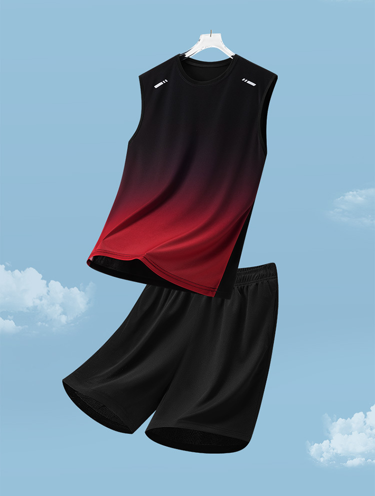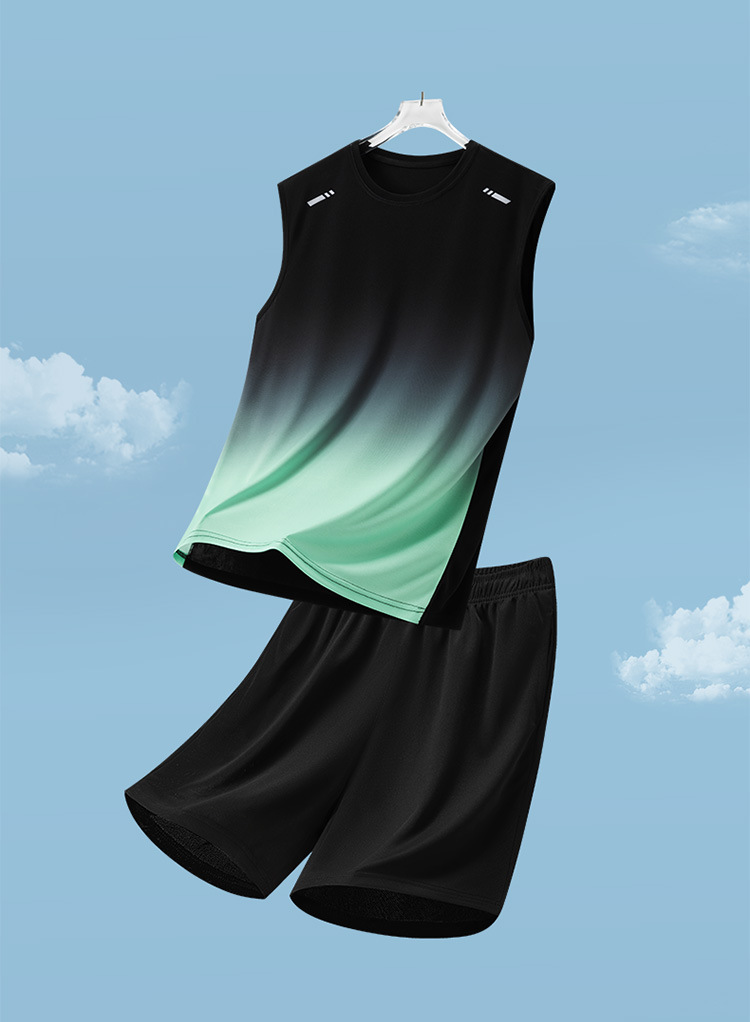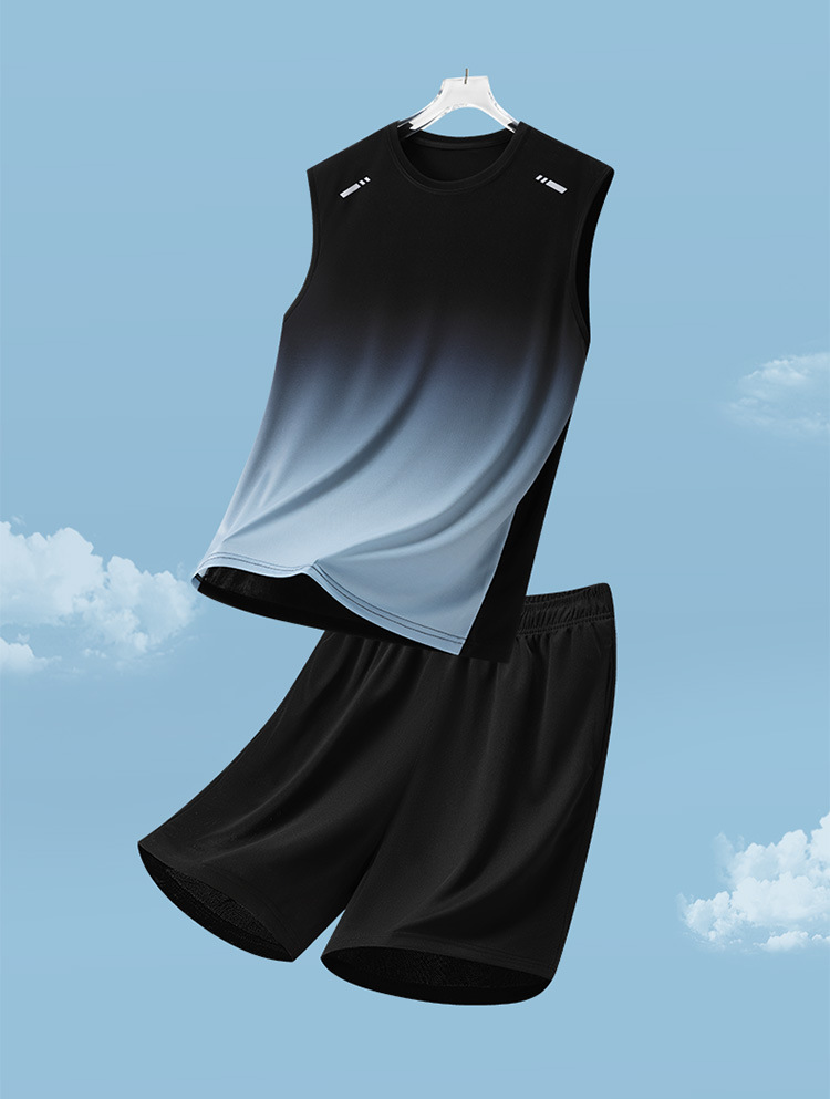 Traje deportivo para hombres, traje casual para hombres de verano, pantalones cortos de chaleco de secado rápido transpirables de dos piezas sueltos con gradiente impreso para hombres