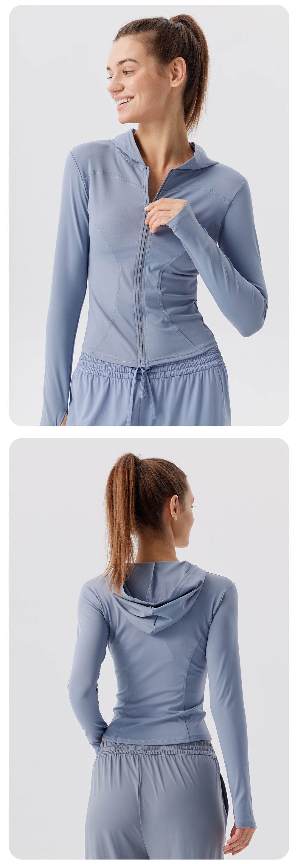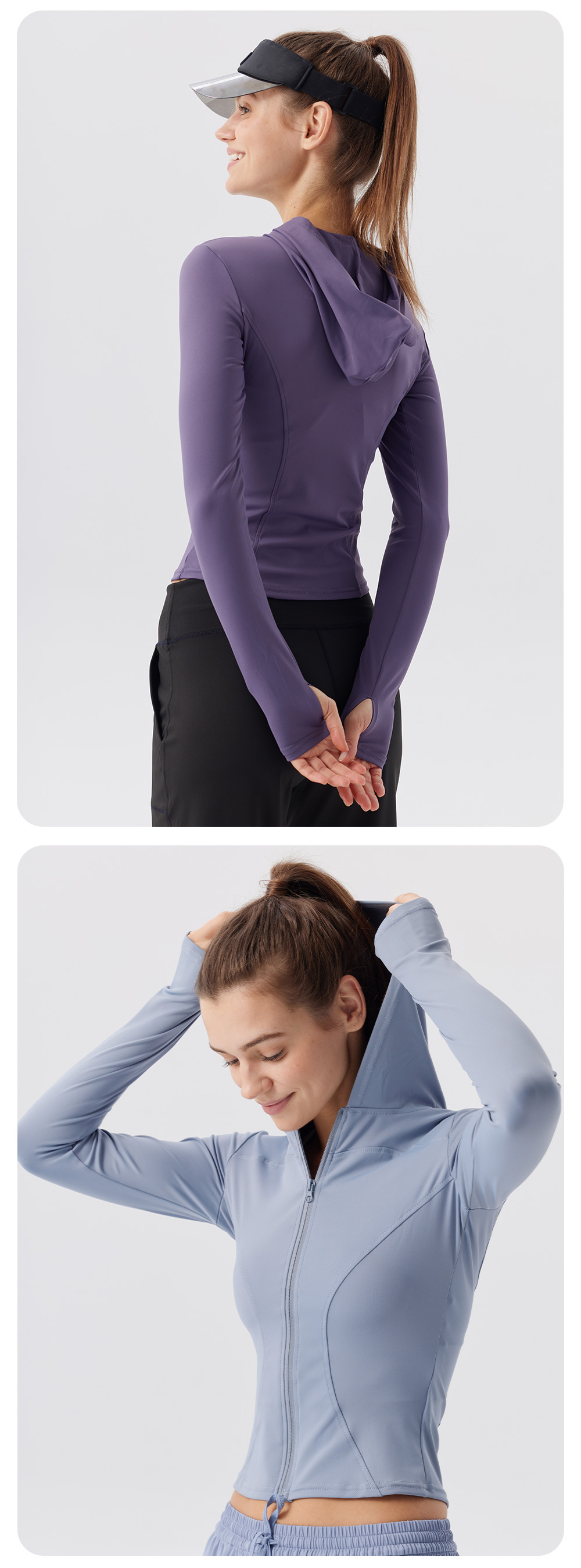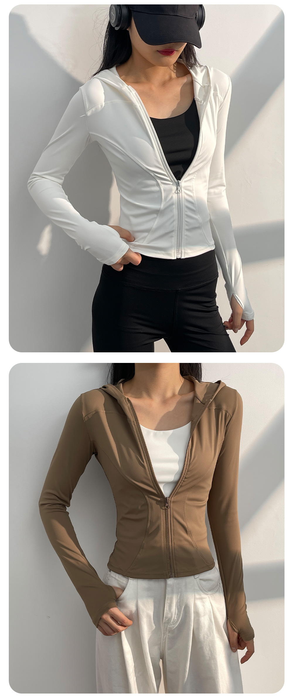 Ropa de yoga con capucha para mujer, ajuste ajustado, cintura delgada, camisa deportiva, entrenamiento para correr, chaqueta de fitness Pilates, ropa de ciclismo