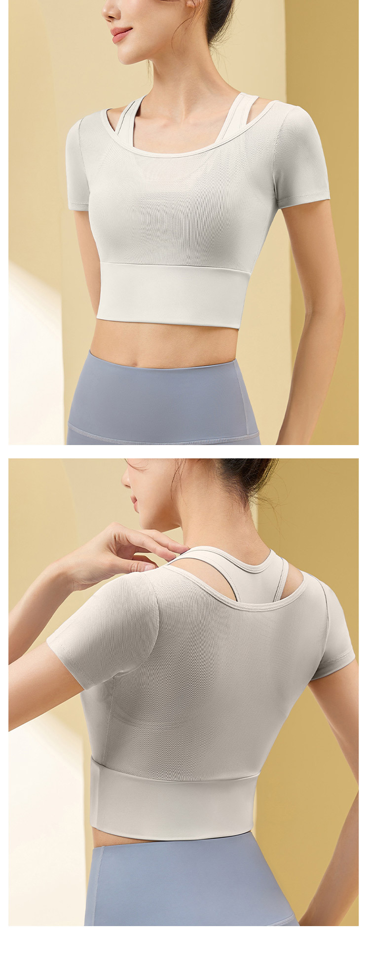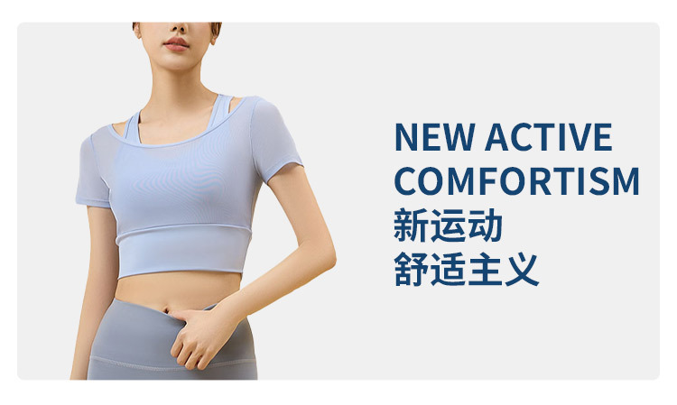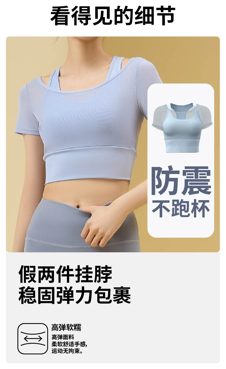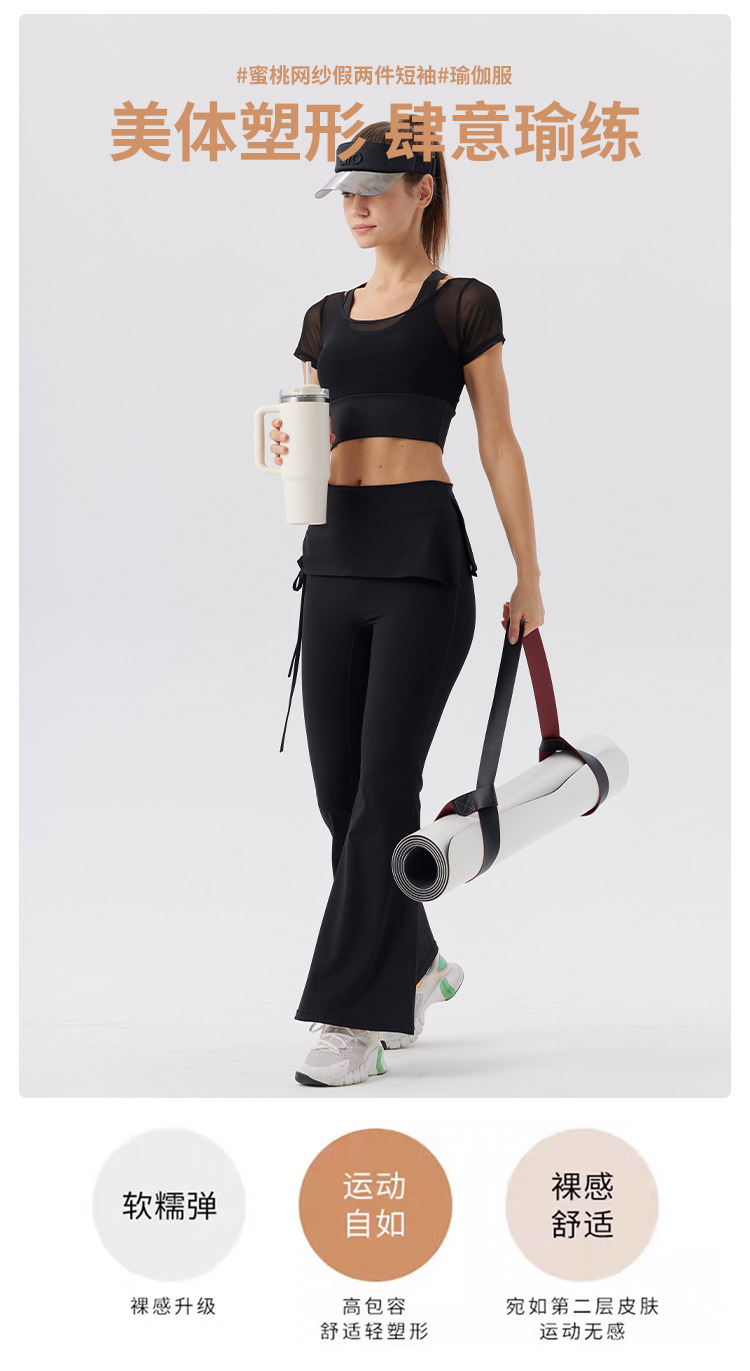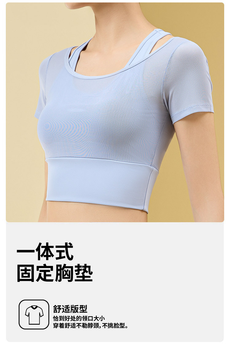 Ropa de yoga de temperamento de hilo de red, ropa de gimnasia deportiva nueva para mujer, entrenamiento de Pilates, manga corta falsa de dos piezas