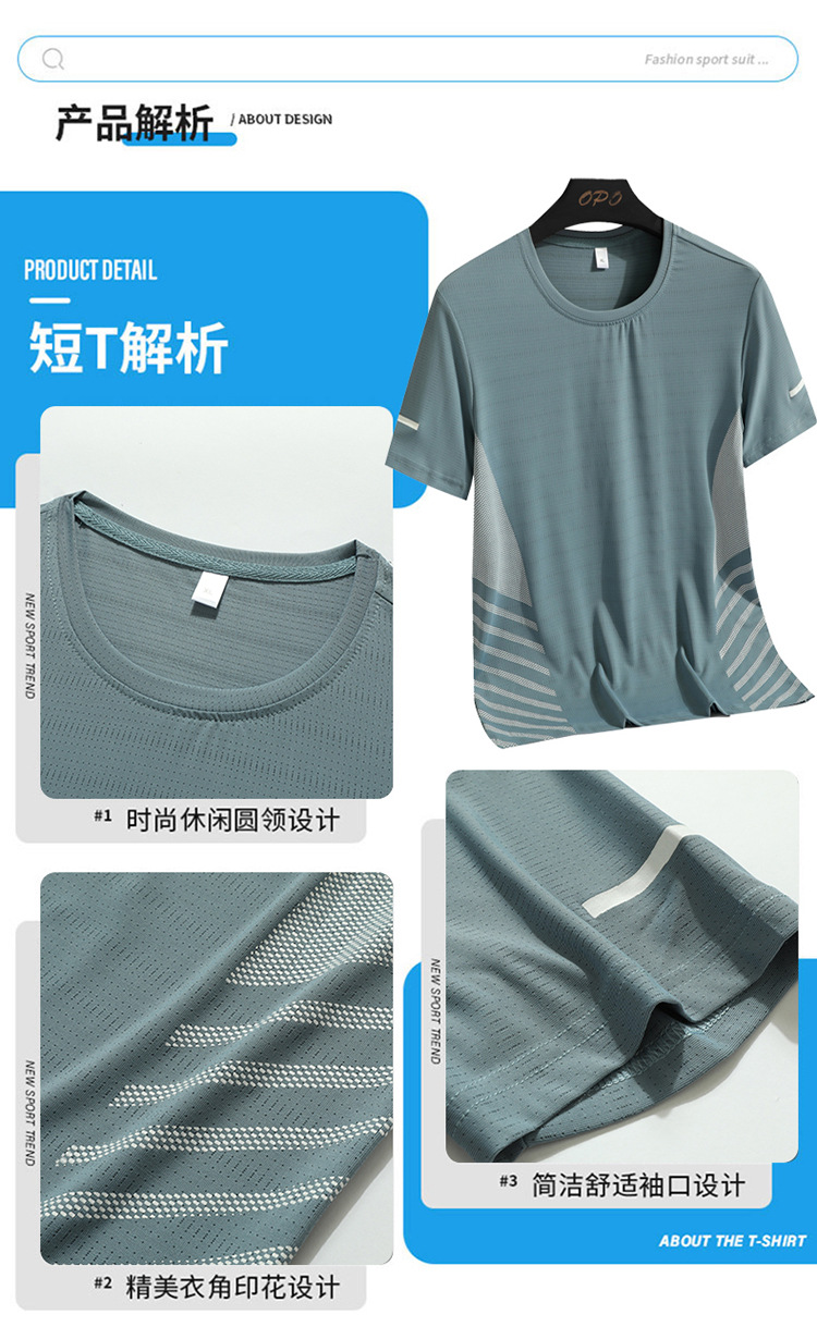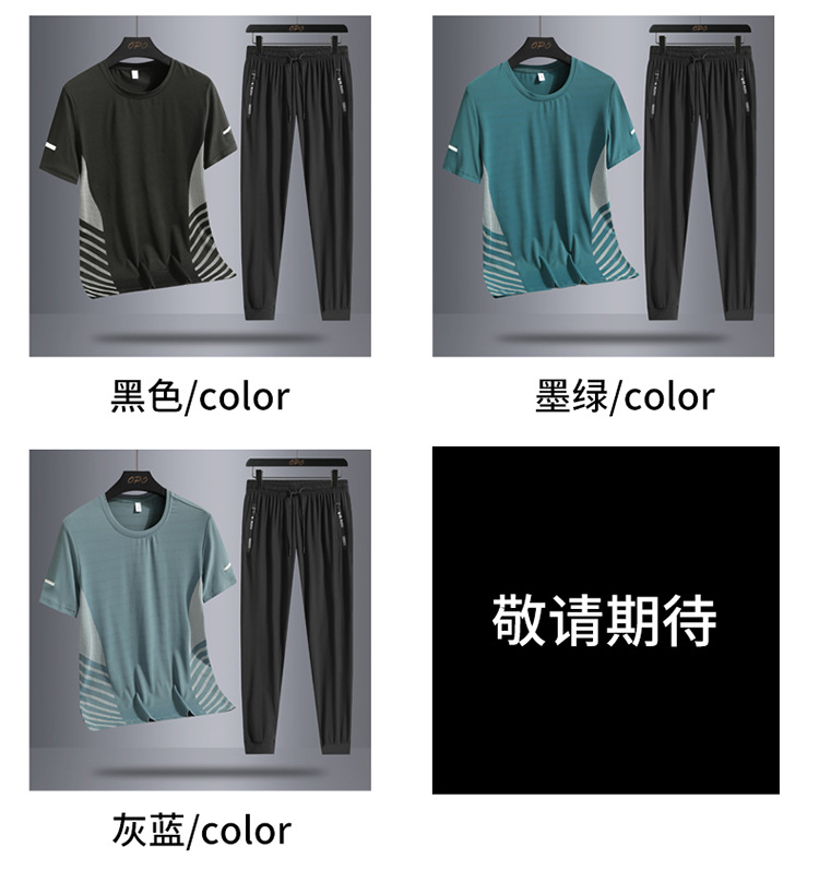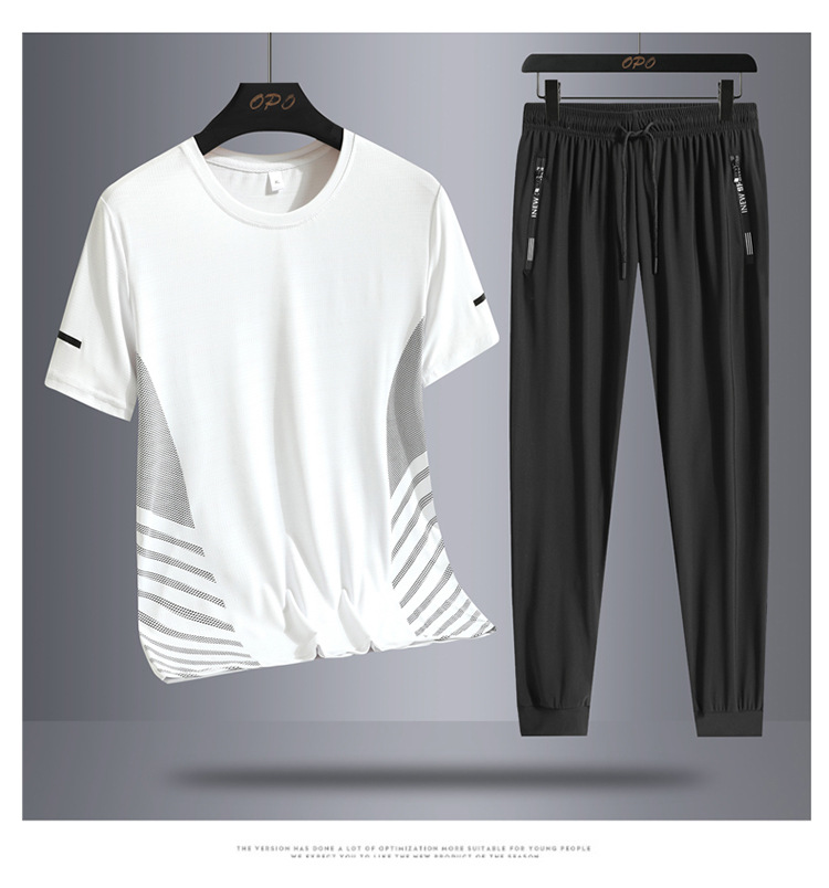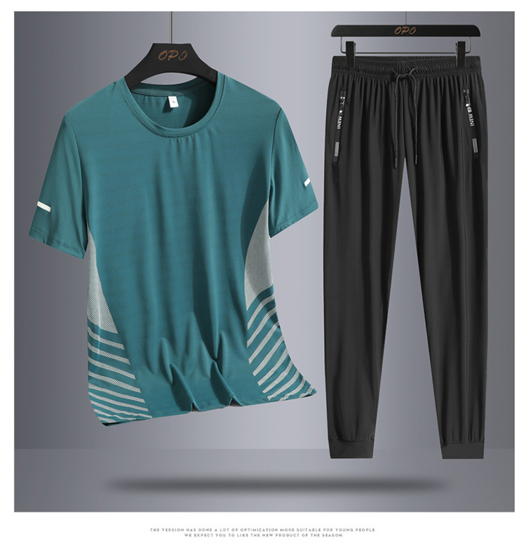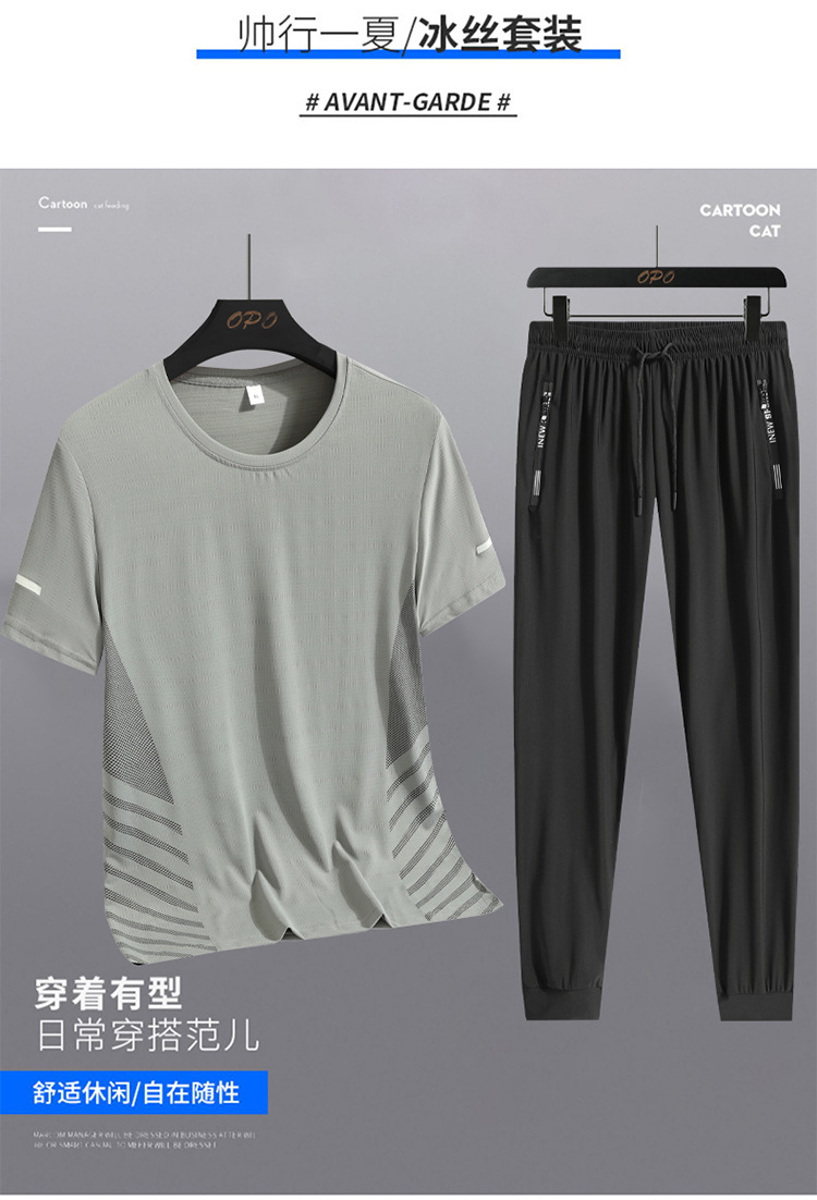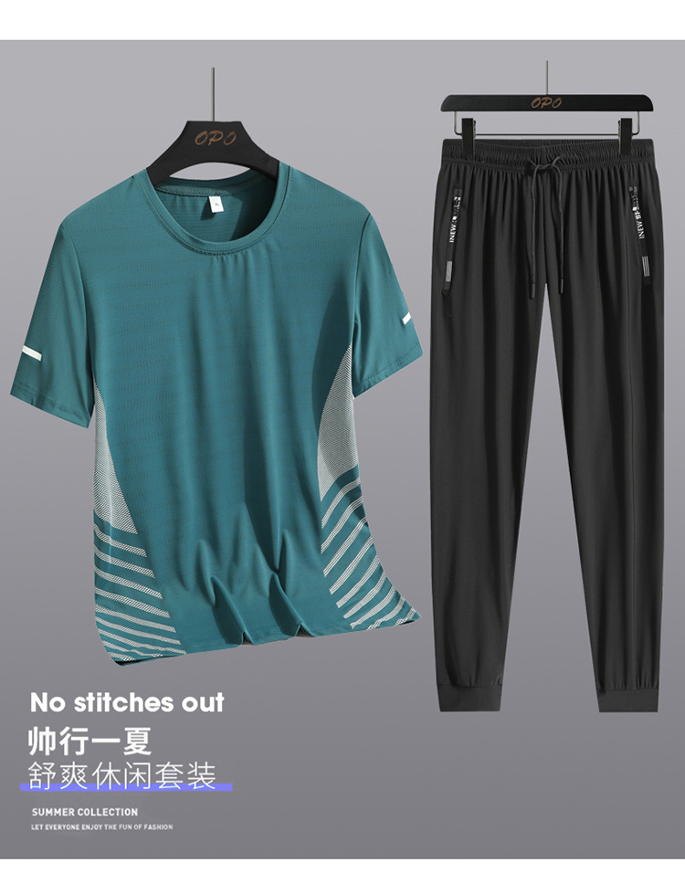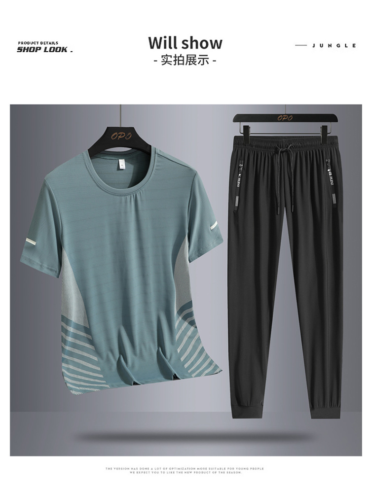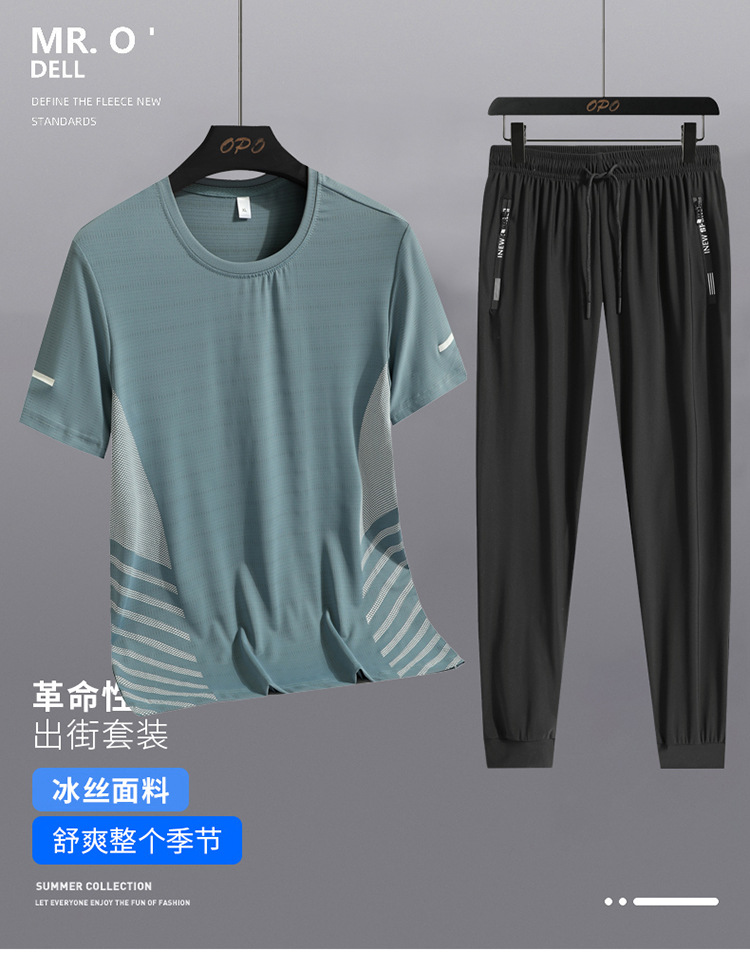 Hombre de verano helado juego deportivo casual hombre al aire libre suelto juego de dos piezas secado rápido transpirable cuello redondo camiseta pantalón largo