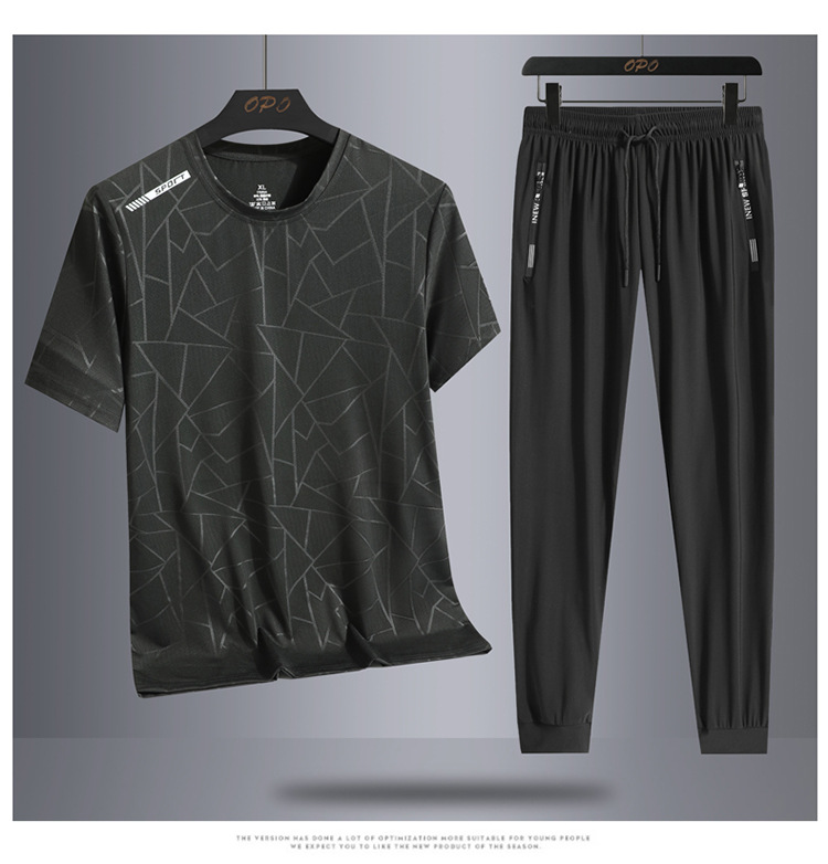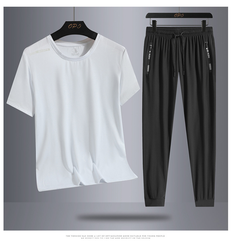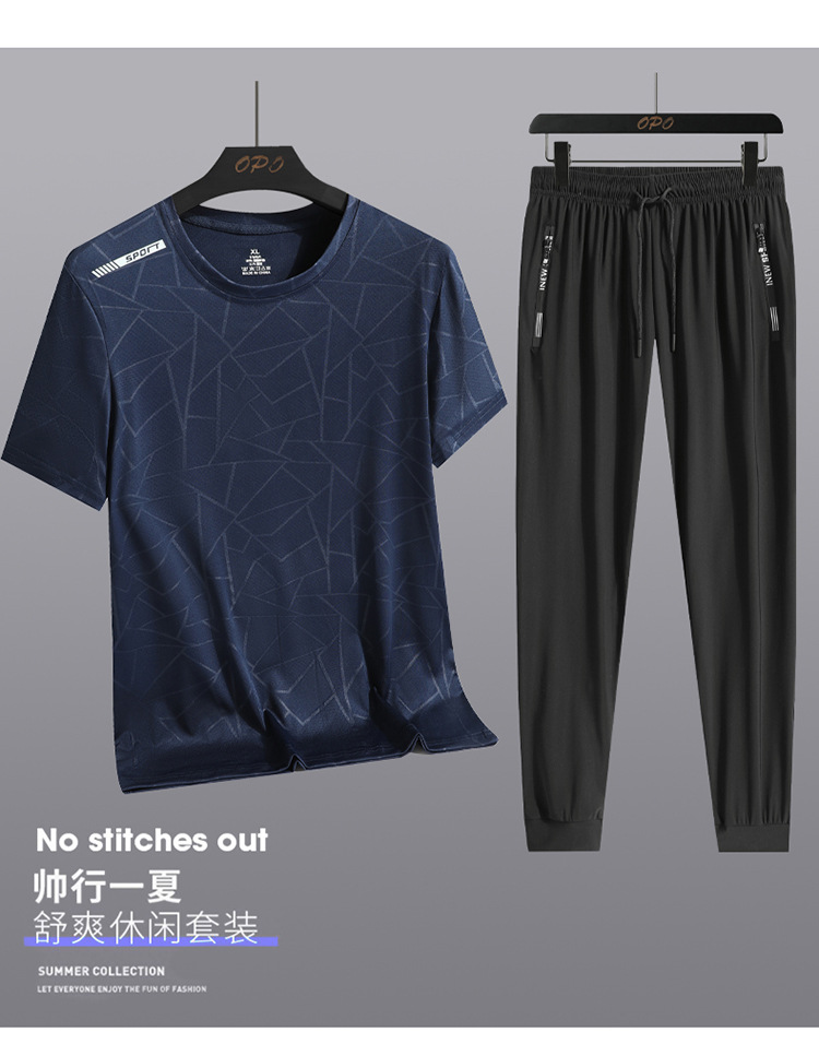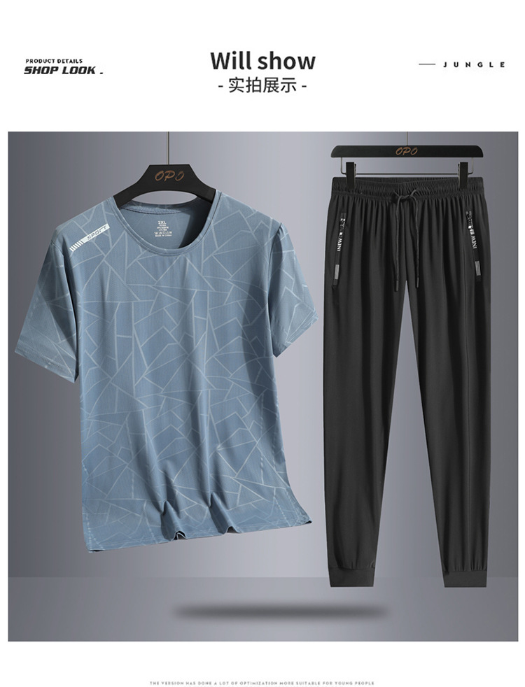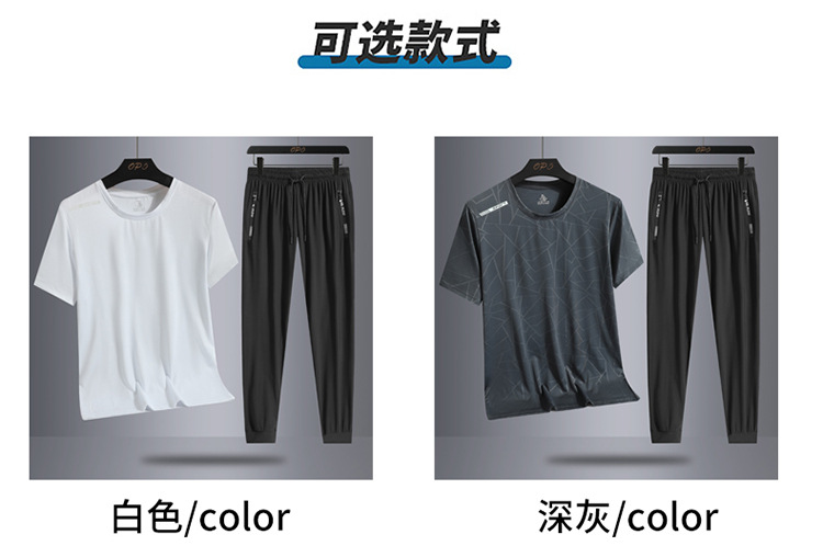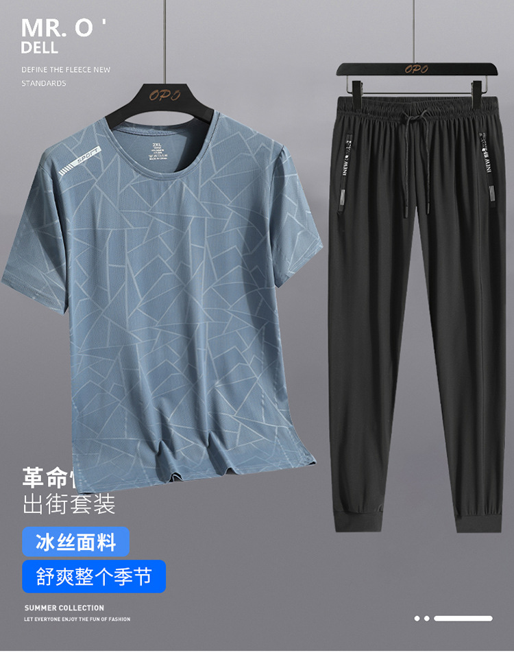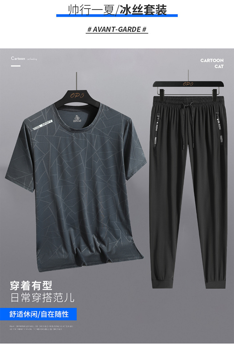 Traje de ocio de seda de hielo de verano para hombres, deportes al aire libre, hombres sueltos, pantalones de camiseta de cuello redondo de secado rápido transpirable de dos piezas