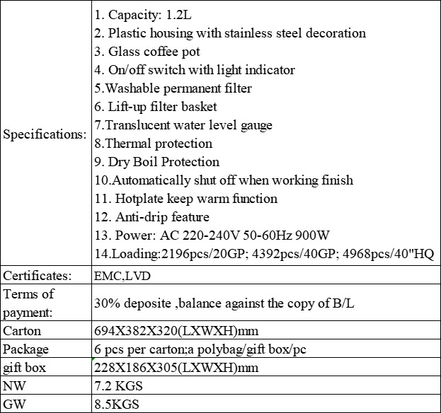 Cafetera doméstica de 1.2 litros, estilo americano, de goteo, pequeña, de vidrio, eléctrica, estilo ins.