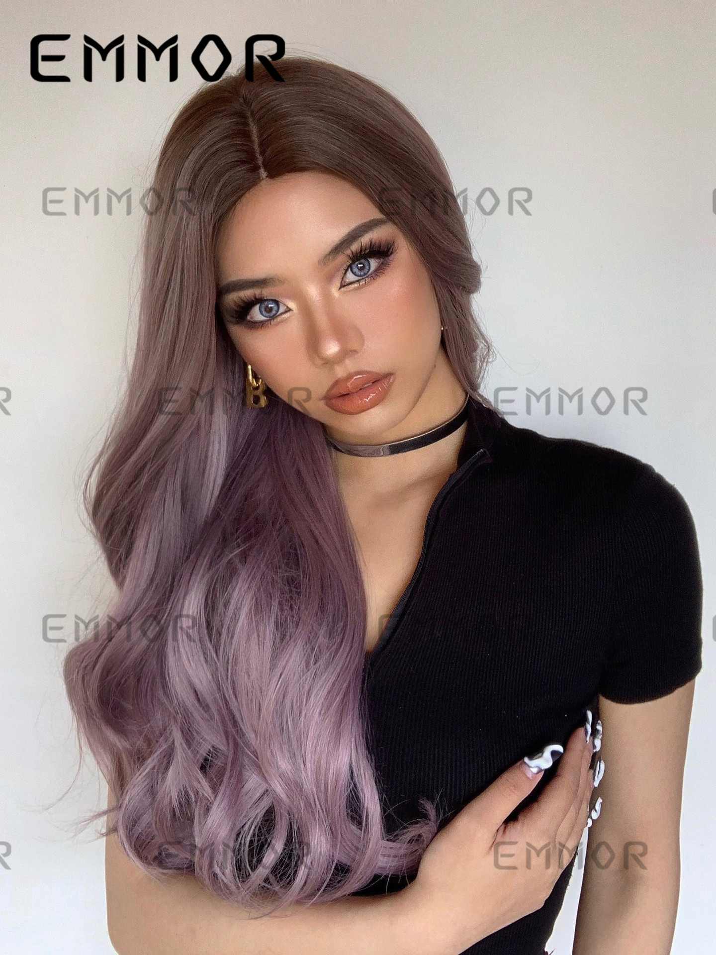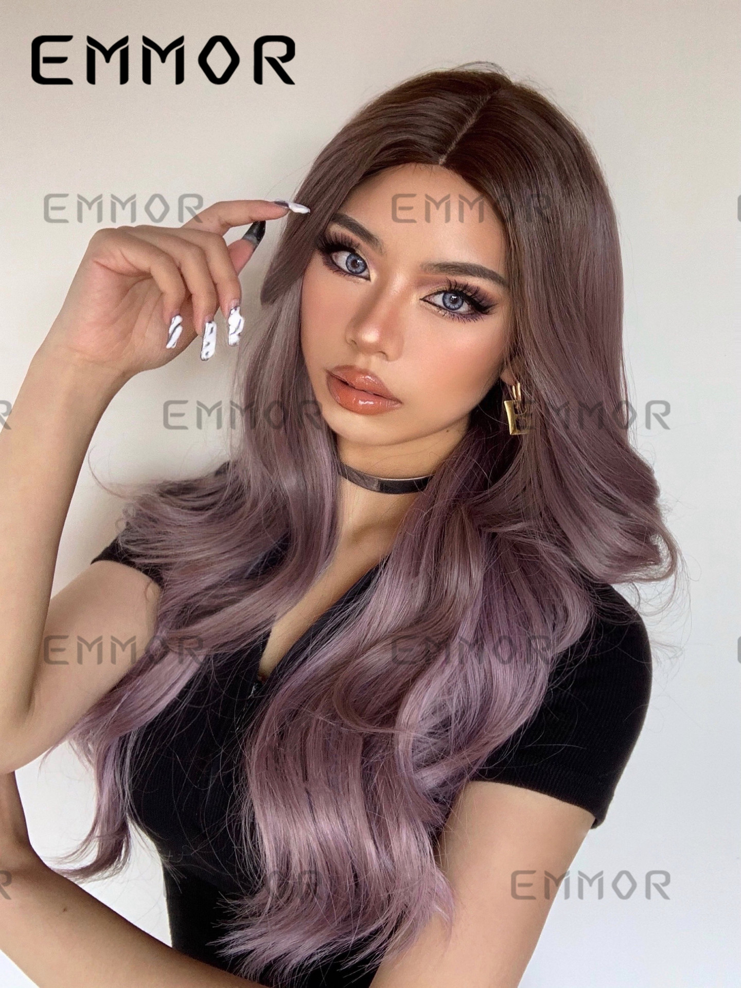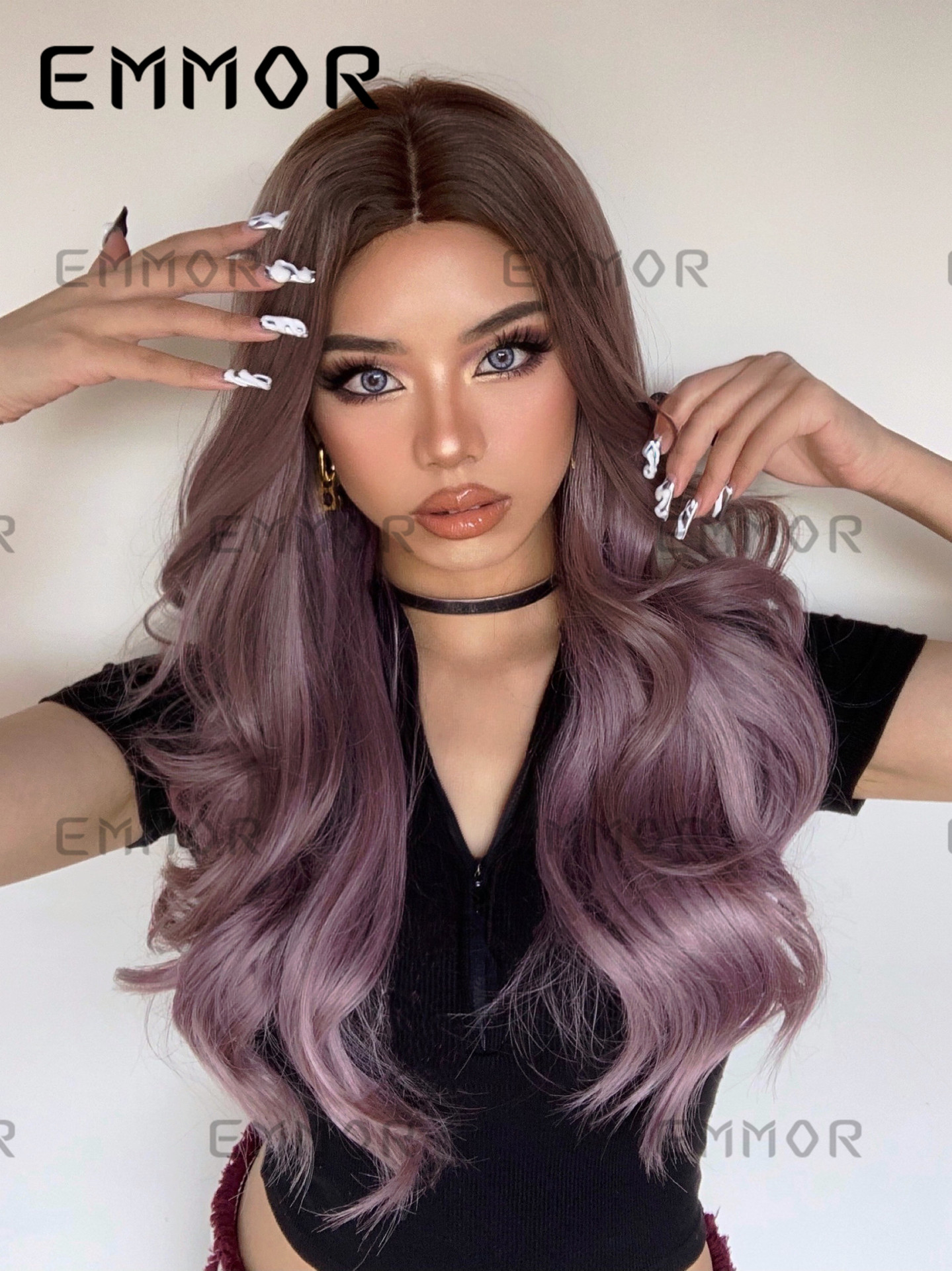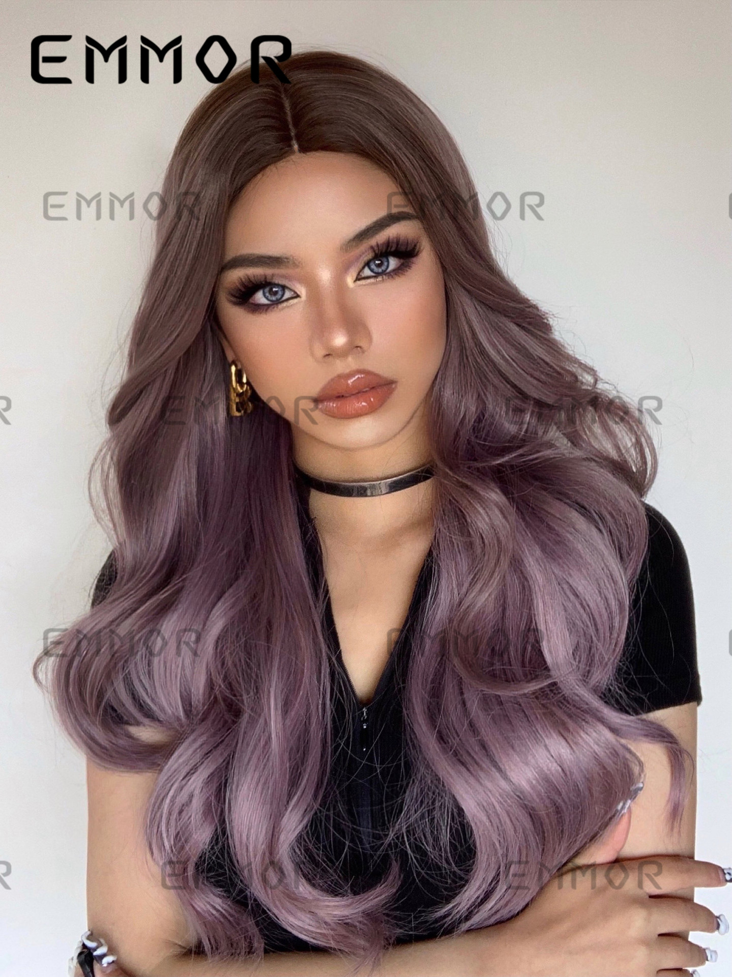 Nuevo elegante medio grande onda largo pelo rizado gradiente dorado púrpura marrón multicolor opcional europeo y americano peluca para mujeres