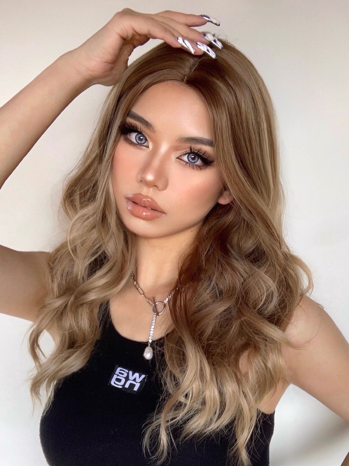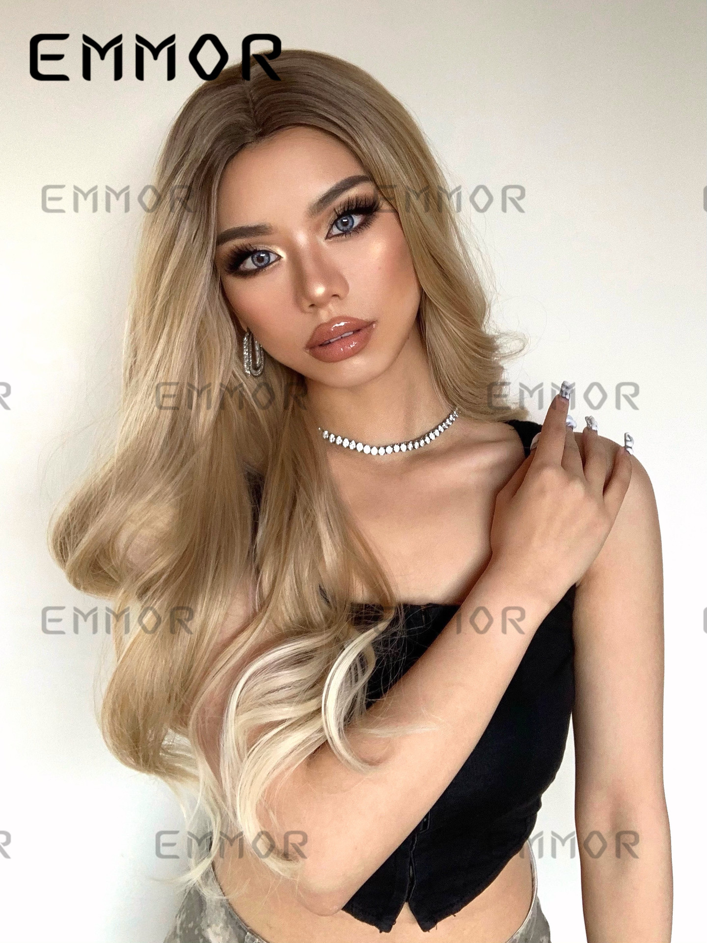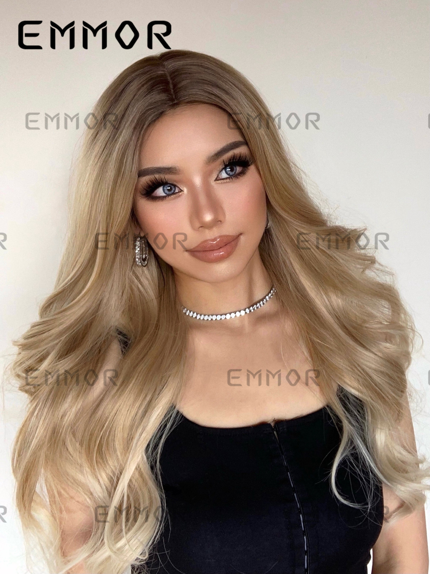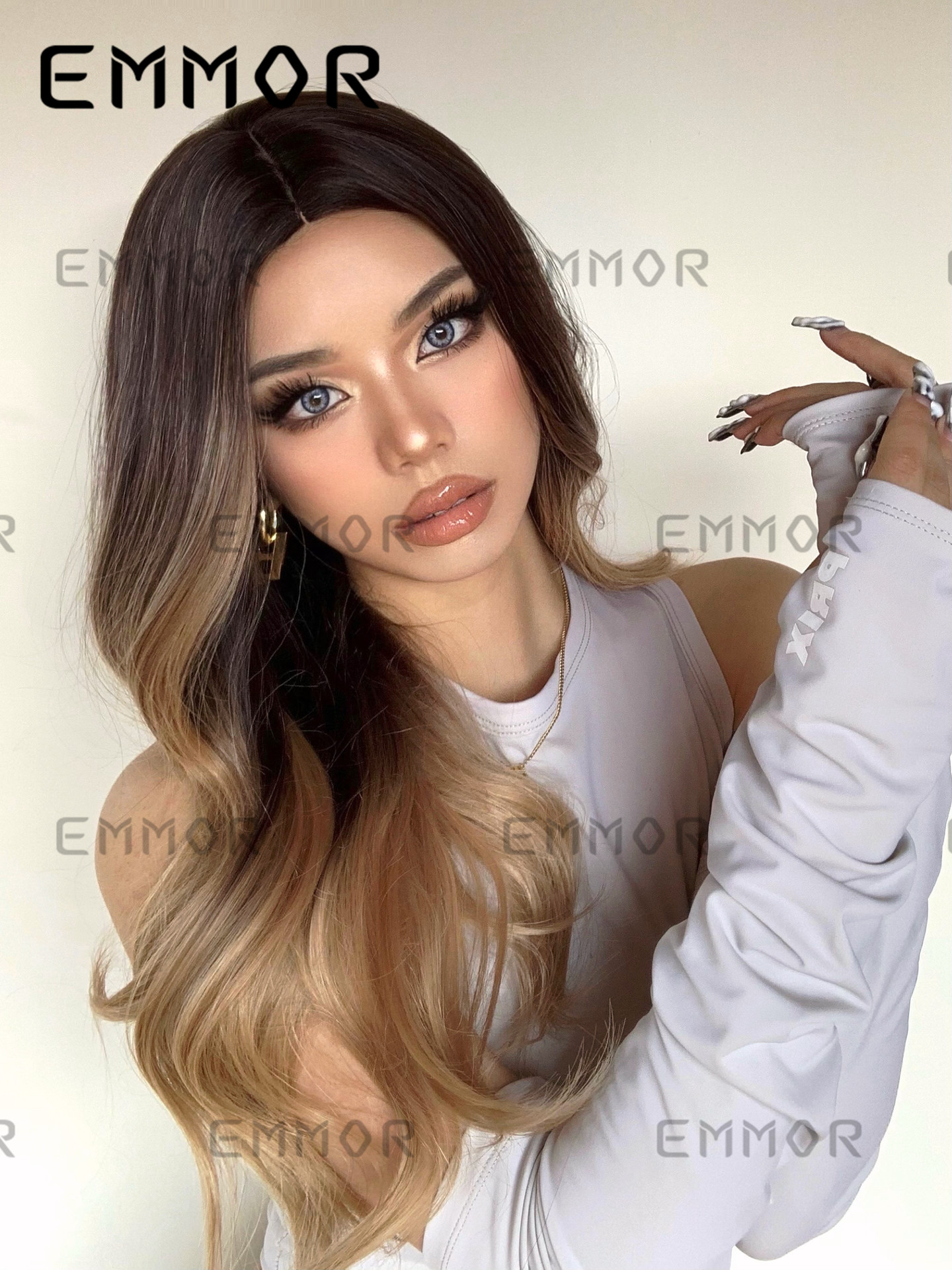 Nuevo elegante medio grande onda largo pelo rizado gradiente dorado púrpura marrón multicolor opcional europeo y americano peluca para mujeres