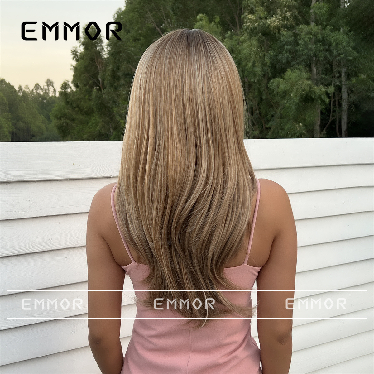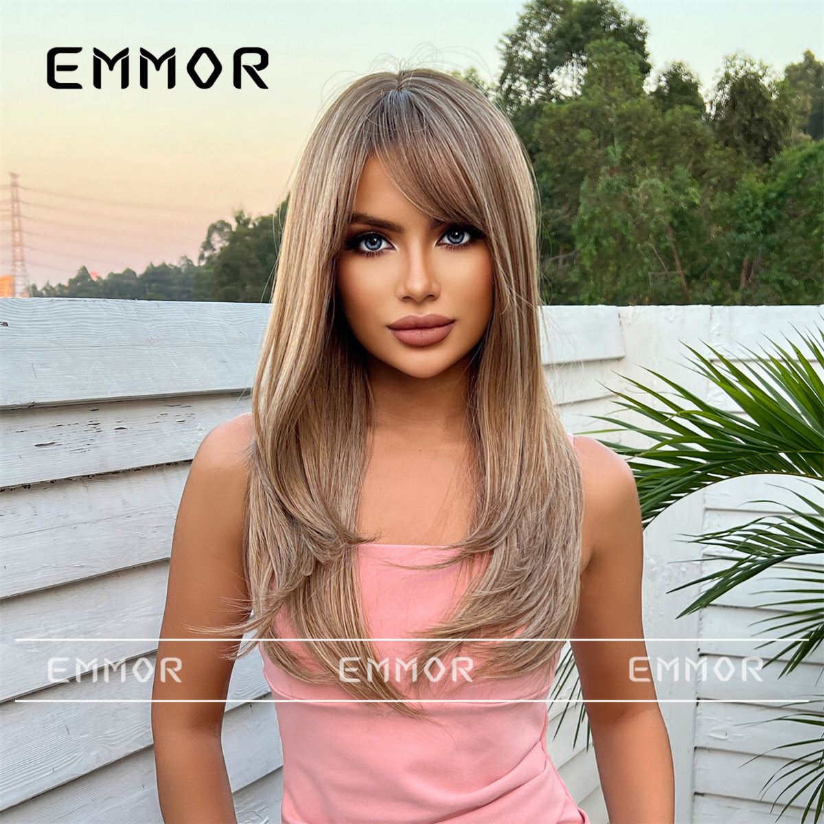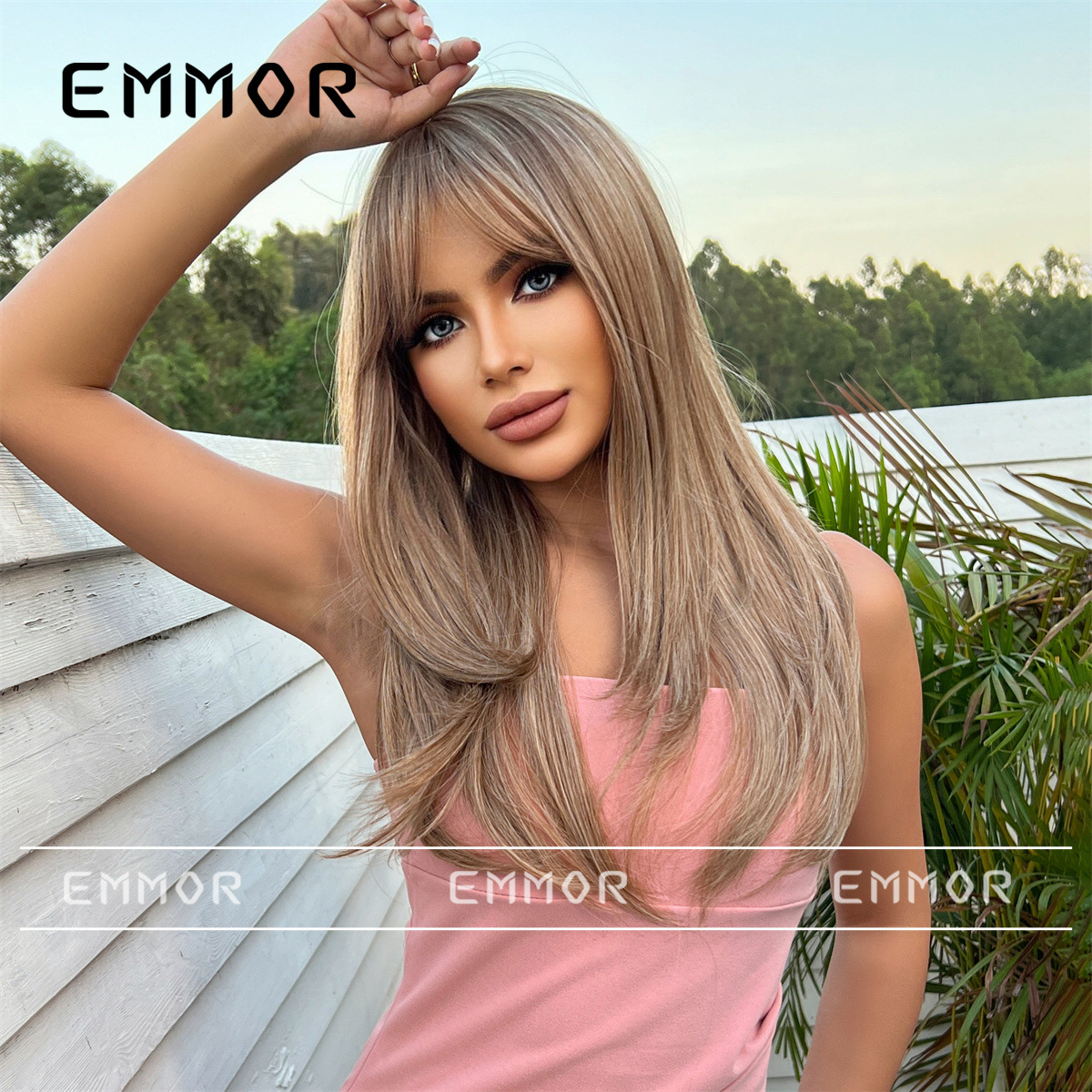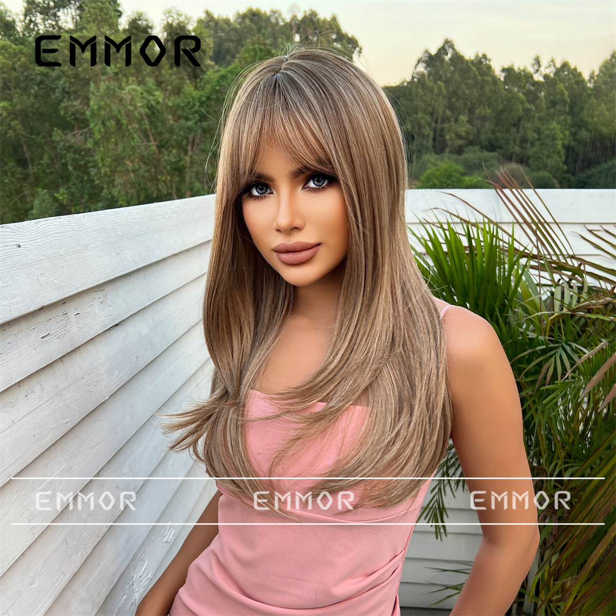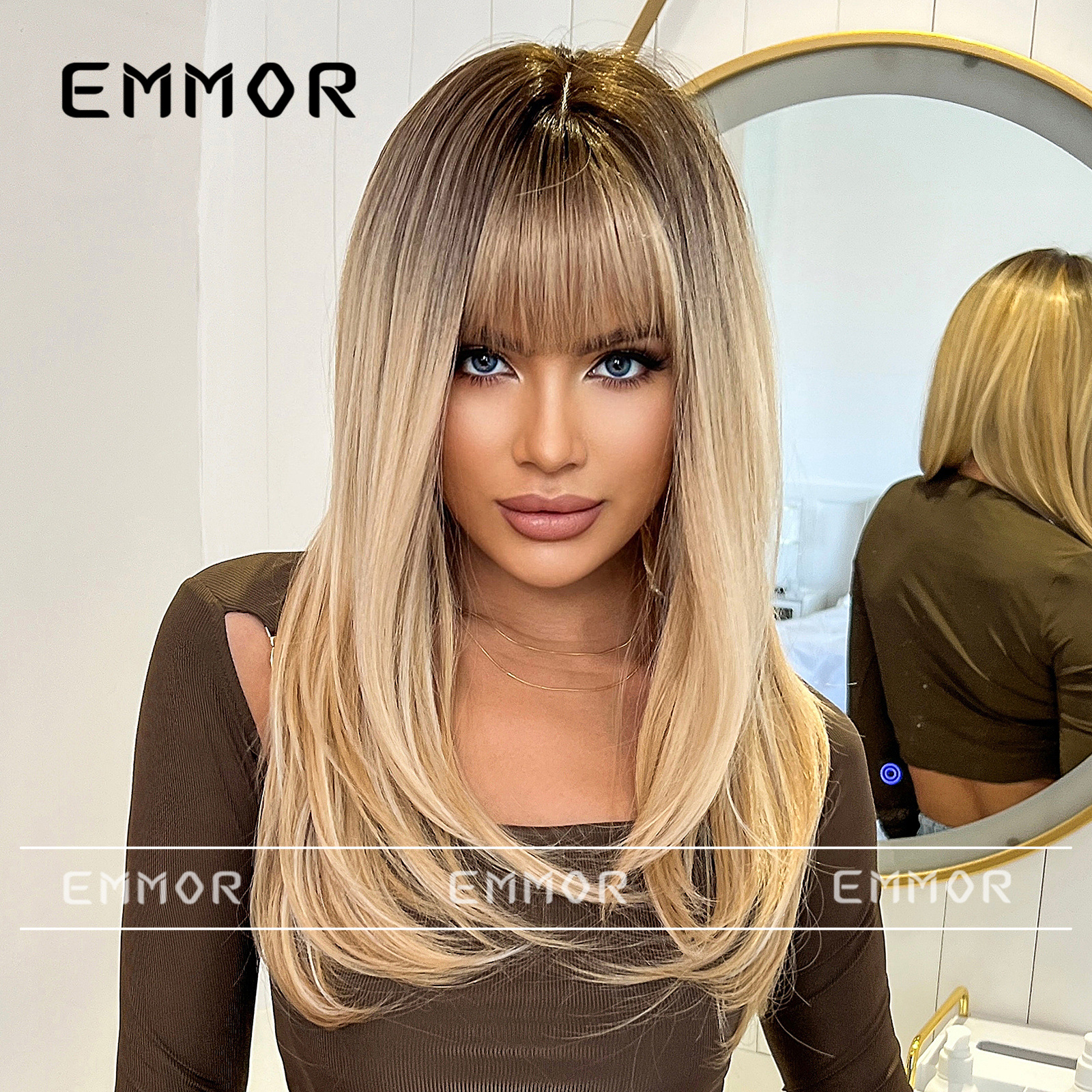 Peluca de venta caliente transfronteriza de Amazon, marrón degradado femenino, cabello largo y rizado con flequillo, juego de peluca de moda de celebridades de Internet europeas y americanas