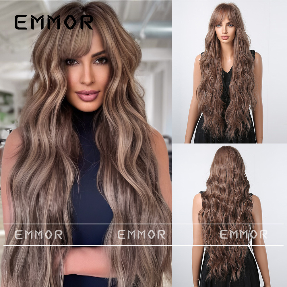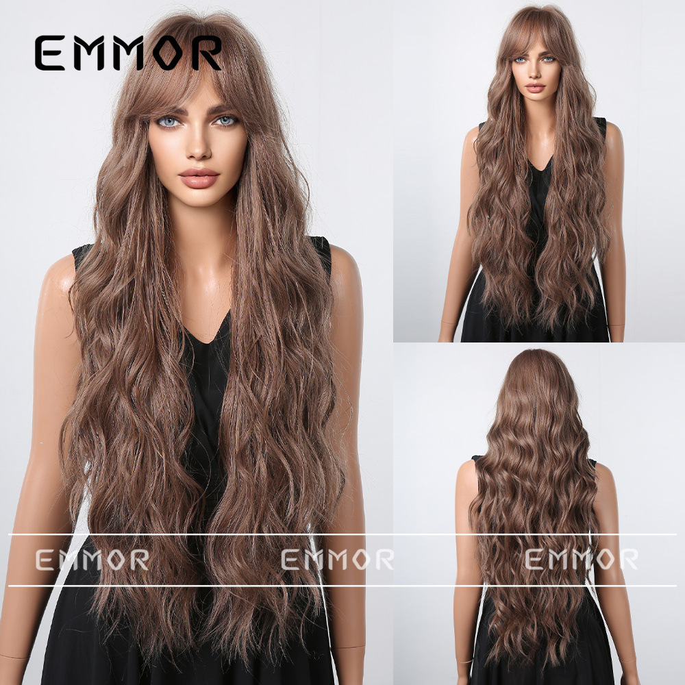 Celebridad de Internet transmisión en vivo Pelo Largo ocho palabras Bangs estilo europeo y americano marrón largo pelo rizado Big Wave simulación completa cabeza cubierta peluca para mujeres