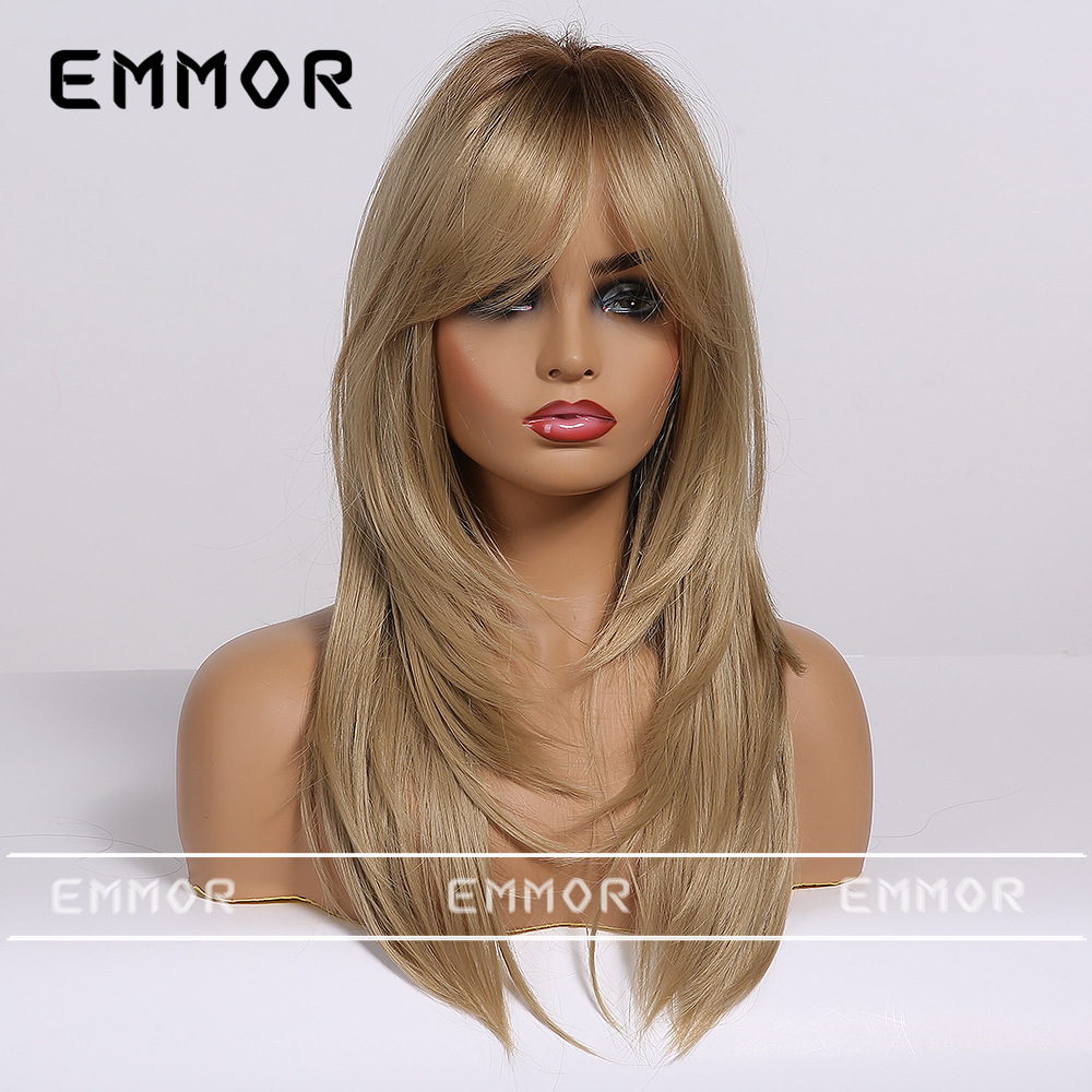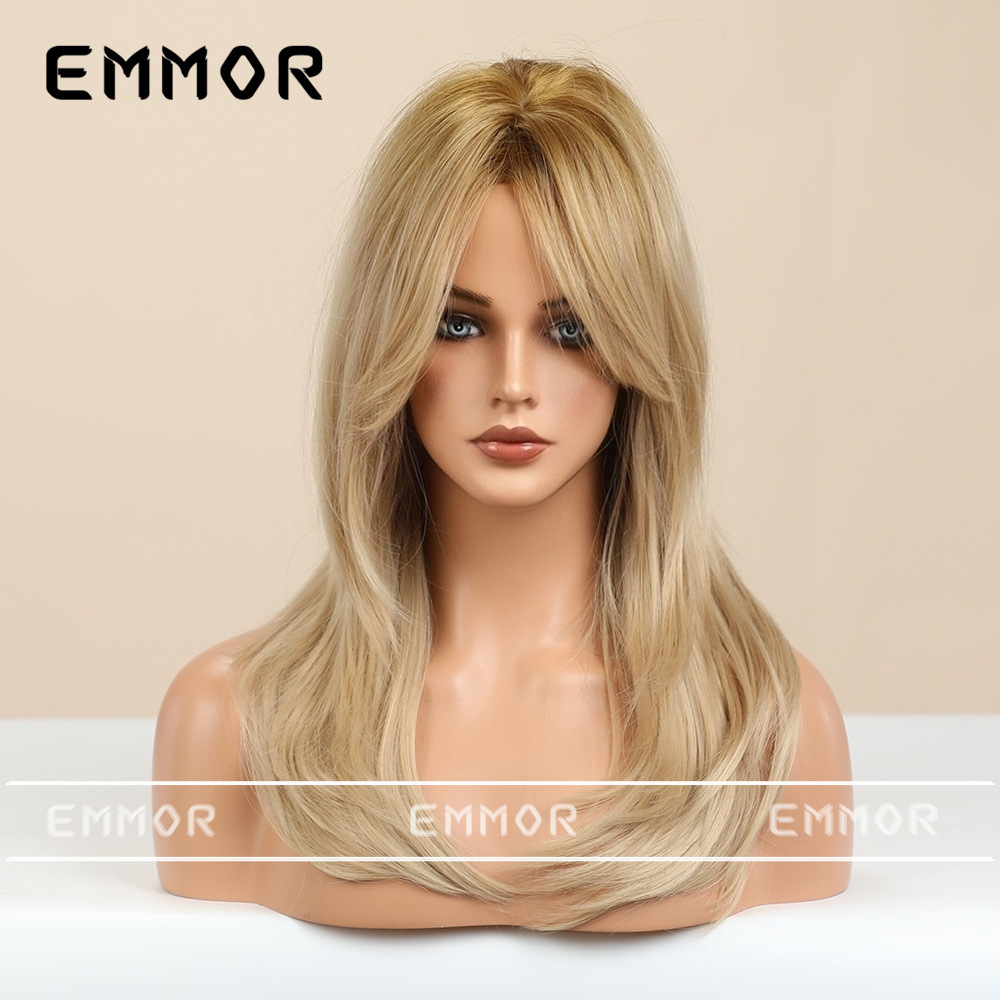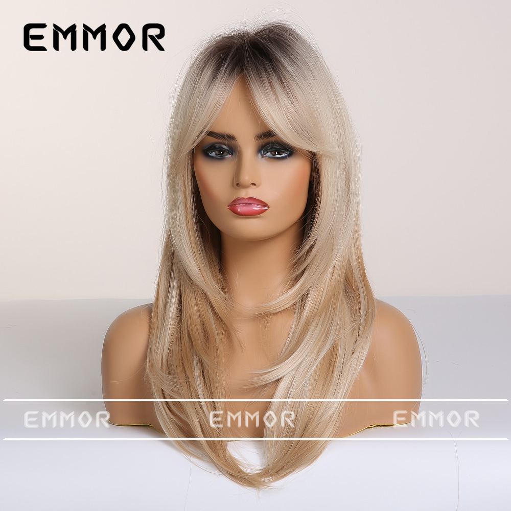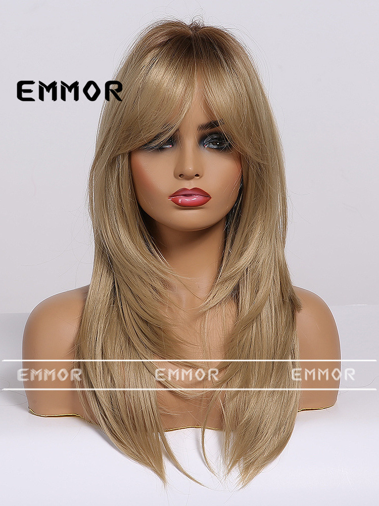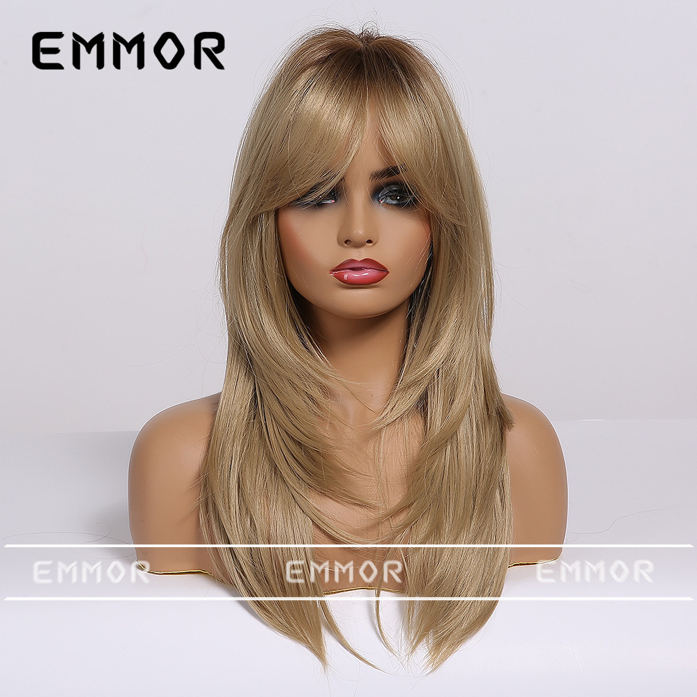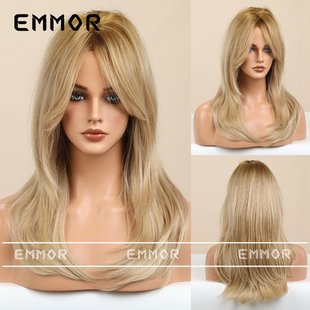 Peluca de mujer europea y americana Emmor flequillo de ocho caracteres Gradiente dorado pelo de longitud media cola peluca rizada multicolor opcional