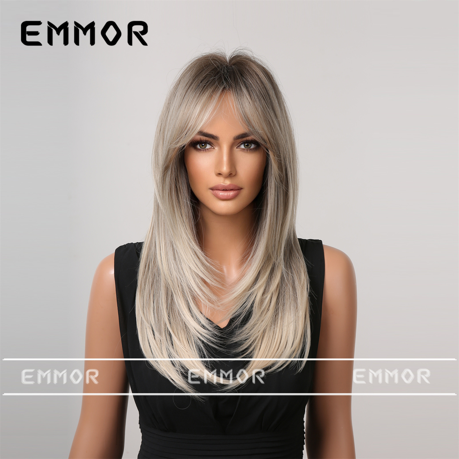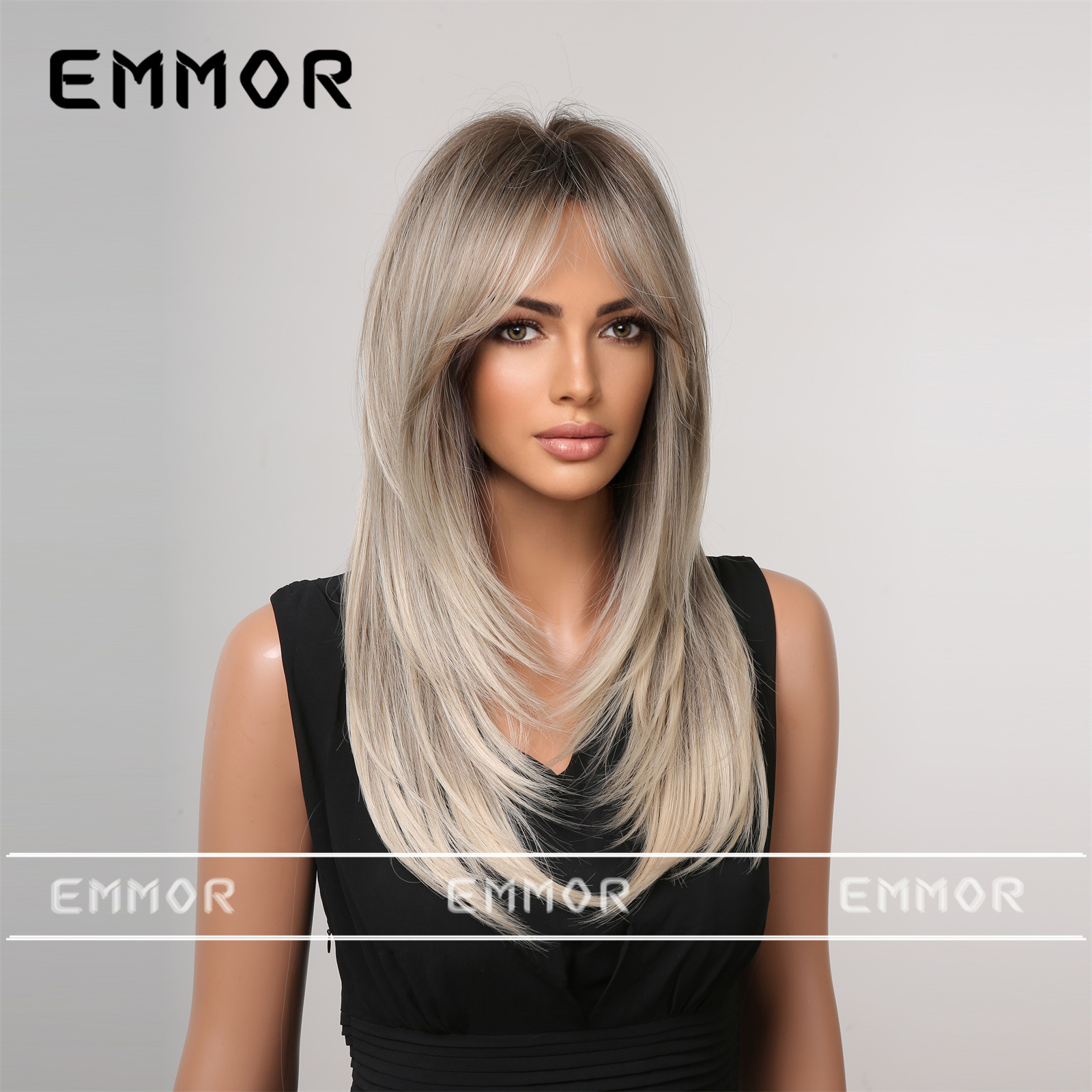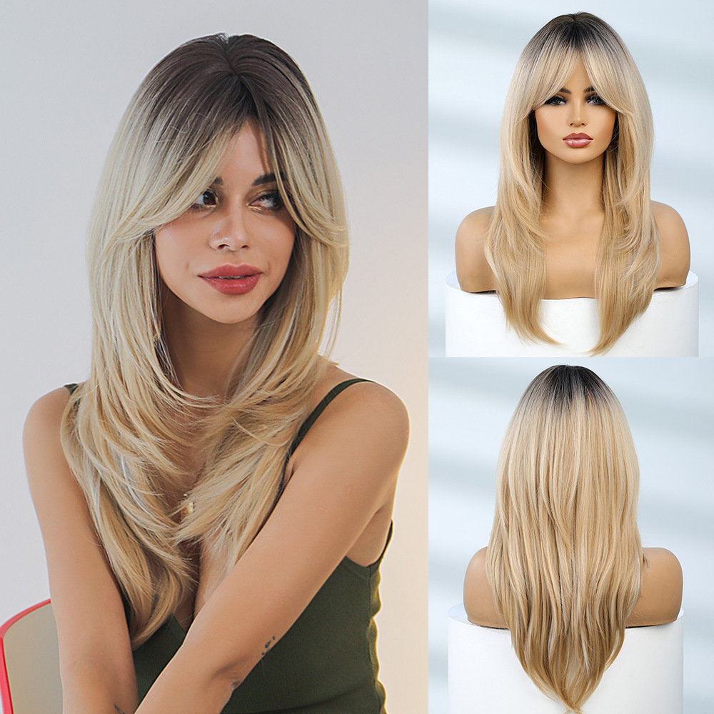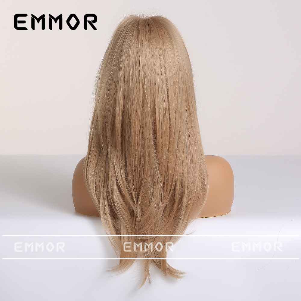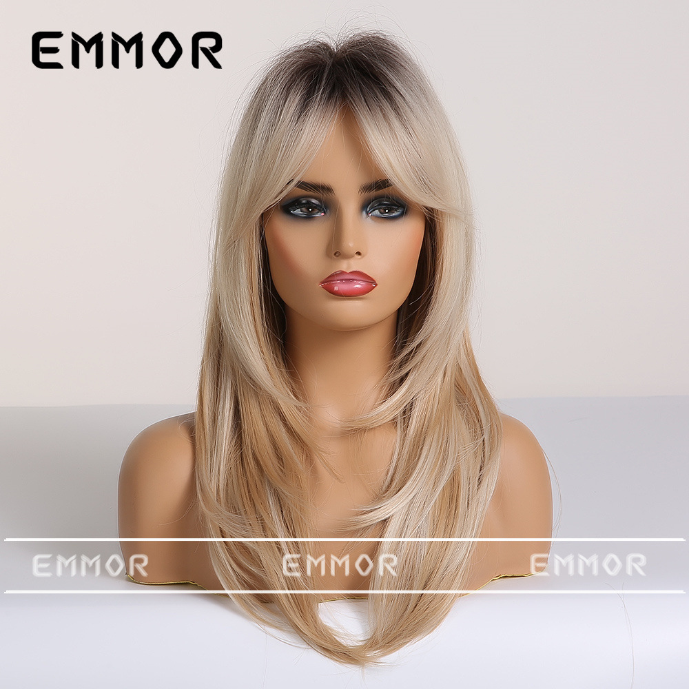 Peluca de mujer europea y americana Emmor flequillo de ocho caracteres Gradiente dorado pelo de longitud media cola peluca rizada multicolor opcional