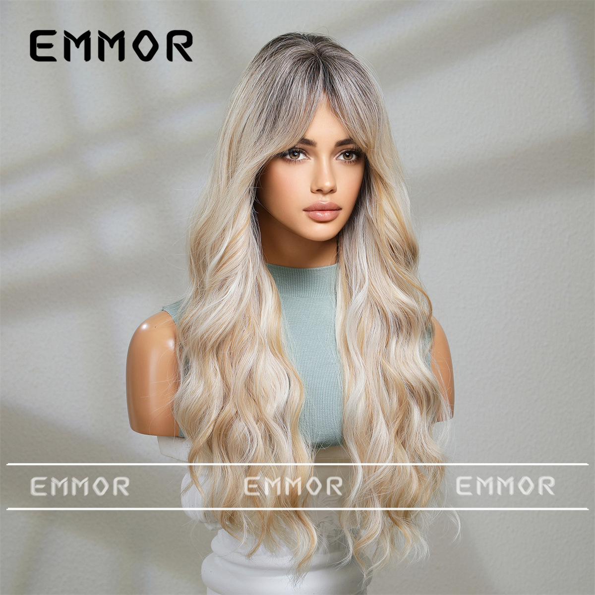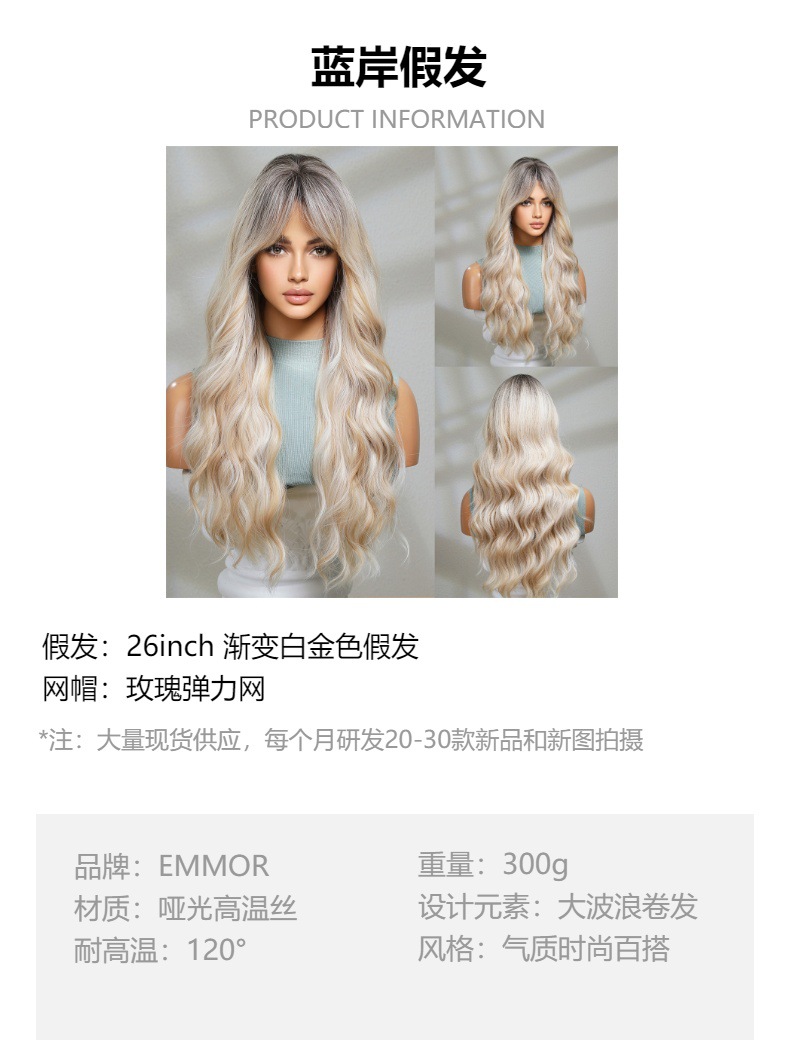 Comercio exterior europeo y americano gradiente oro blanco flequillo de ocho caracteres Pelo Rizado largo moda elegante Peluca de seda de alta temperatura cubierta de la cabeza completa femenina