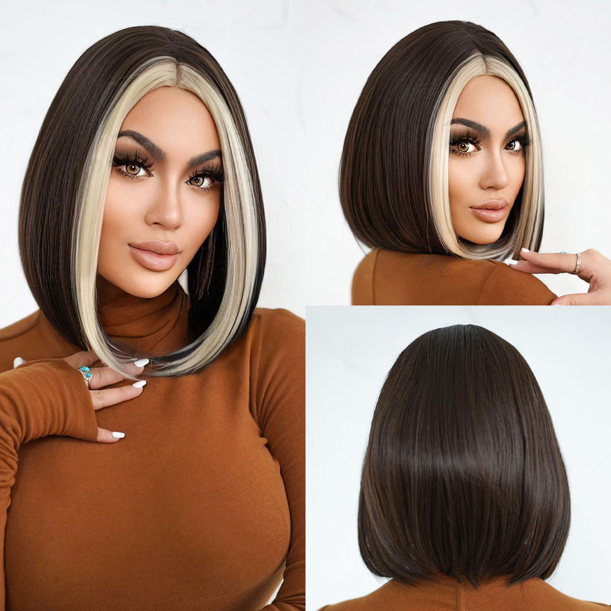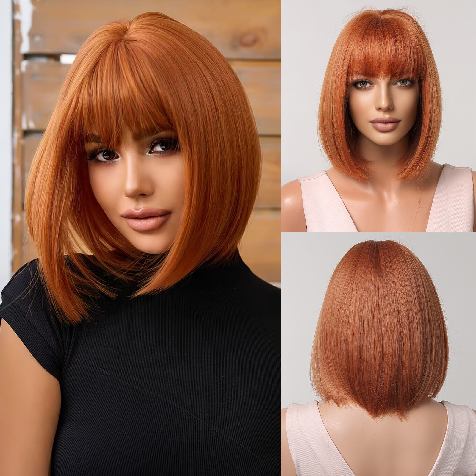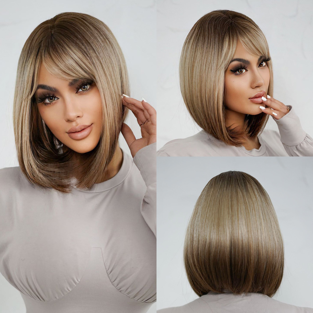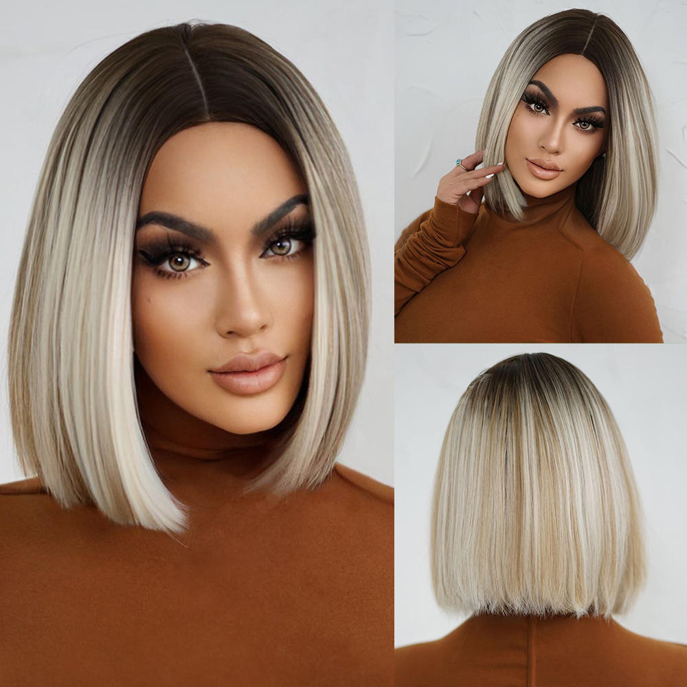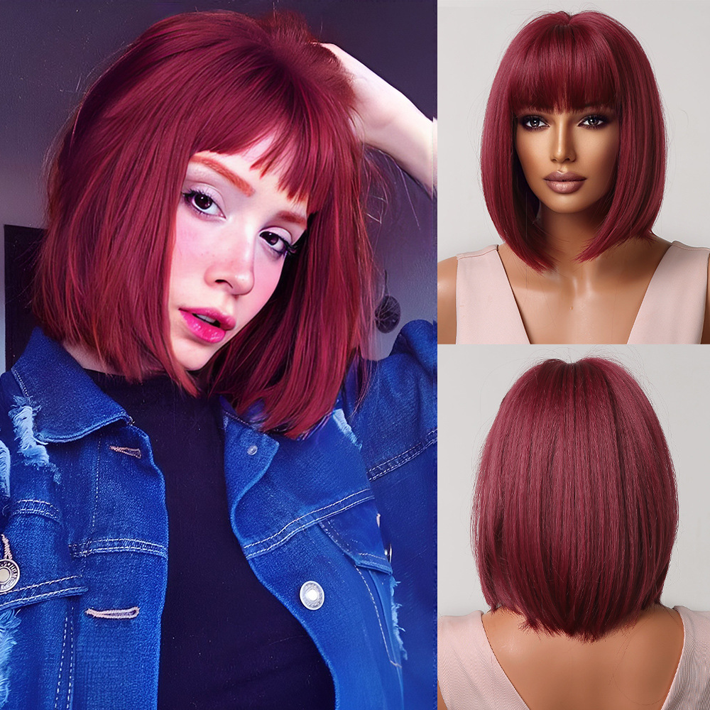 Peluca de las mujeres de alta temperatura de seda de pelo corto verano color natural cabeza de Bobo temperamento reducción de edad flequillo pelo corto recto peluca cubierta de la cabeza