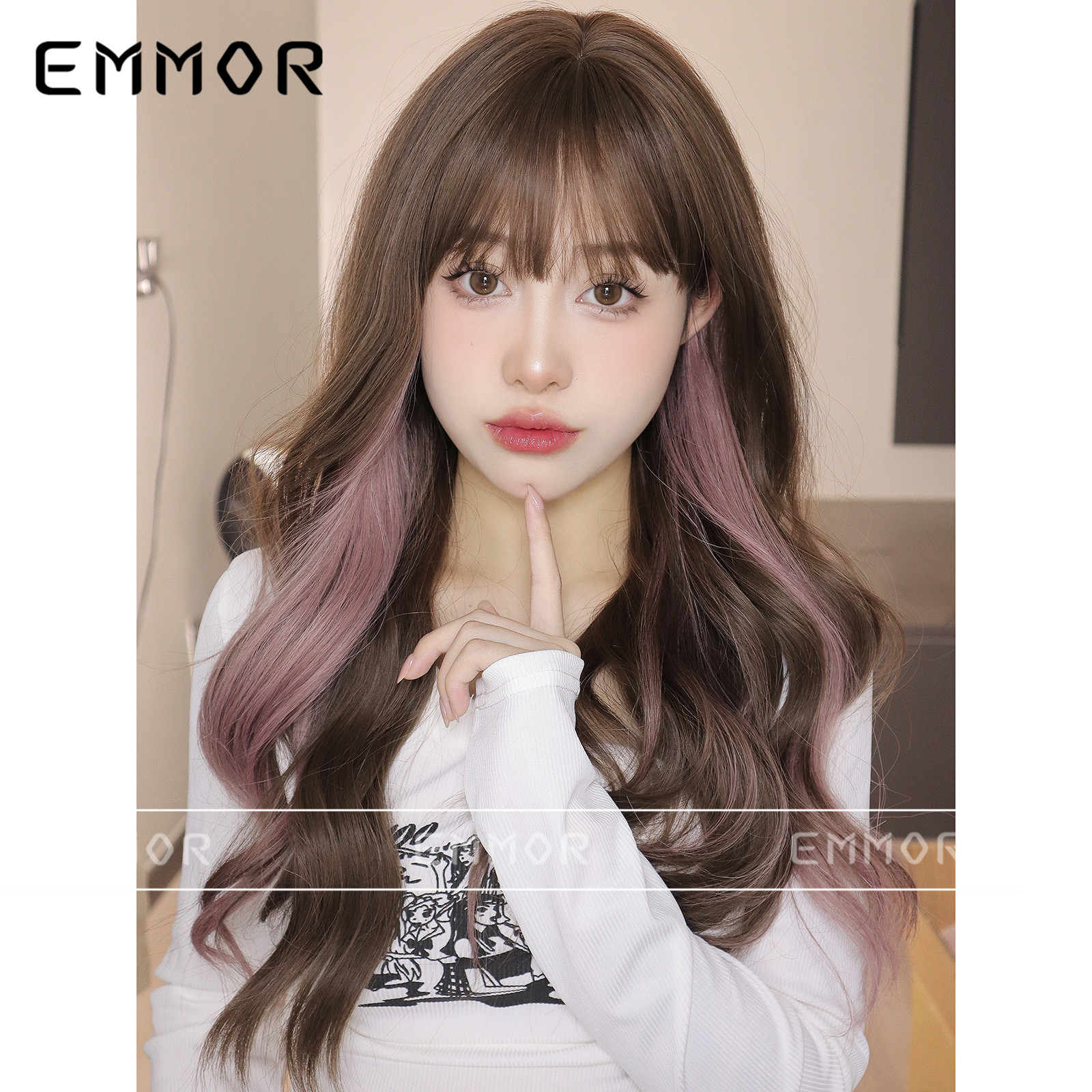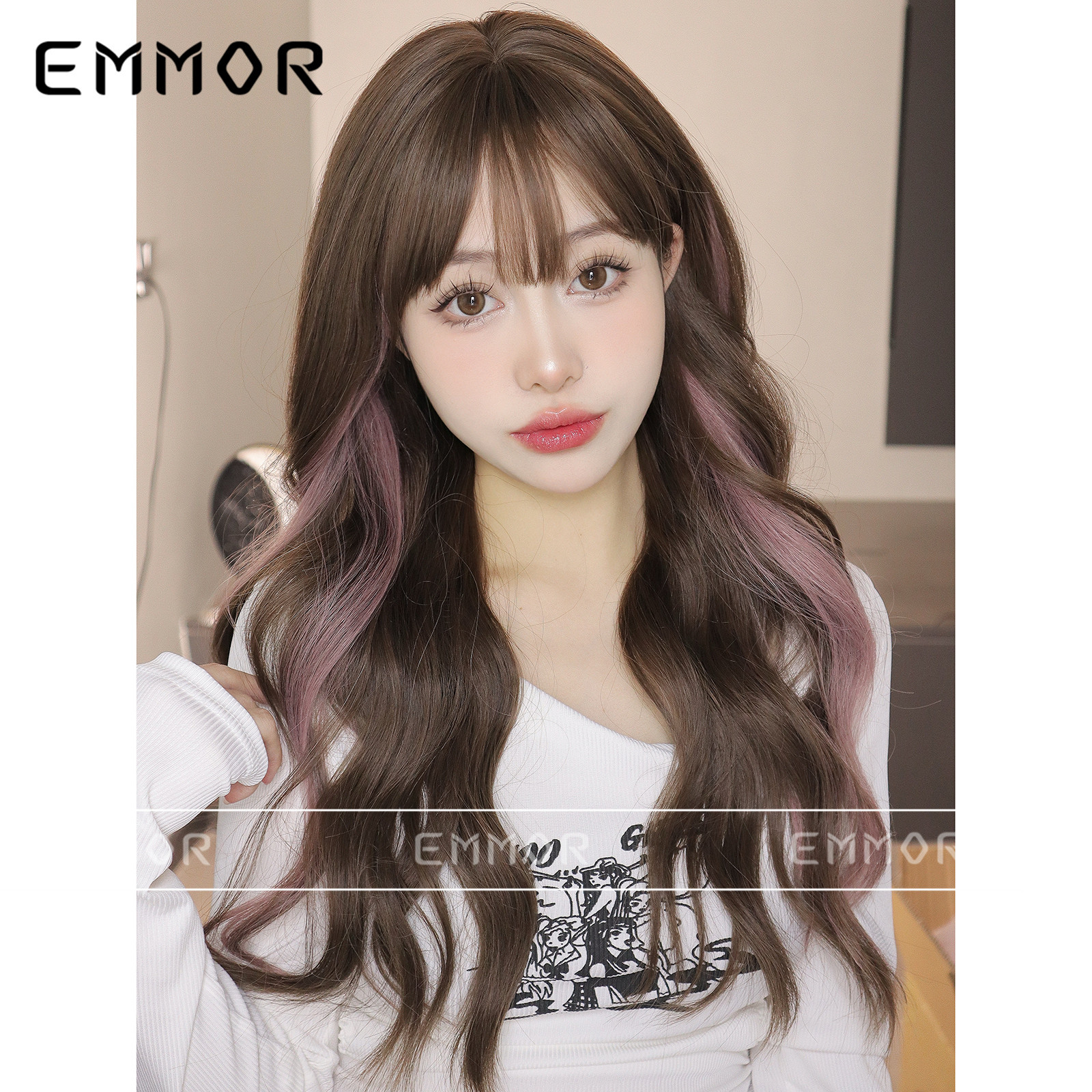 Peluca de cabello largo y rizado de las mujeres Marrón micro rizado teñido Rosa mullido cubierta de cabello flequillo de aire peluca artificial cubierta de la cabeza completa de las mujeres