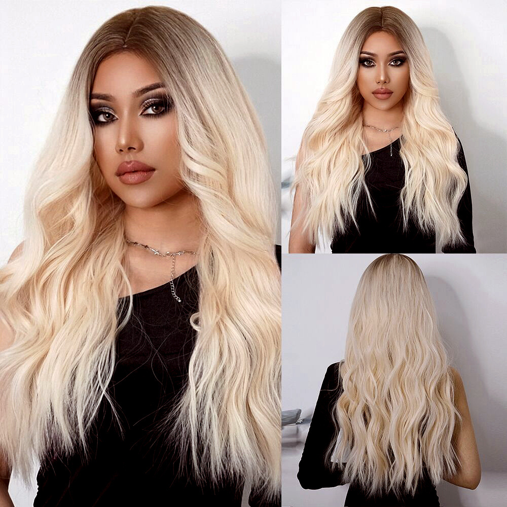 Elegante diosa peluca medio Gradiente de Oro gran ola larga y rizada del pelo de seda de alta temperatura de Europa y América peluca hembra sombrerería
