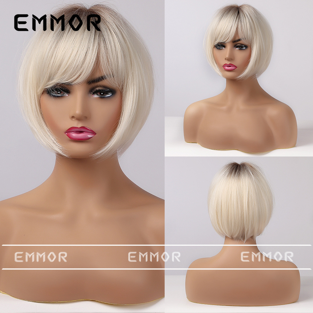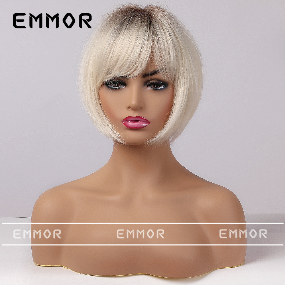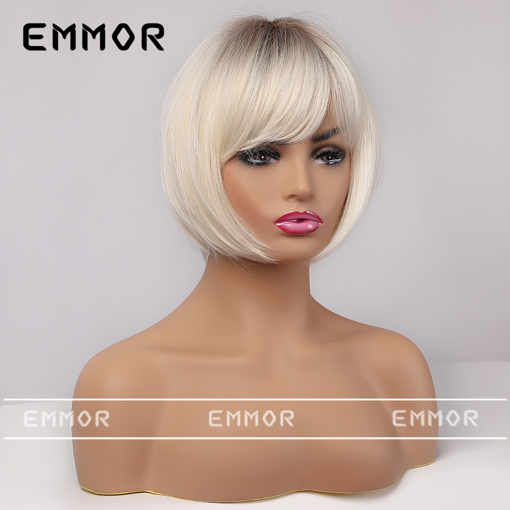 Emmor comercio exterior peluca de moda transfronteriza cabeza teñida cinta de platino negro bangs pelo corto recto peluca de cabeza completa hembra