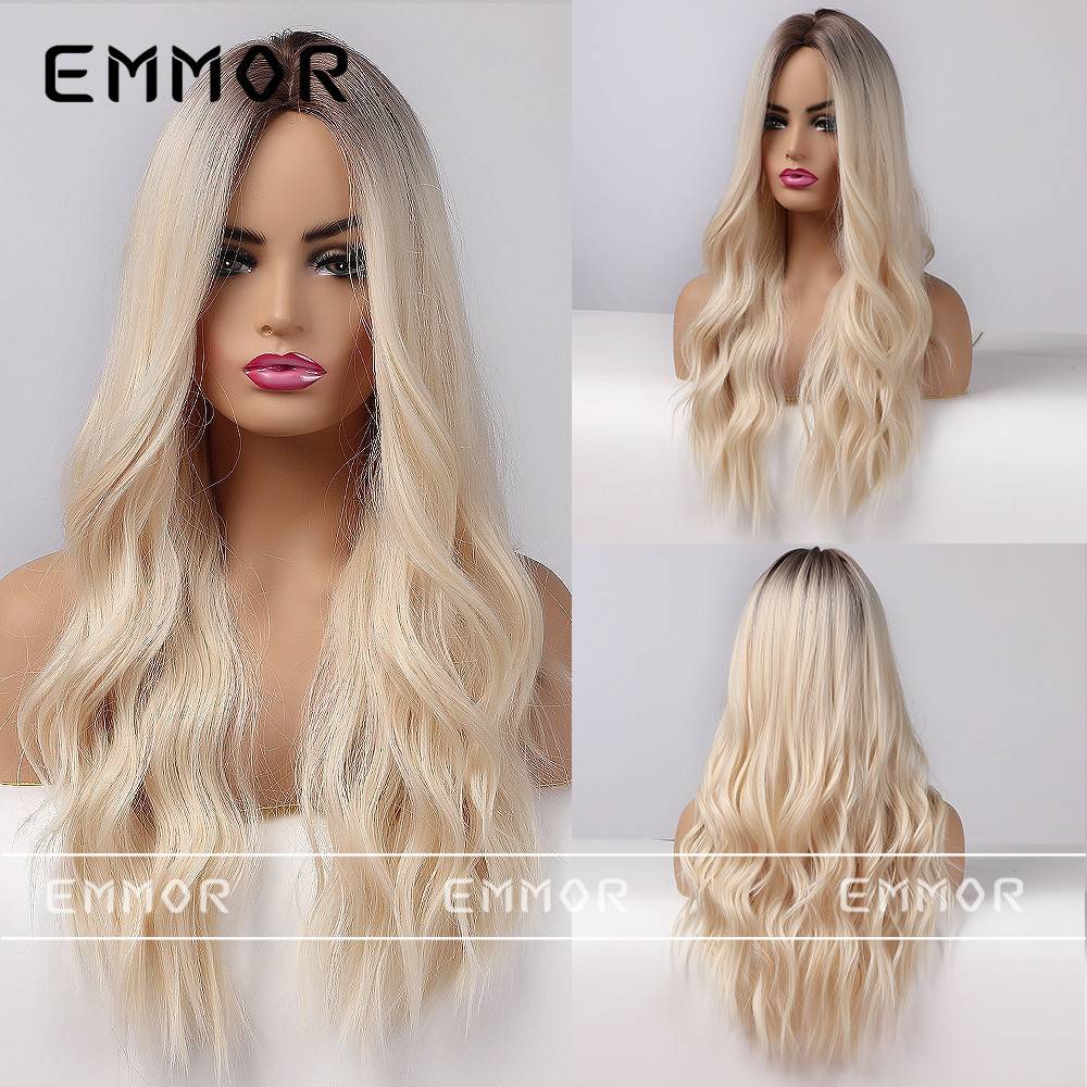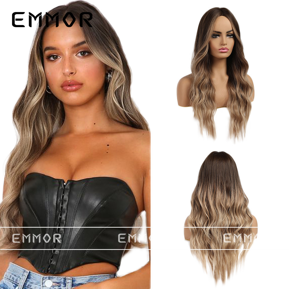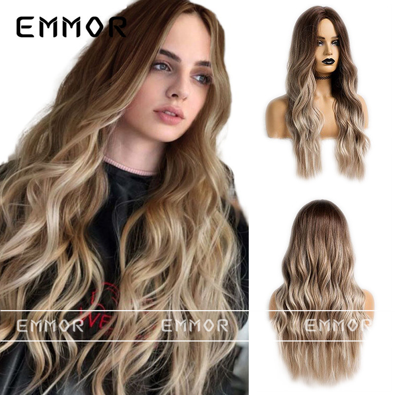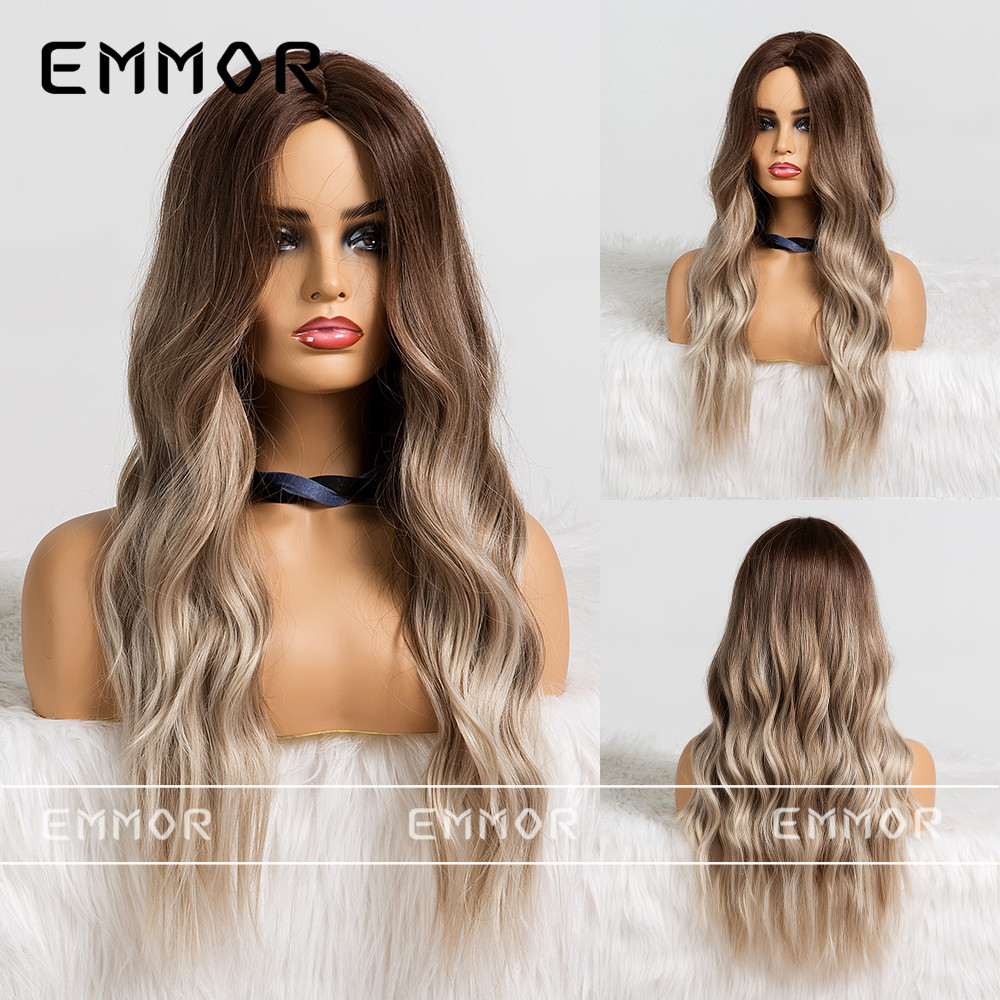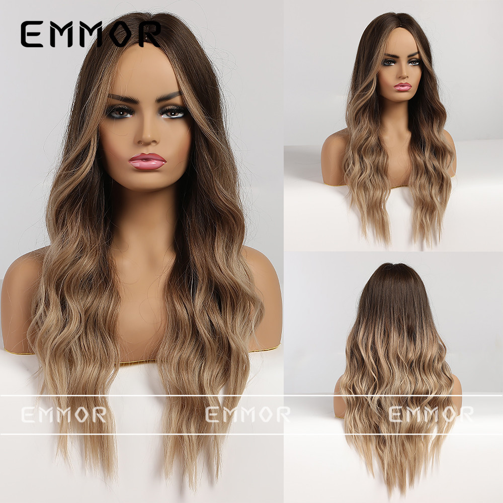 Estilo europeo y americano Amazon teñido gradiente oro natural largo y rizado de las mujeres Fibra química alta temperatura peluca seda fabricante