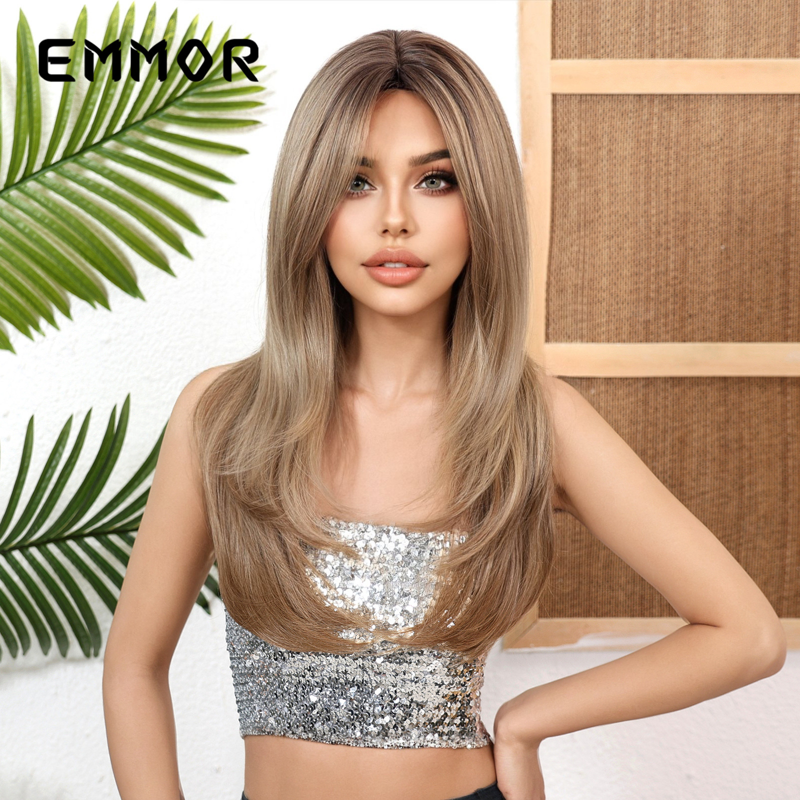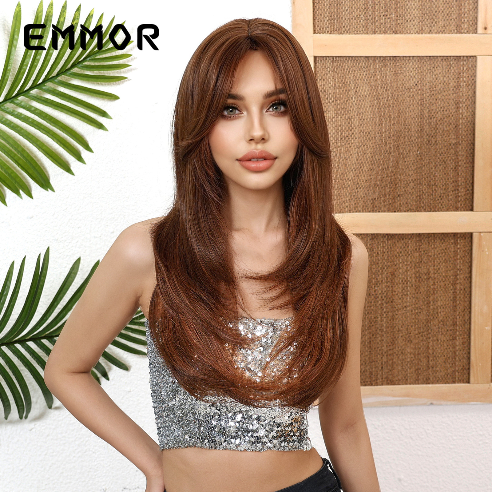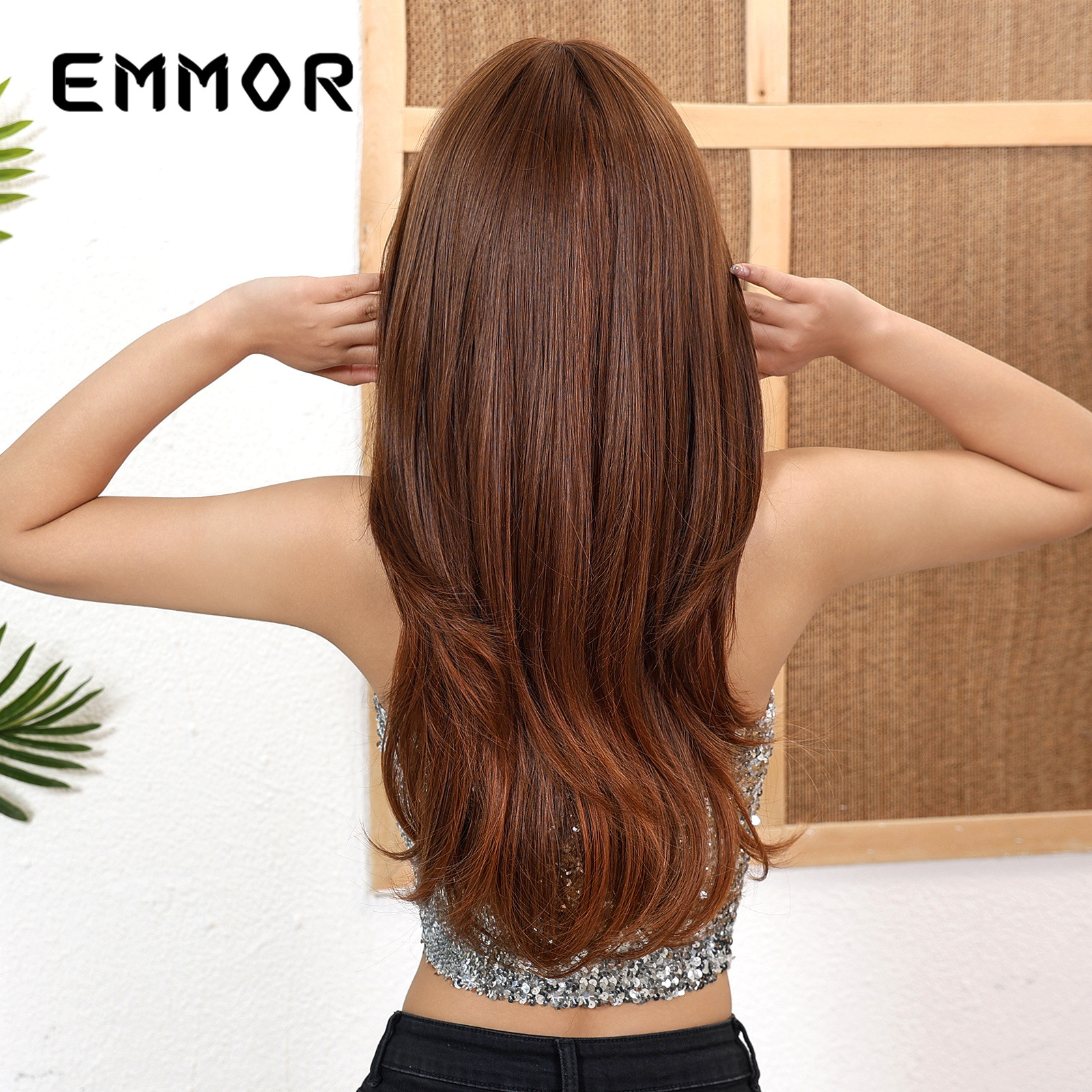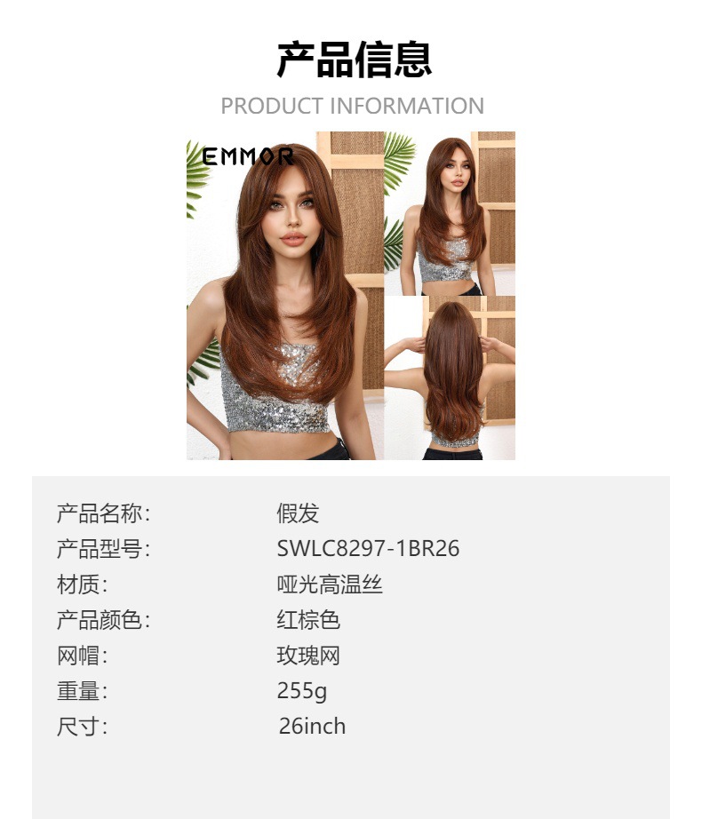 Pelucas europeas y americanas transfronterizas, cabello largo femenino, micro rizado, rojo y marrón, flequillo largo de ocho caracteres, cubierta completa diaria de alto nivel