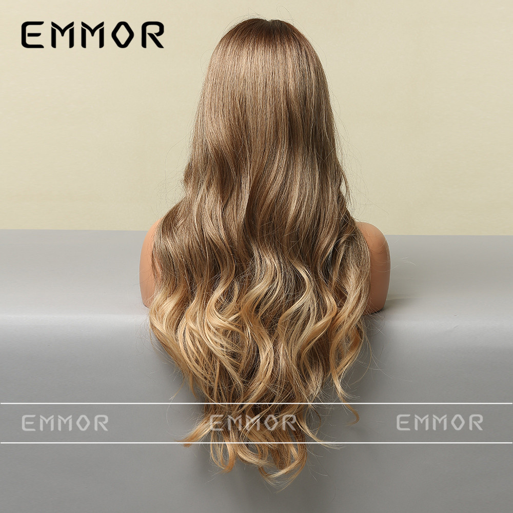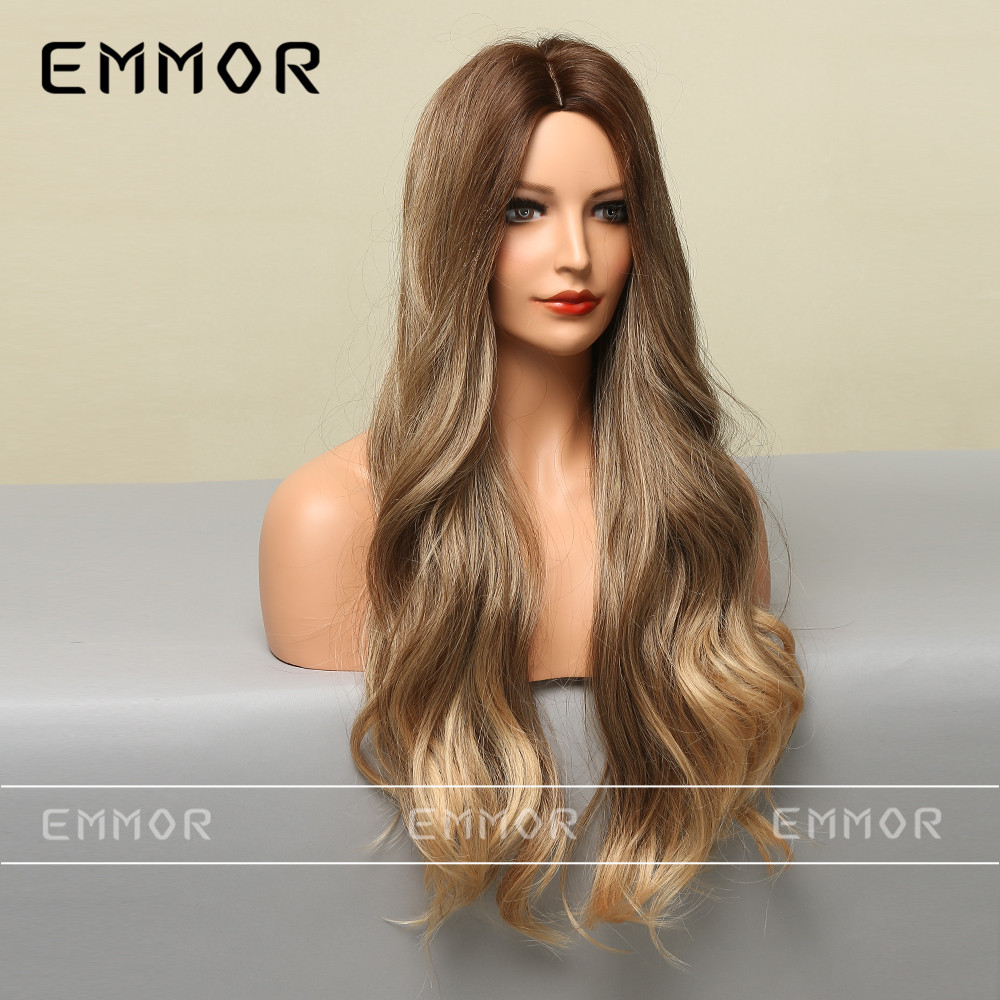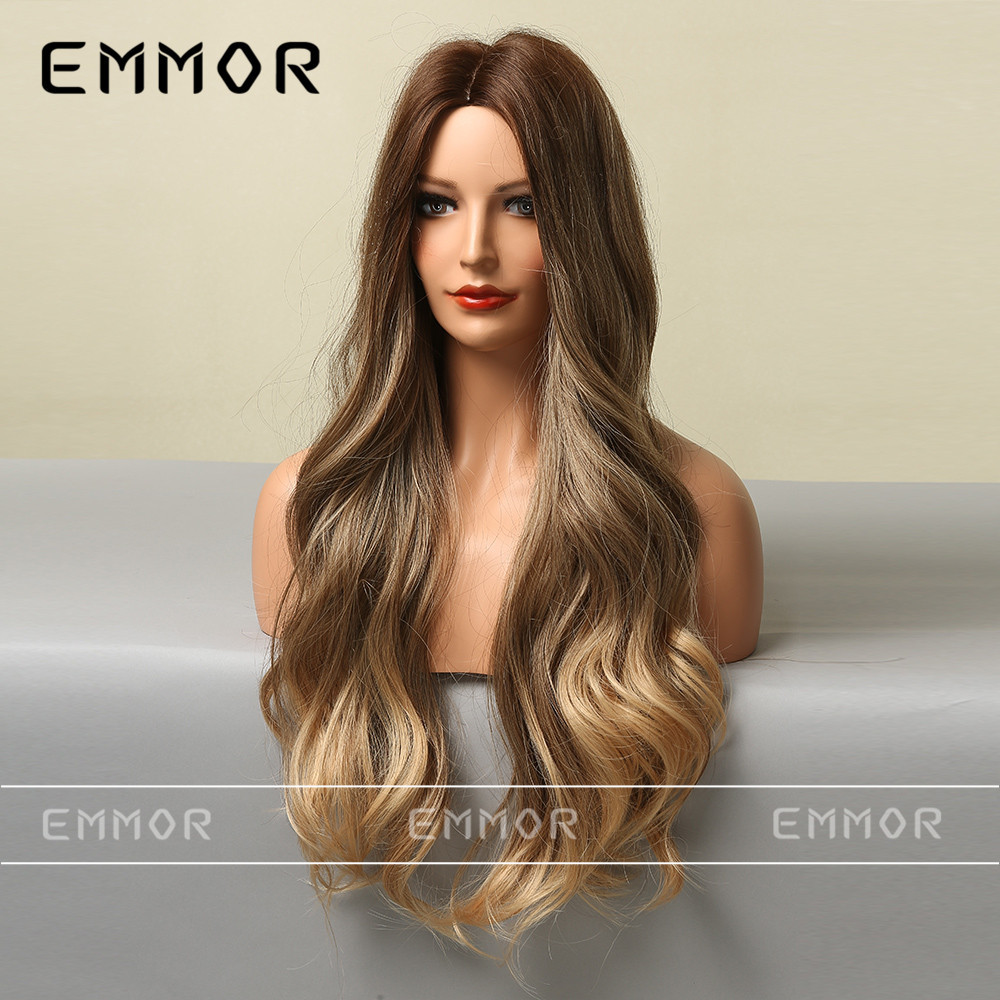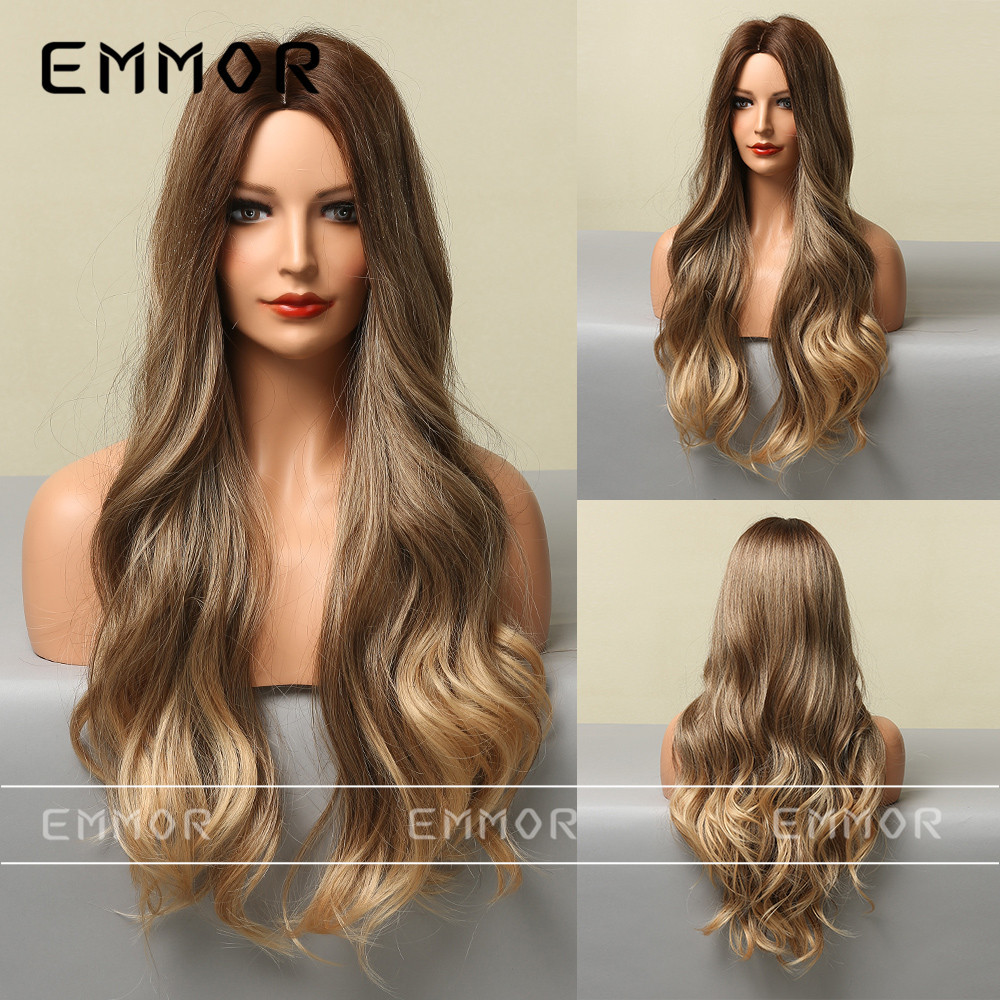 Peluca para Mujer Estilo Europeo y Americano, con Raya en Medio, Color Dorado Degradado, Ondas Grandes, Fibra Resistente al Calor, Peluca Completa, Cabello Largo y Rizado