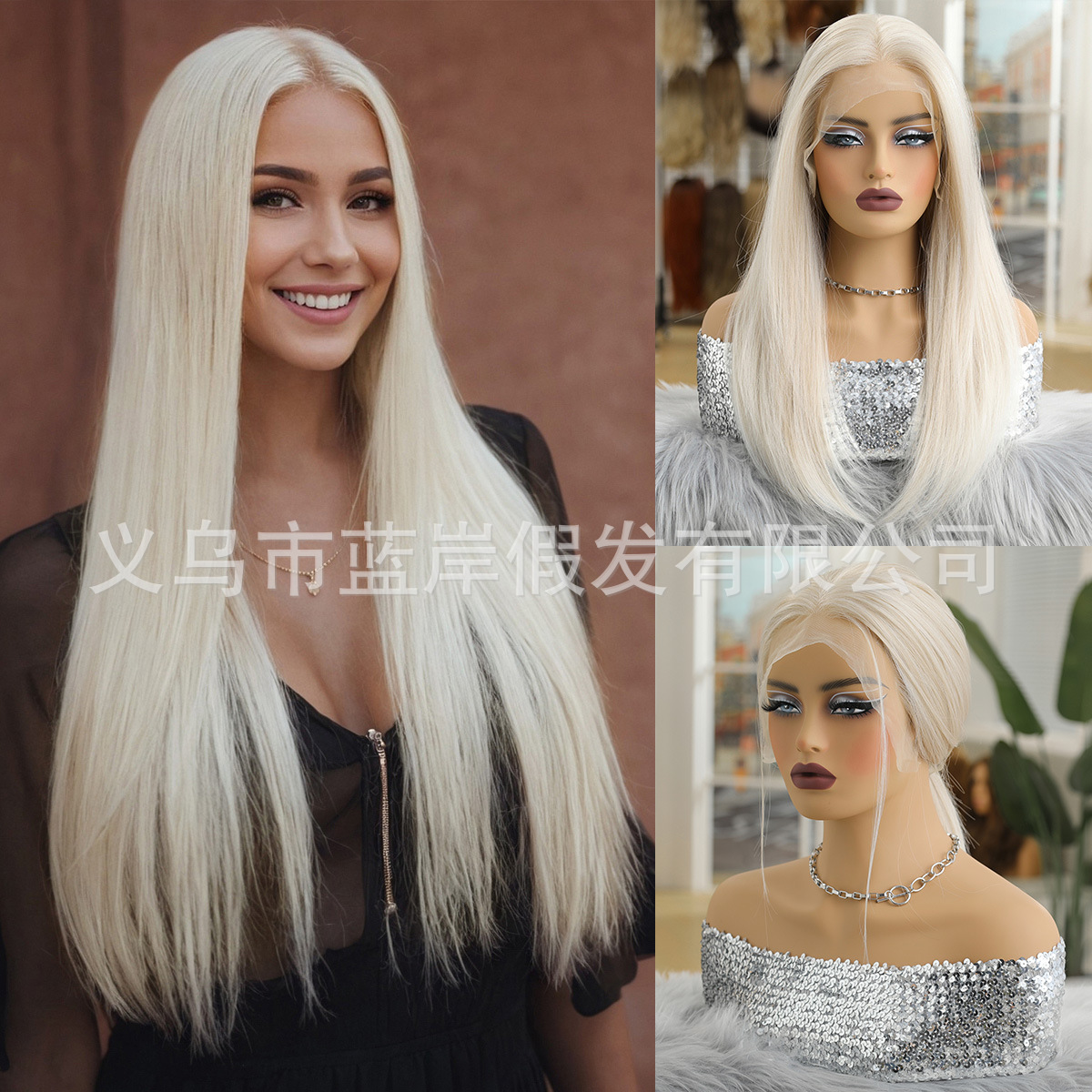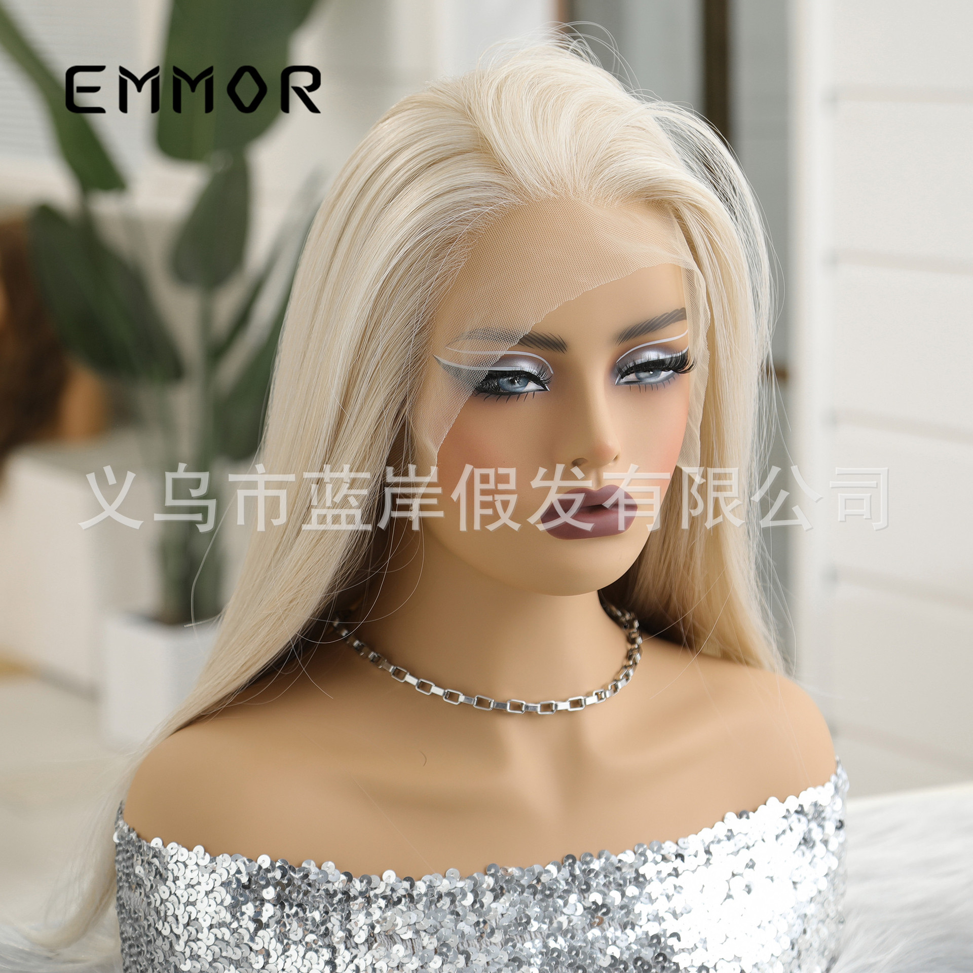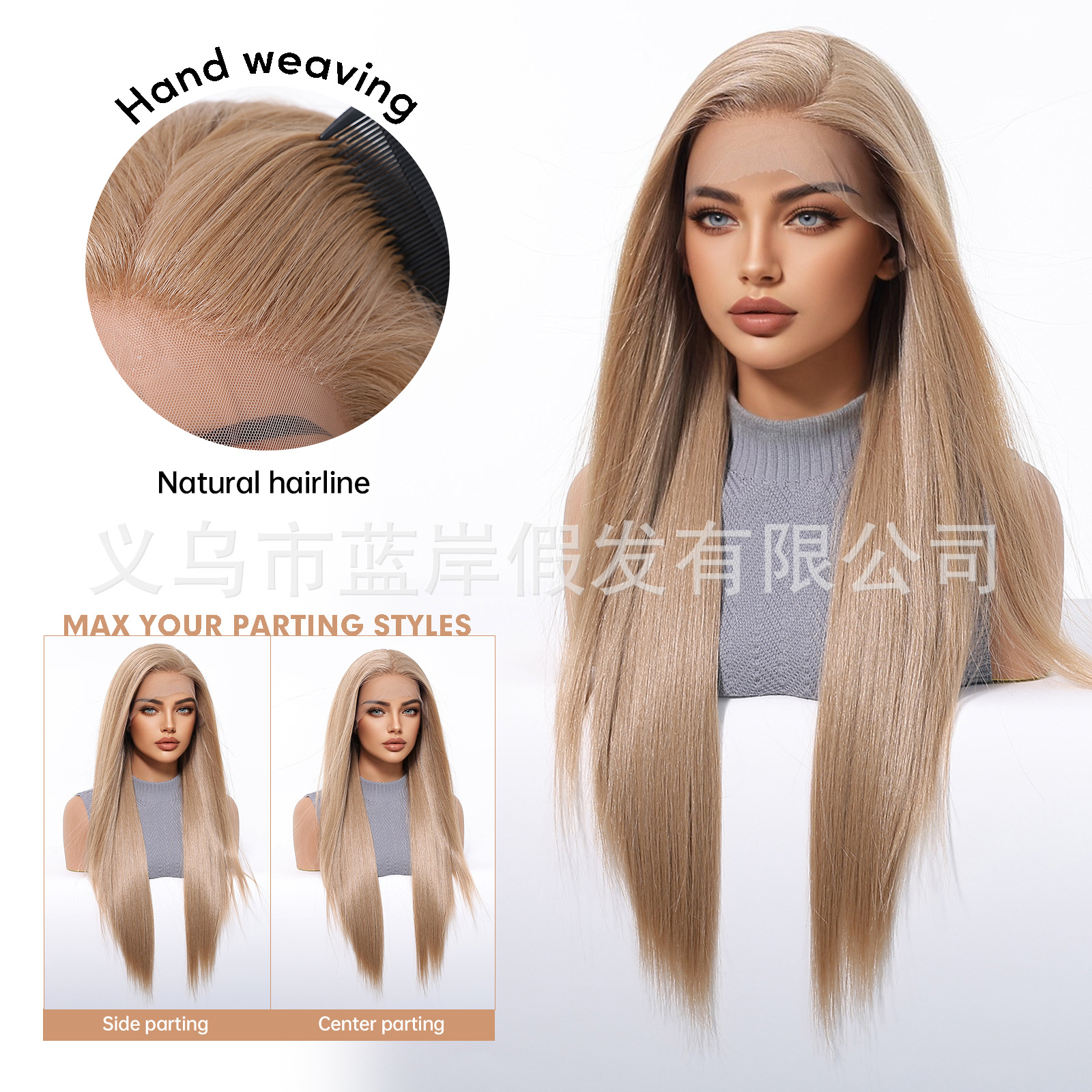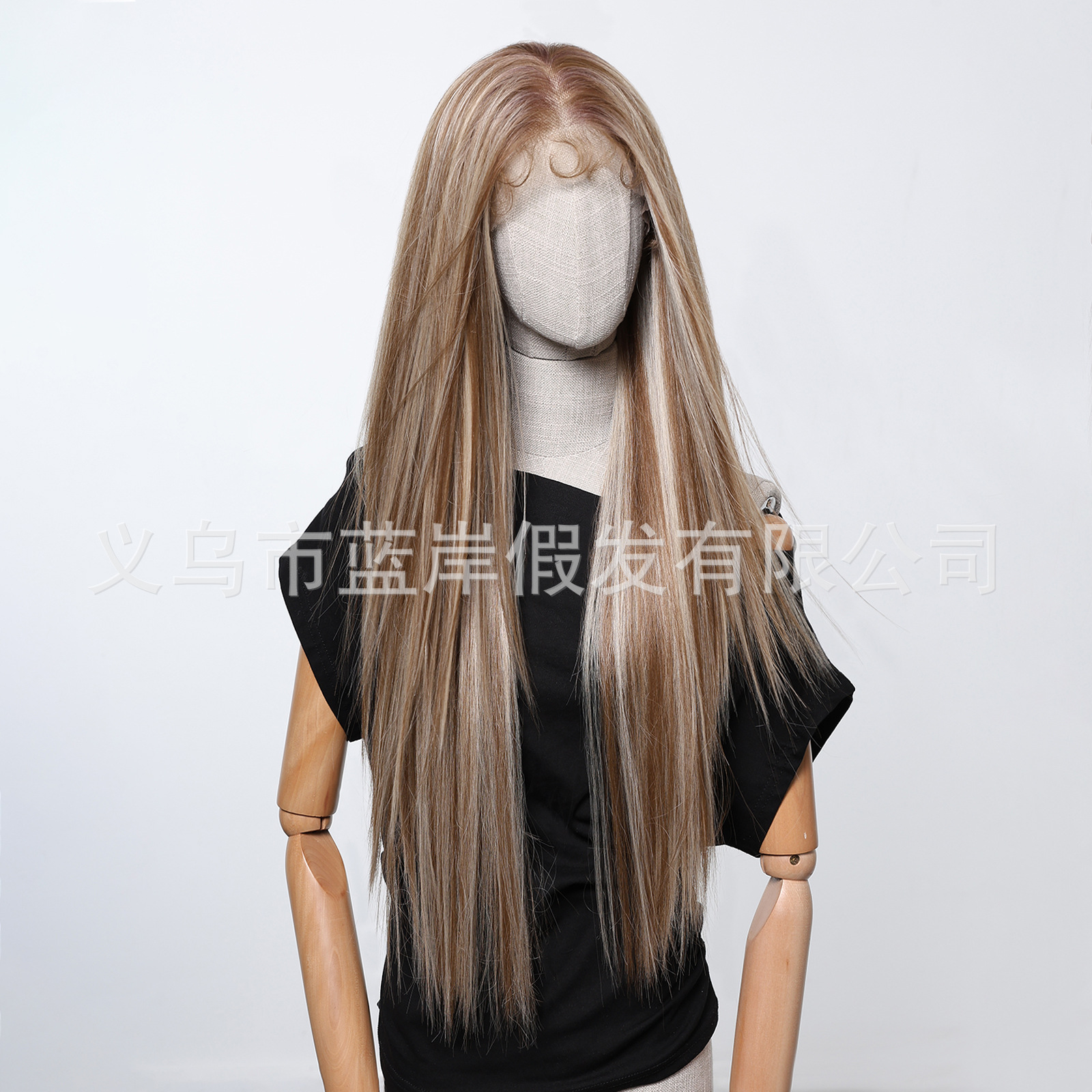 Peluca tejida a mano de encaje de gran área transfronteriza 13*6, cabello largo y liso dorado, costura libre, estilo de temperamento, punto de fábrica