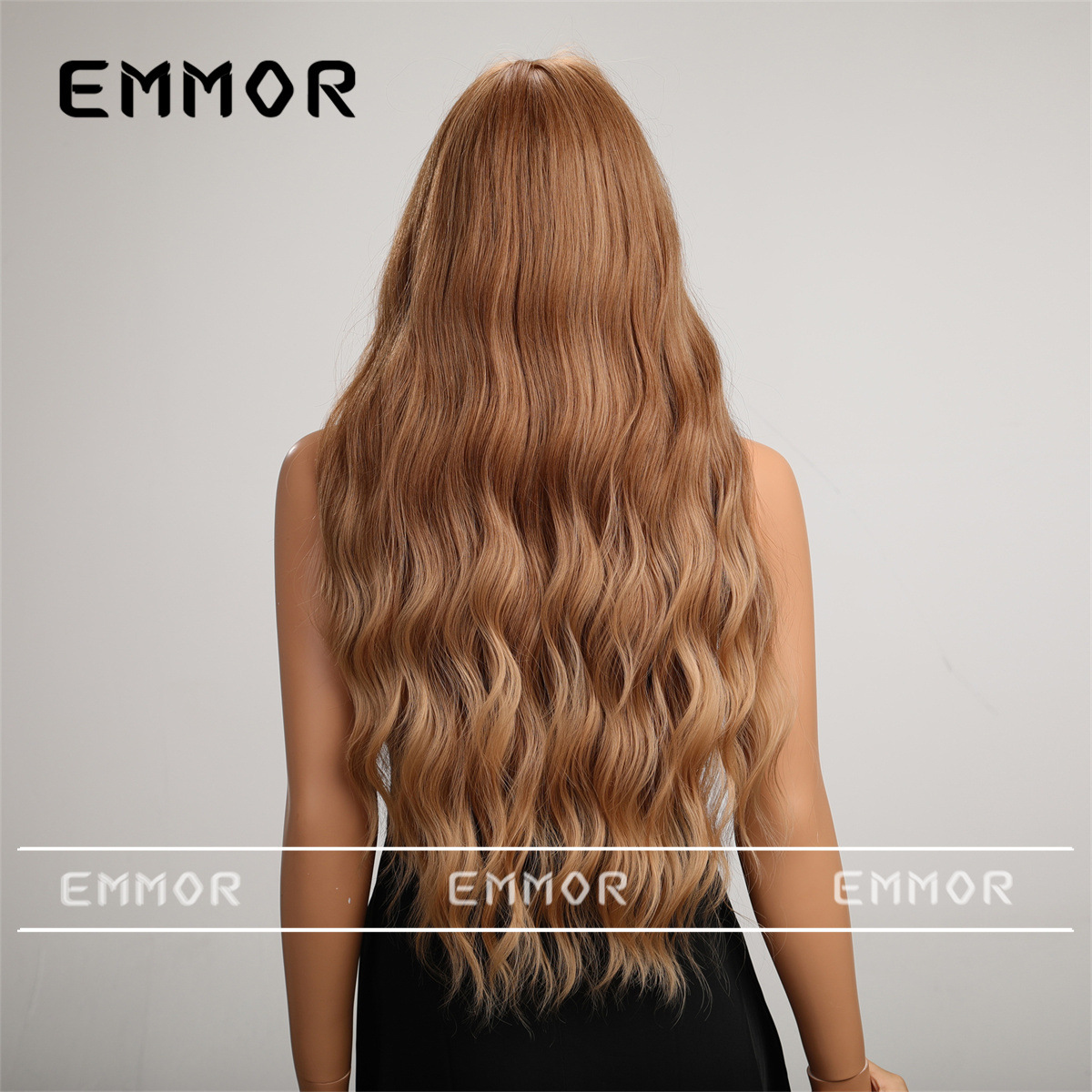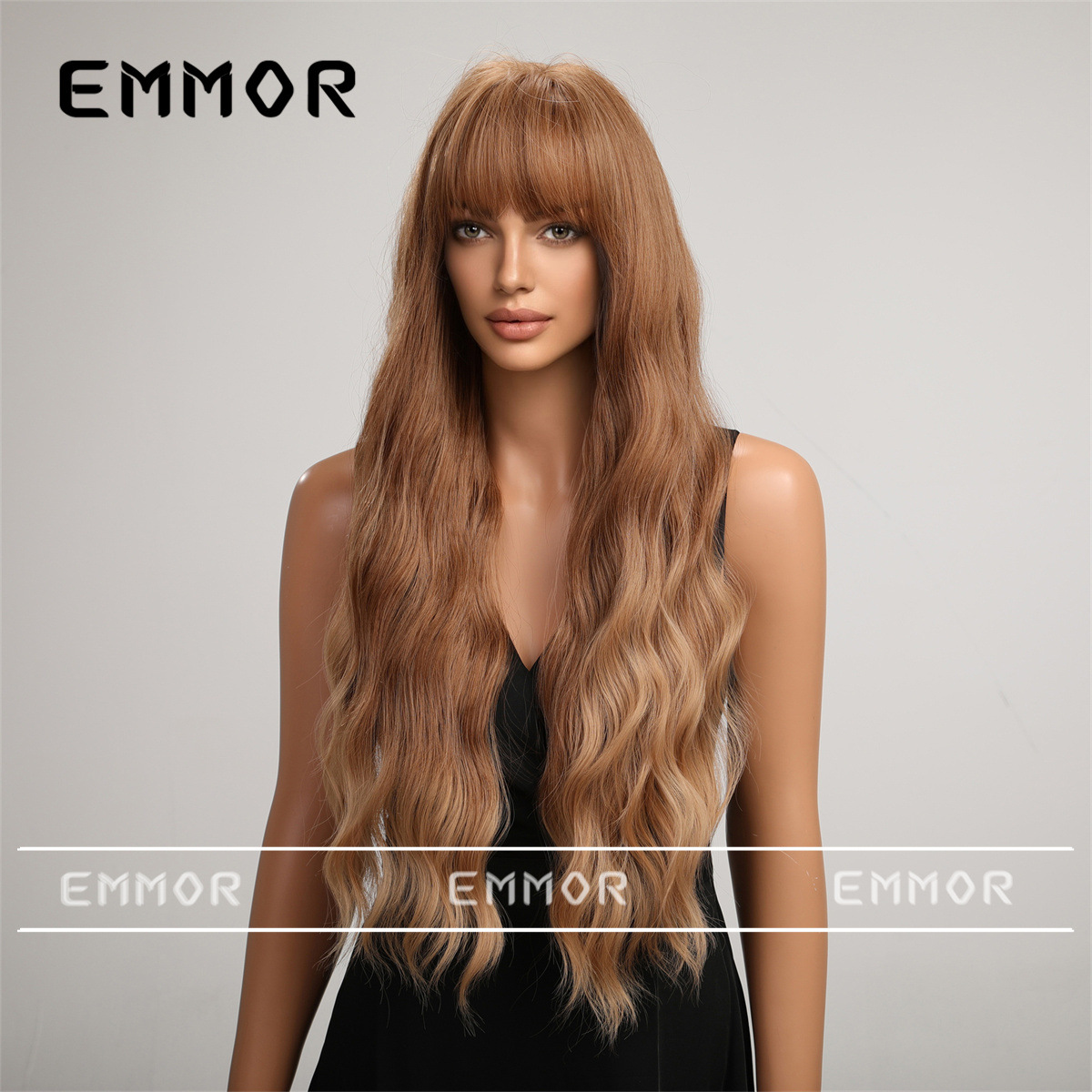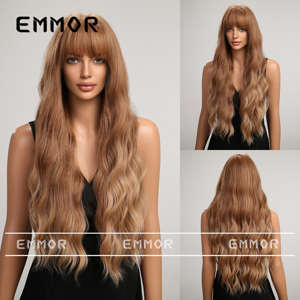Peluca transfronteriza femenina pelo largo flequillo recto té de leche marrón ondulación del agua pelo largo y rizado temperamento simulación natural cubierta de la cabeza completa