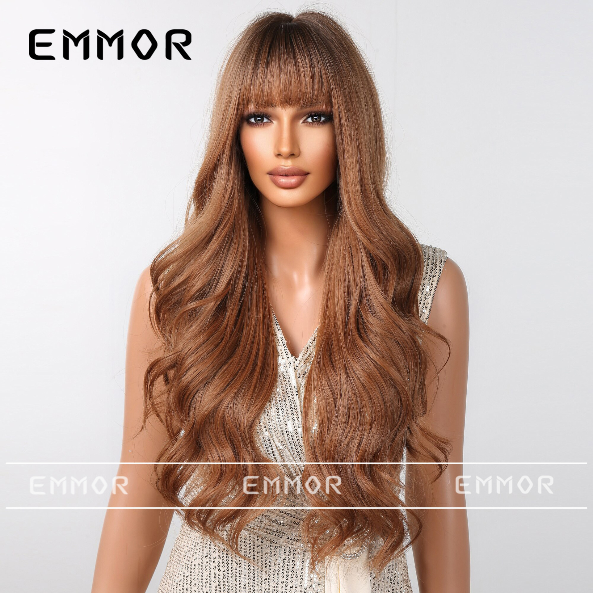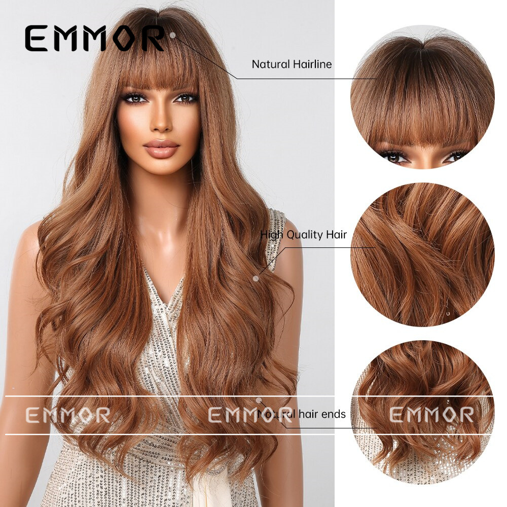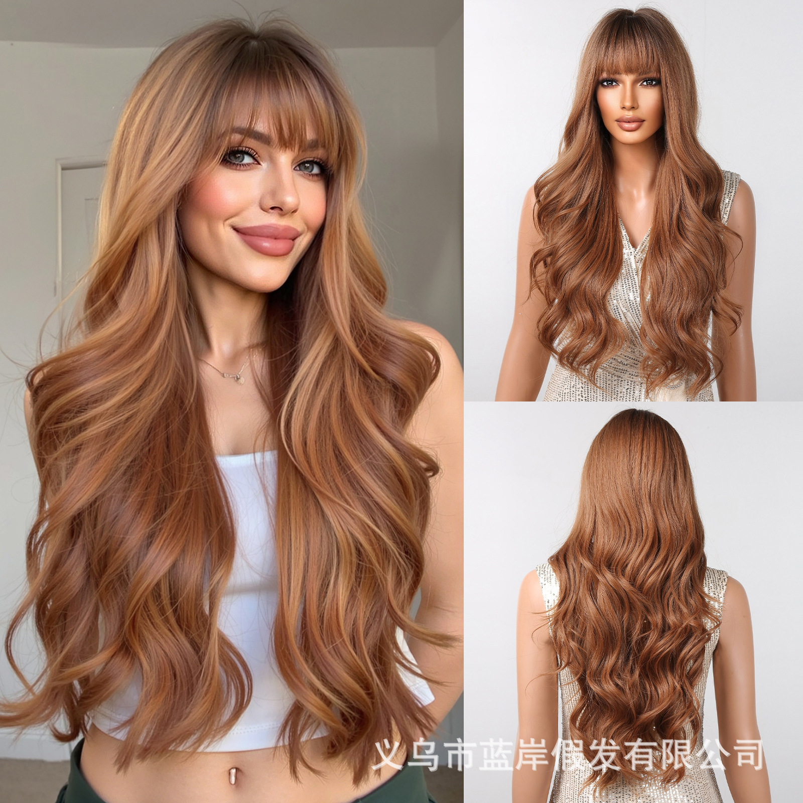 Nueva peluca de estilo europeo y americano para mujer, diadema completa con flequillo, marrón dorado, pelo largo y rizado ondulado grande, conjunto de pelucas de fibra química