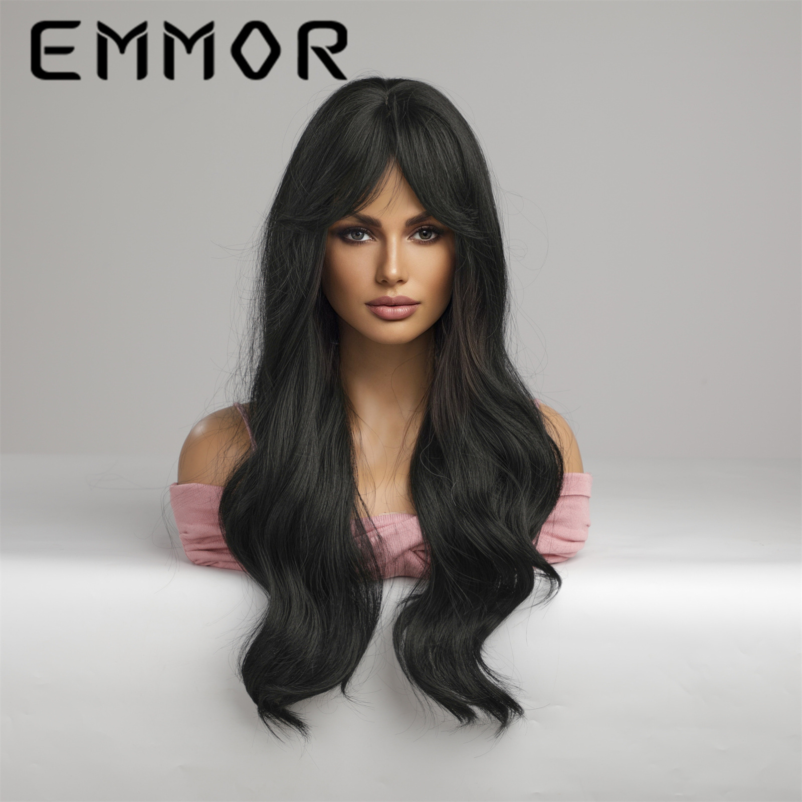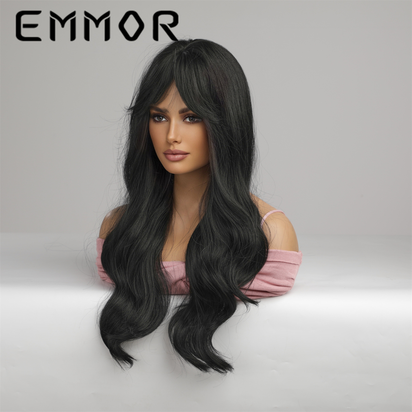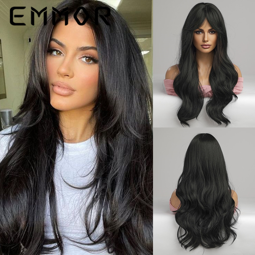 Peluca europea y americana de las mujeres tocados de longitud media de ocho caracteres Bangs negro largo pelo rizado fibra química peluca Peluca de pelo