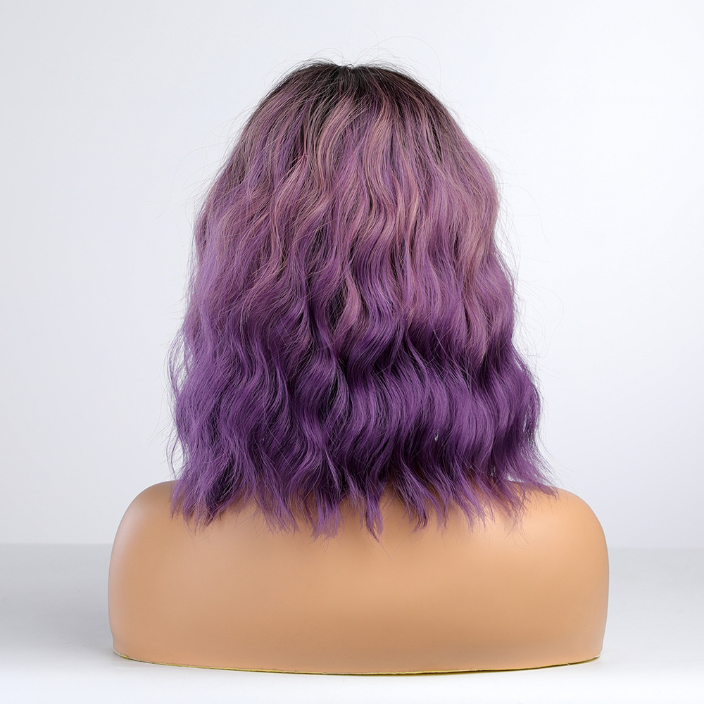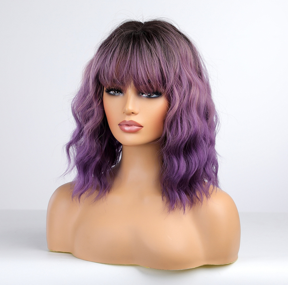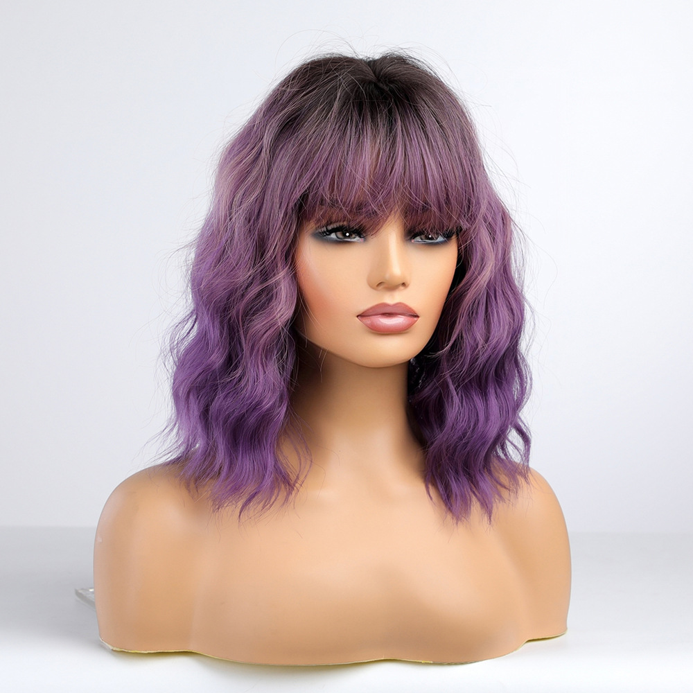Nueva peluca transfronteriza de Amazon con flequillo, pelo corto y rizado morado, cabeza BOBO, tocado completo de seda de alta temperatura de fibra química europea y americana