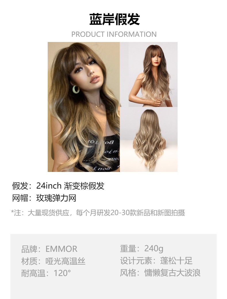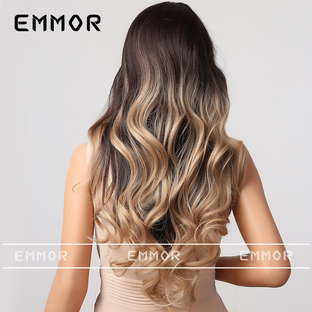Venta caliente de alta temperatura gradiente de seda marrón onda grande medio largo pelo rizado europeo y americano transfronterizo peluca femenina cubierta de la cabeza completa