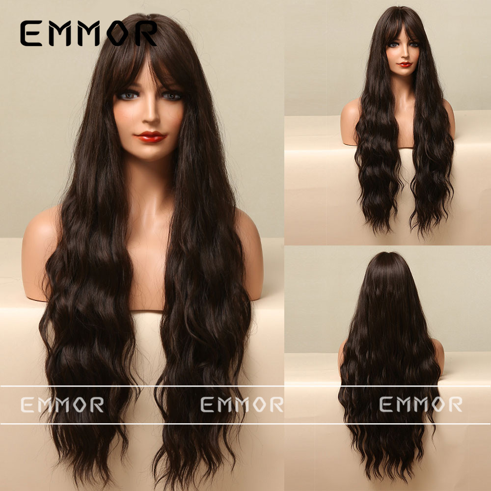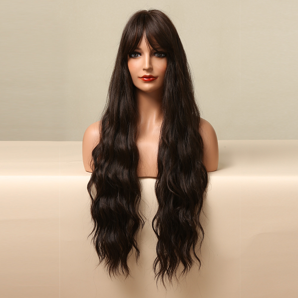 Peluca europea y americana hembra negro marrón de ocho caracteres flequillo largo pelo rizado en stock Peluca de pelo de alta temperatura cosplay de seda