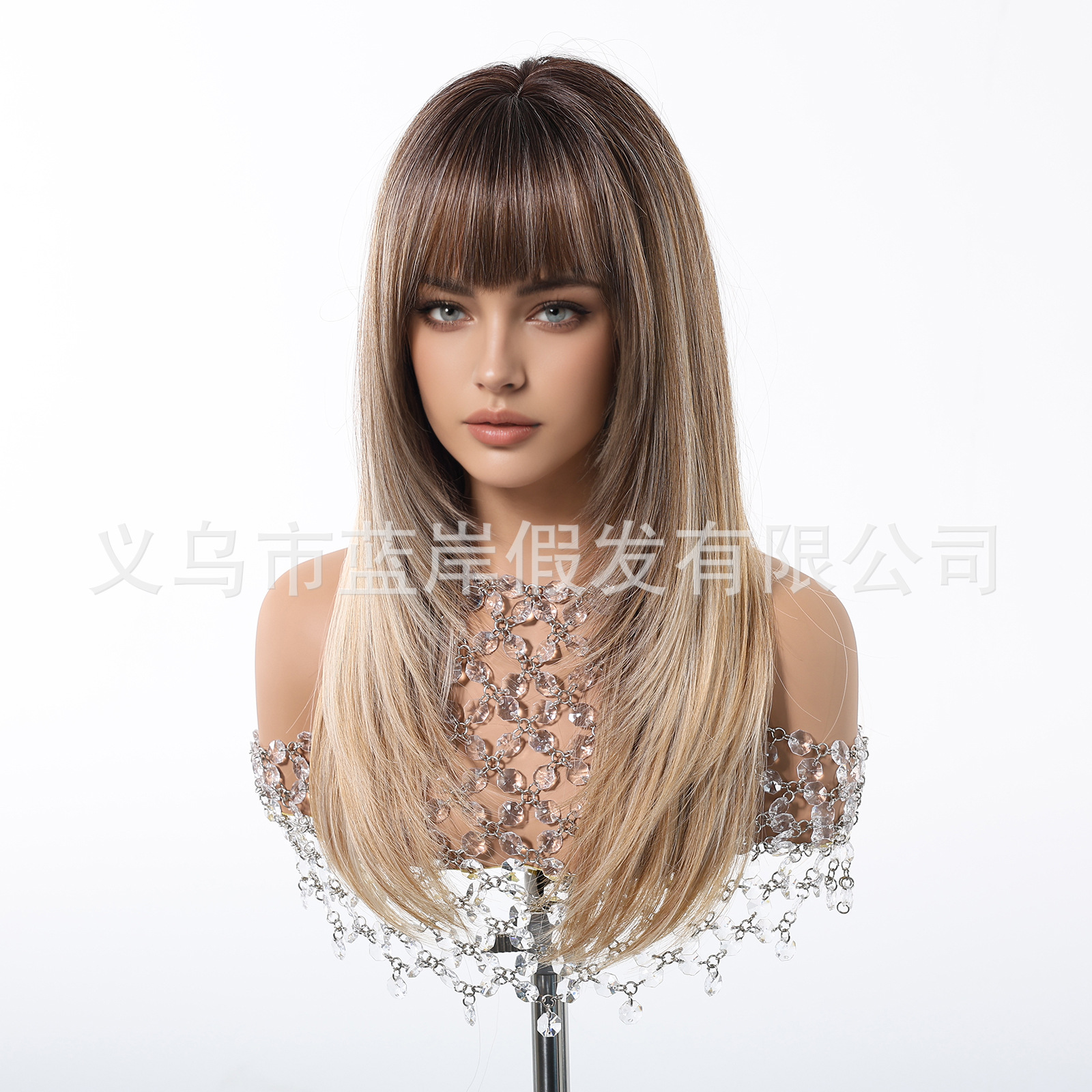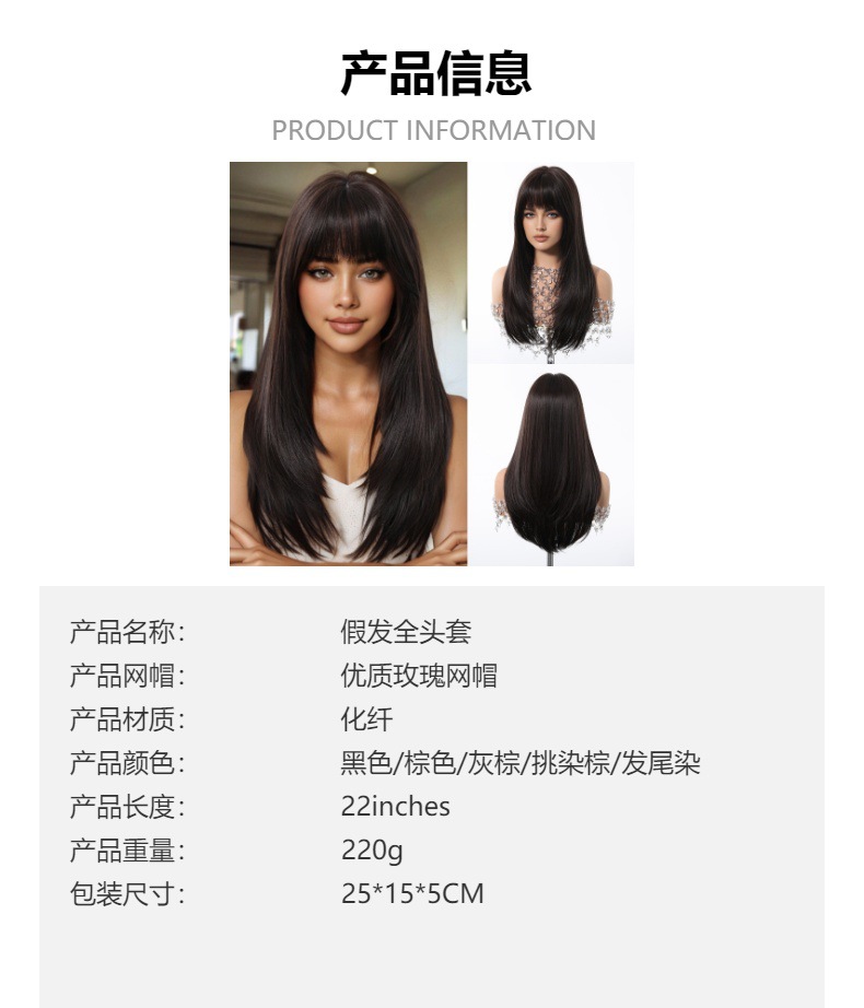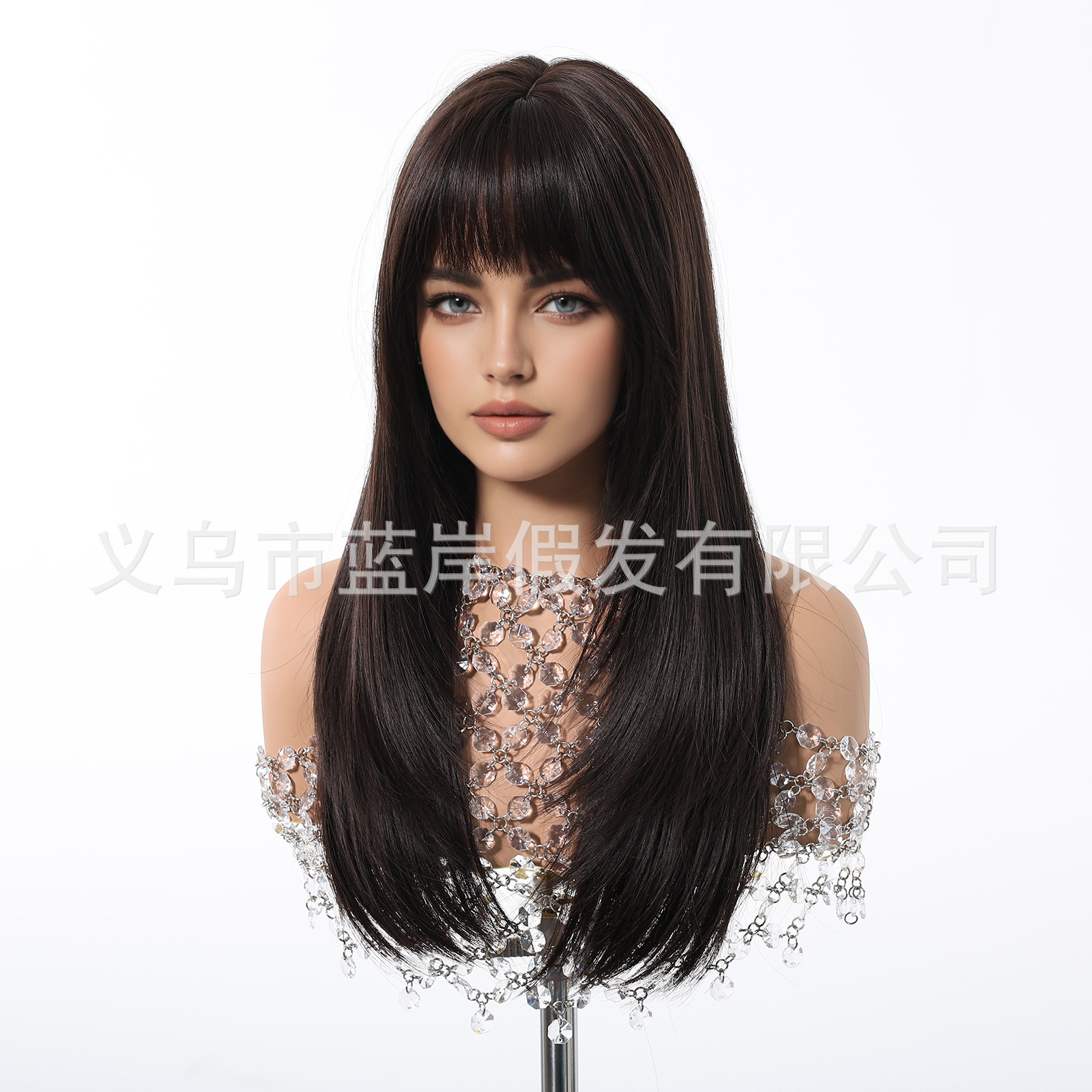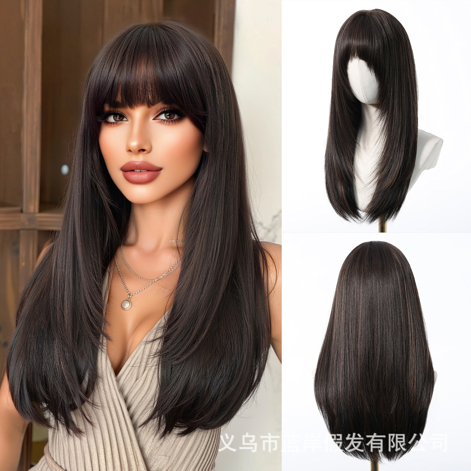 Nuevas pelucas transfronterizas, flequillo de aire, nivel de atmósfera, negro, marrón, cabello largo y liso, cubierta de fibra química, punto de fábrica