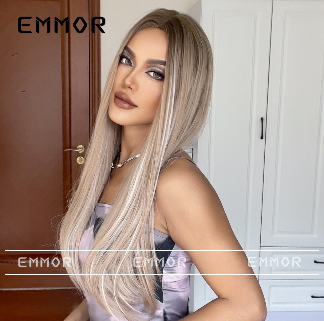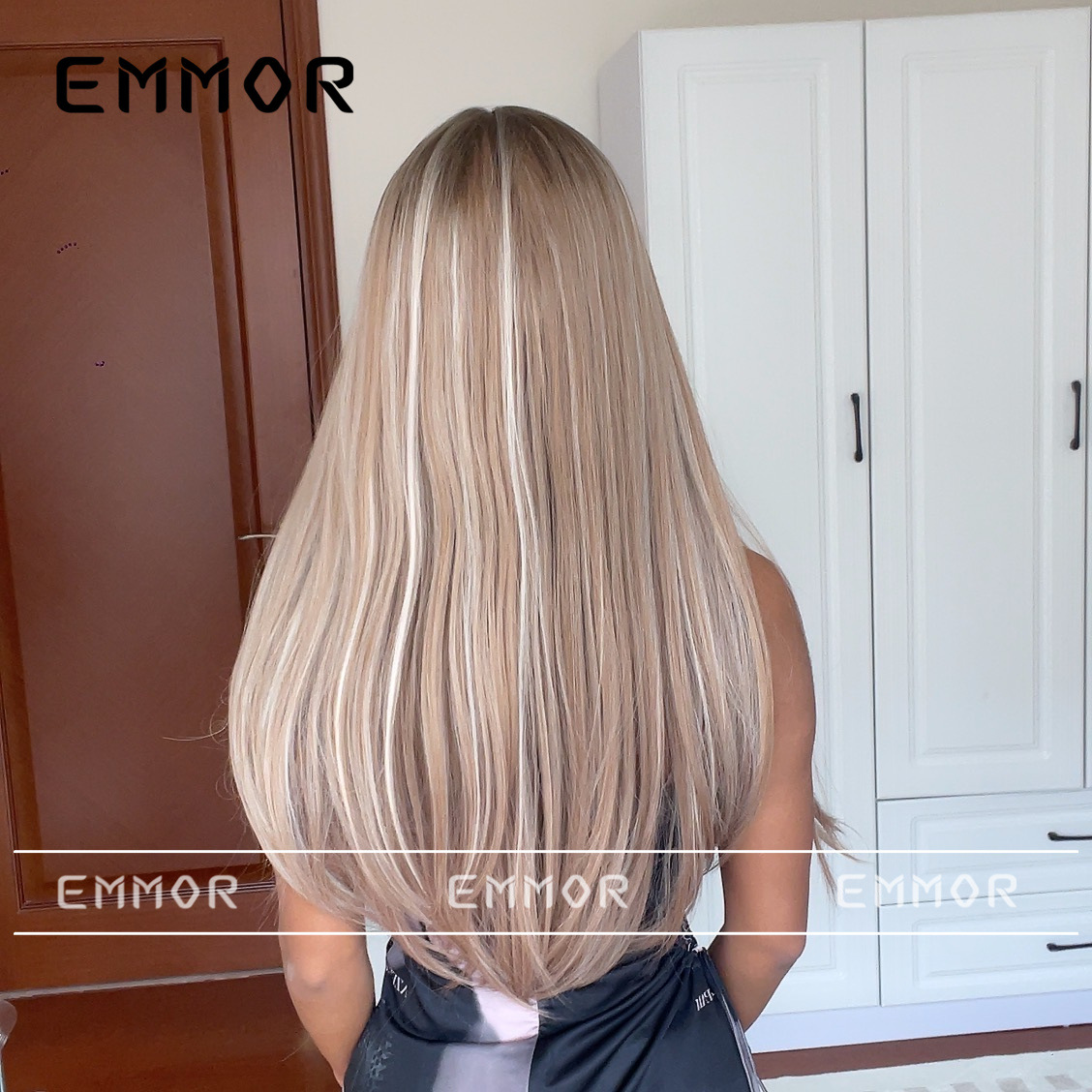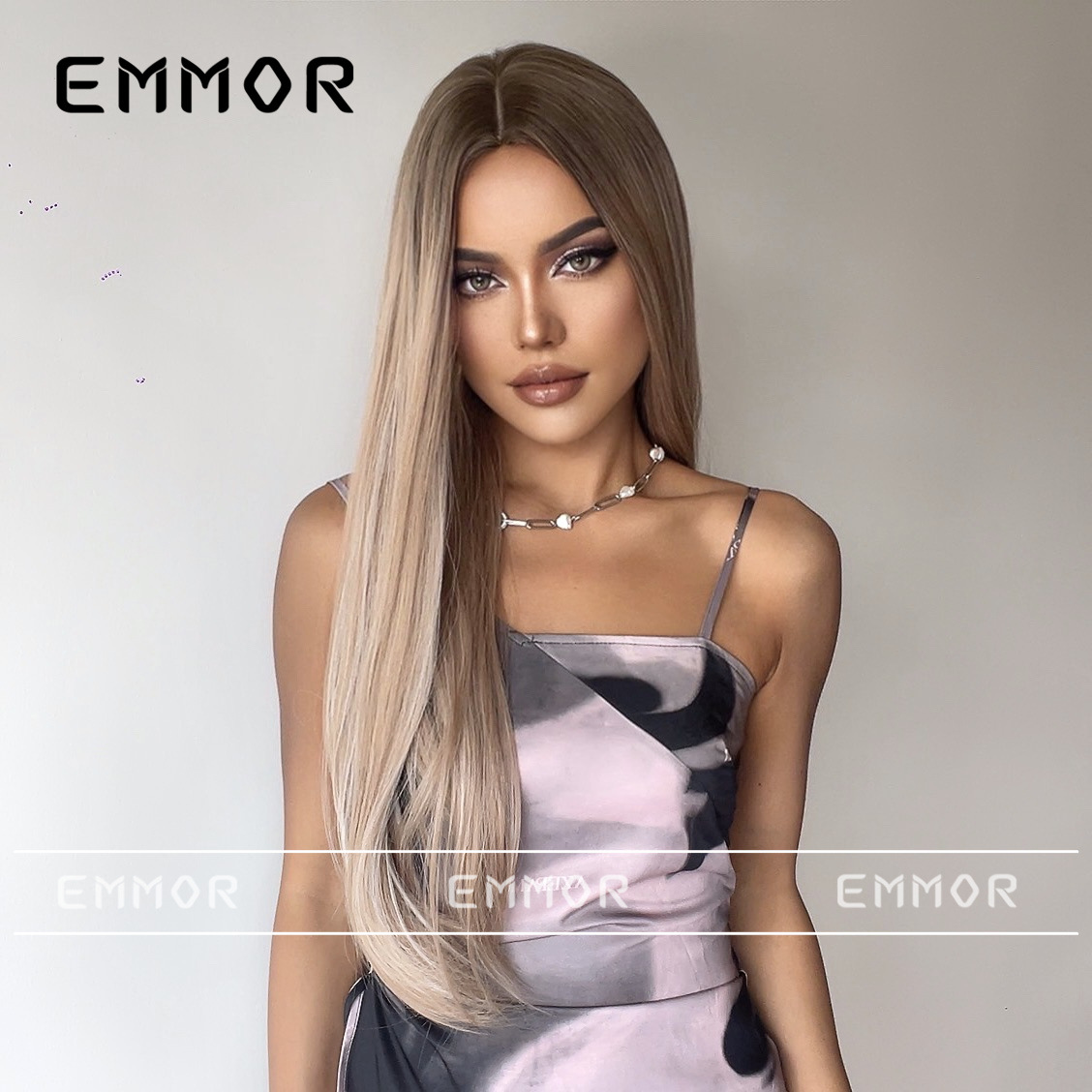 Peluca Mujeres de longitud media sin flequillo degradado teñido marrón largo cabello liso esponjoso natural europeo y americano cubierta de la cabeza completa Peluca de pelo