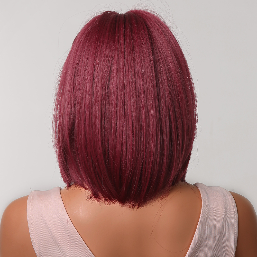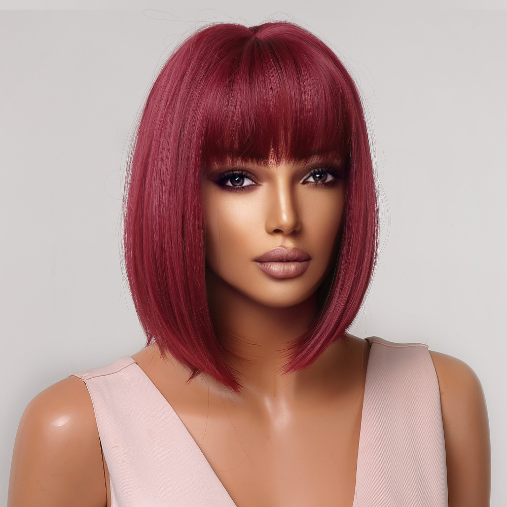 Suministro directo de fábrica venta caliente transfronteriza europea y americana cubierta de cabeza completa flequillo recto corto bobo cabeza vino rojo fibra química peluca de pelo