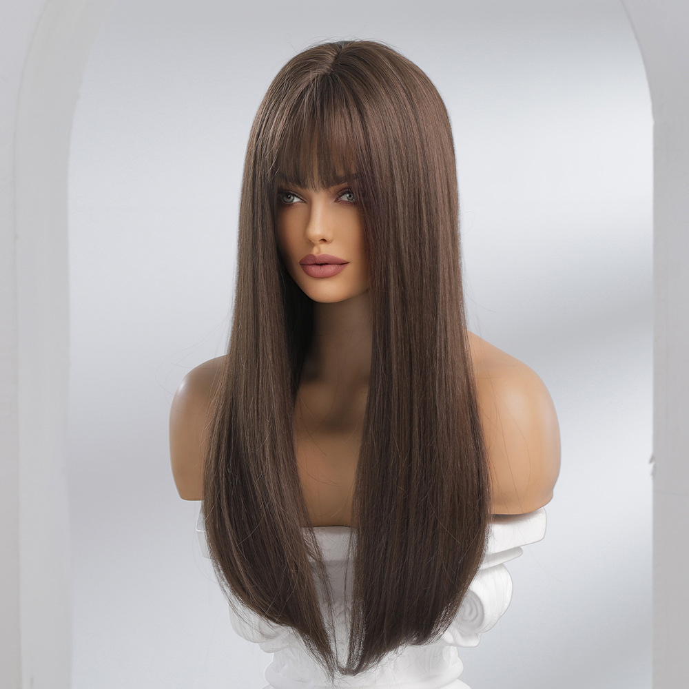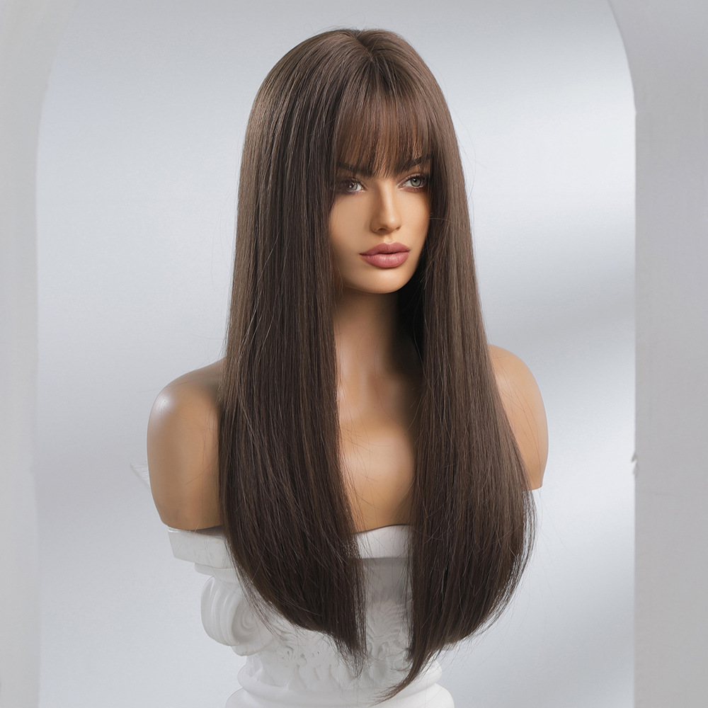 Nueva Venta caliente Qi flequillo natural marrón mullido coreano pelo largo pelo recto moda peluca fibra química cubierta de la cabeza completa pelucas