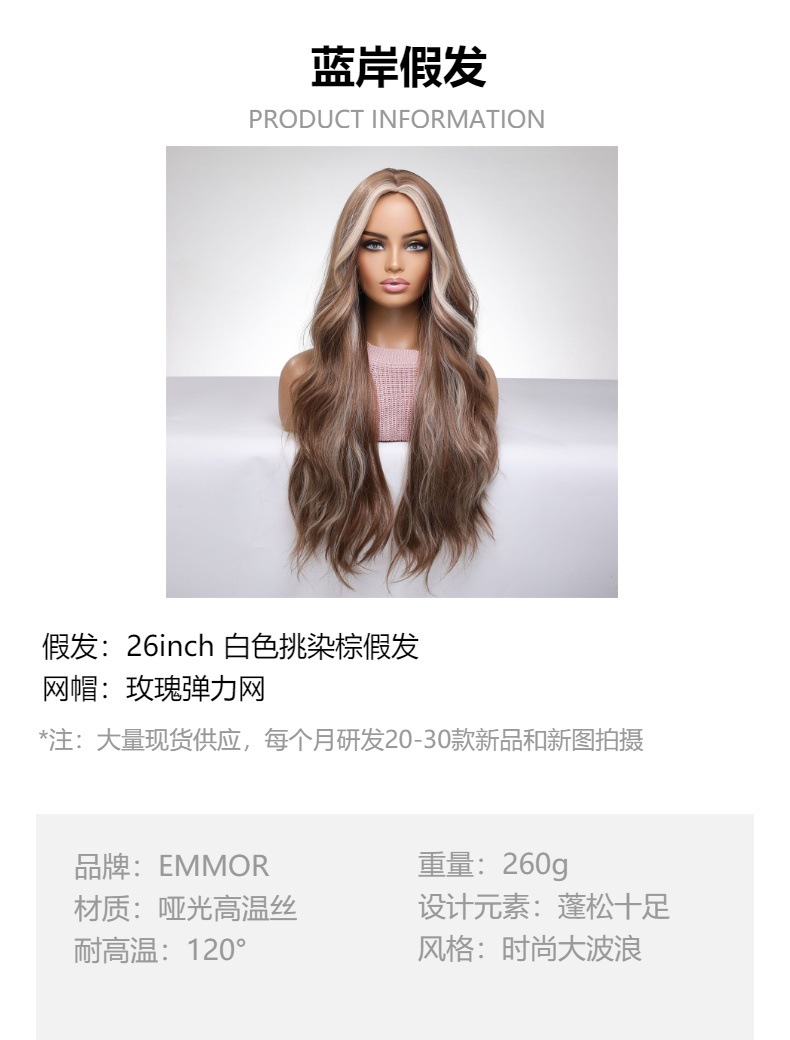 Europeo y americano de longitud media larga peluca rizada cabello femenino colgante oído teñido mullido onda grande mezclado color de cabello marrón cubierta de la cabeza completa