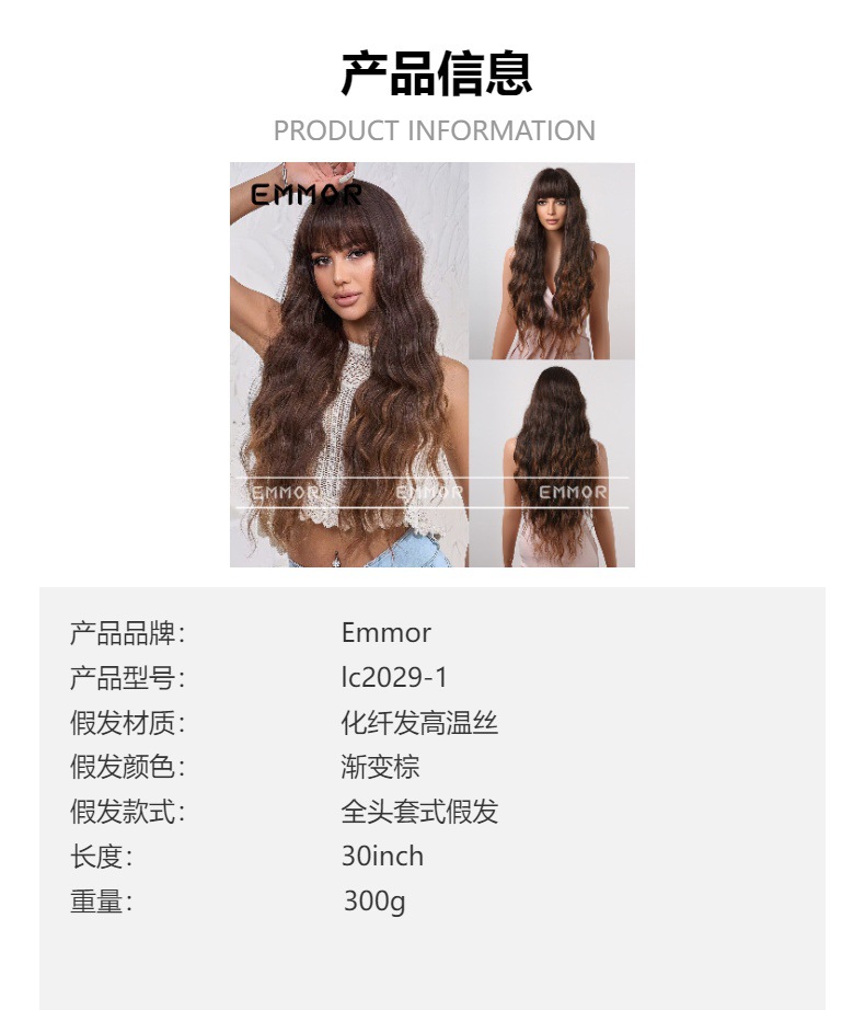 Estilo europeo y americano gradiente marrón recto flequillo lana rizado largo pelo rizado moda elegante seda de alta temperatura fibra química peluca cabeza cubierta