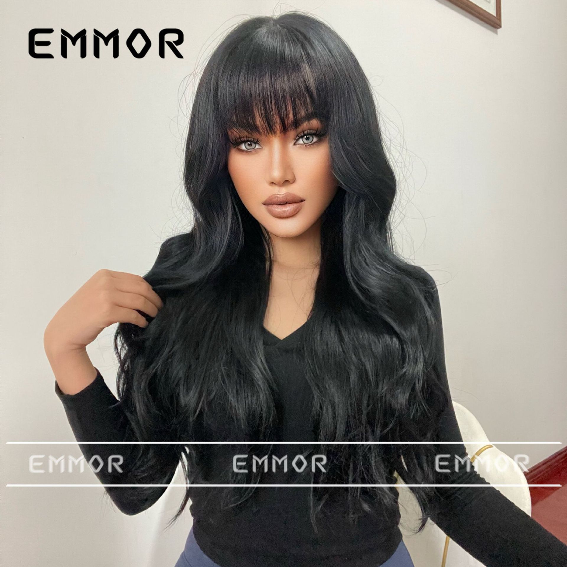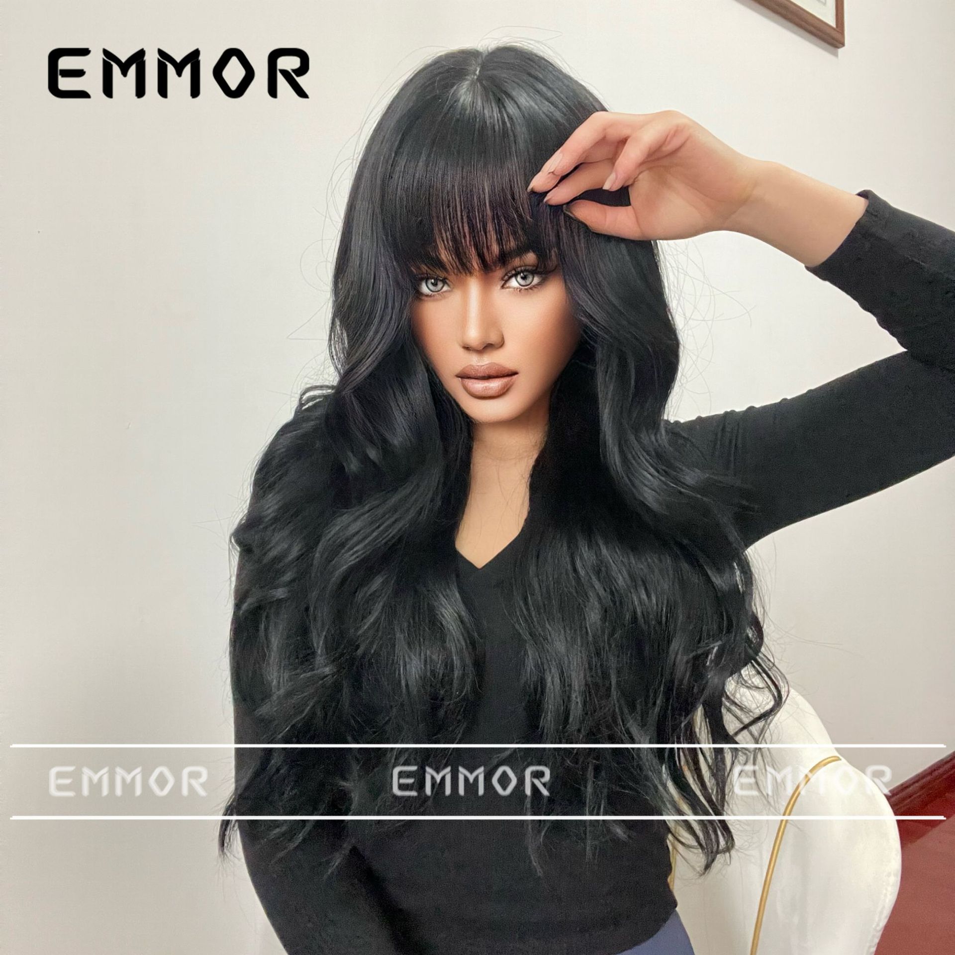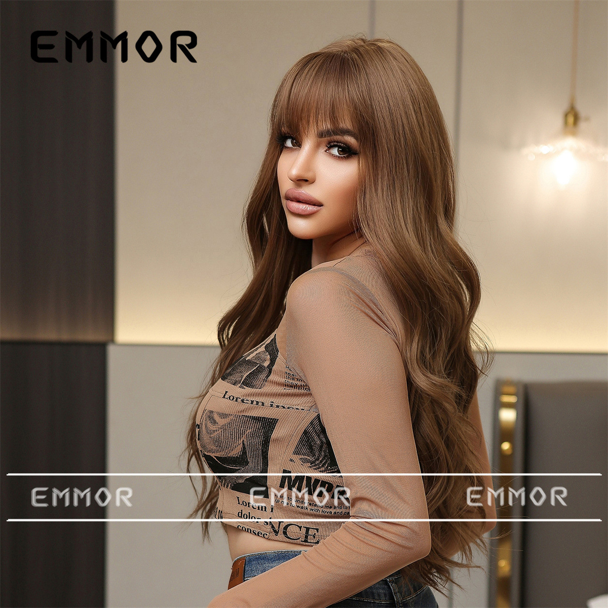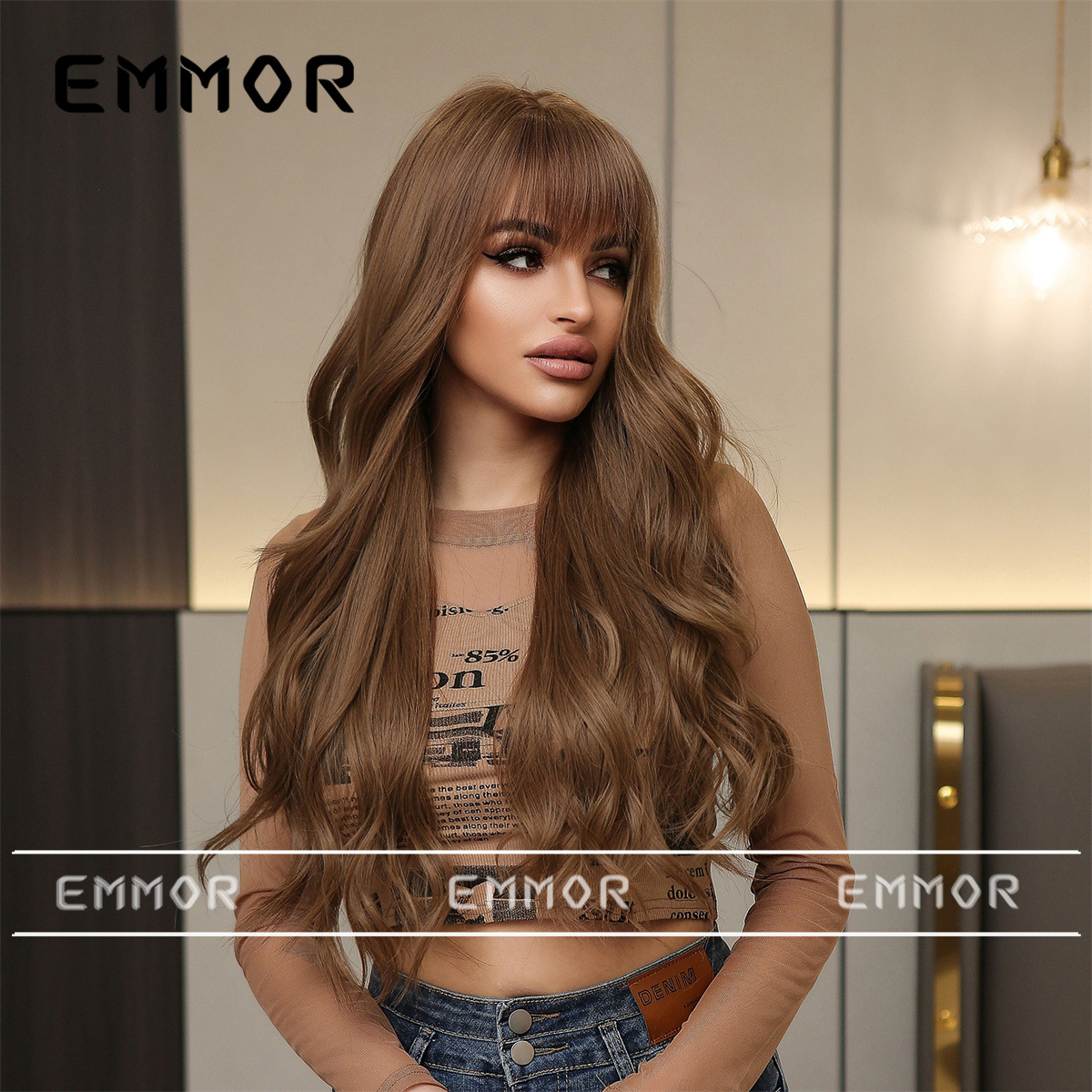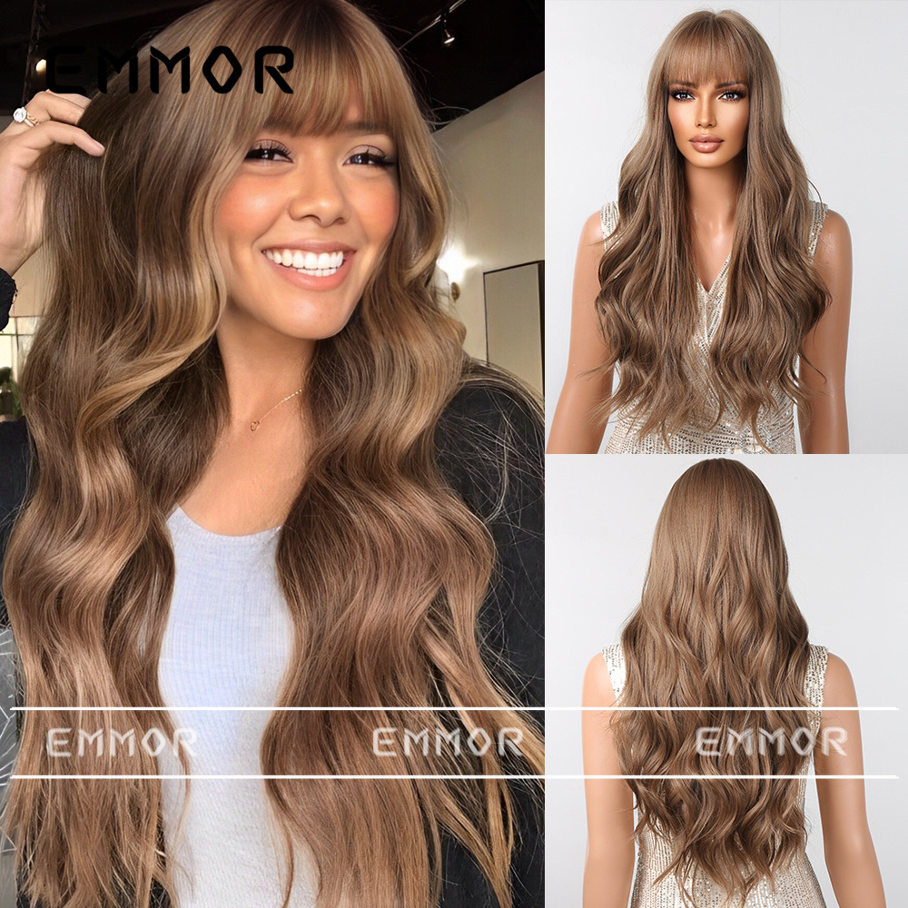 Estilo europeo y americano elegante Peluca de las nuevas mujeres con flequillo gradiente marrón onda grande largo rizado pelo mullido peluca