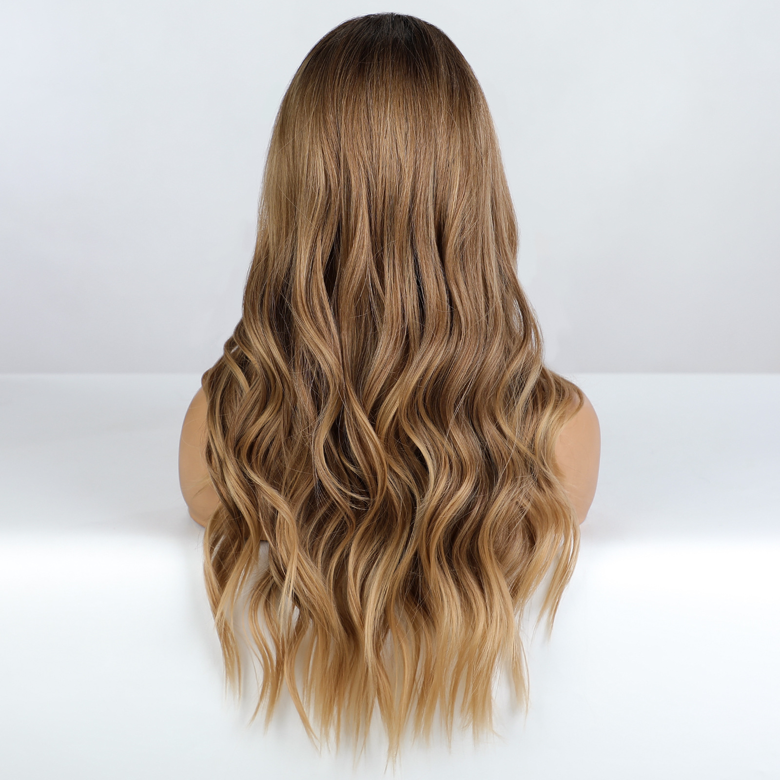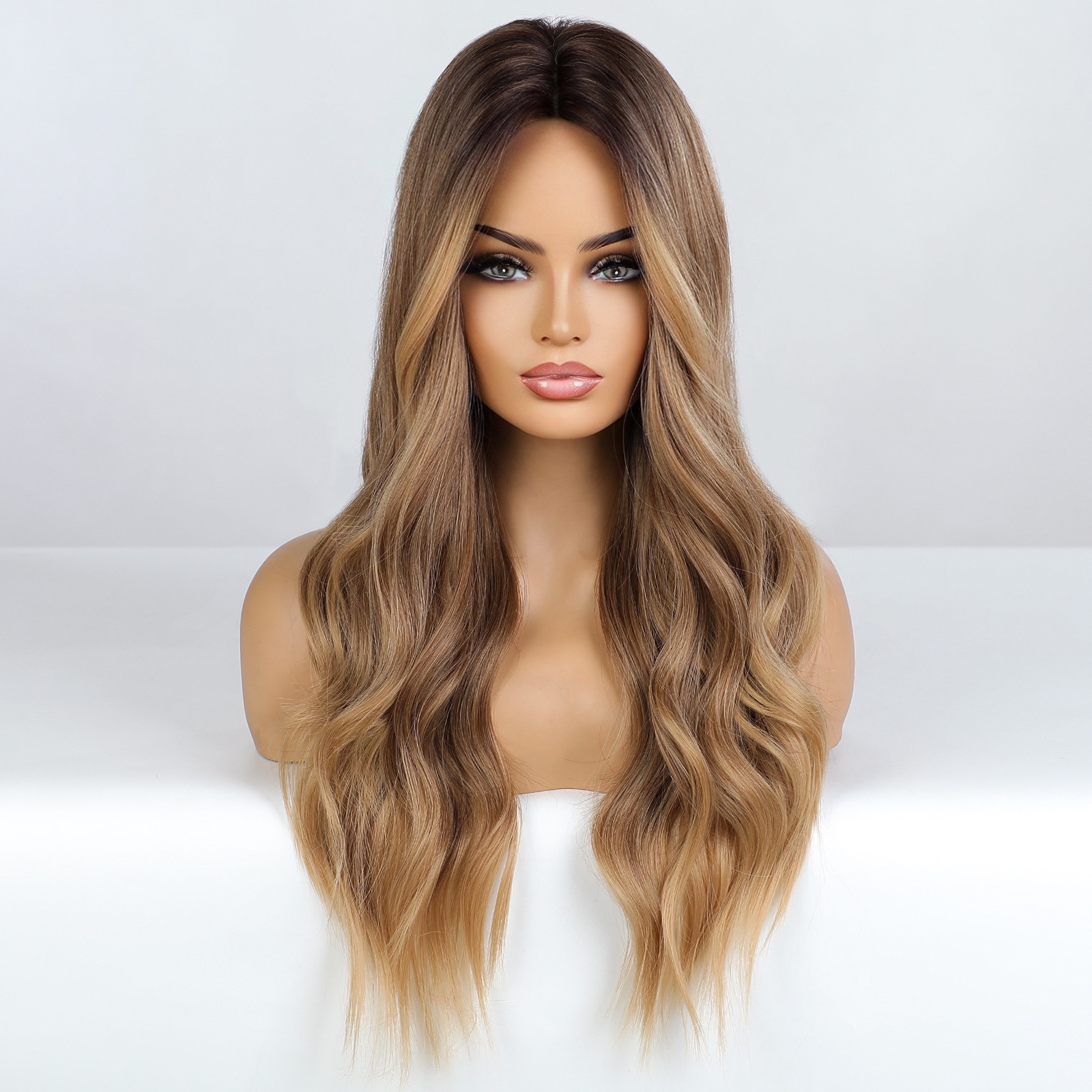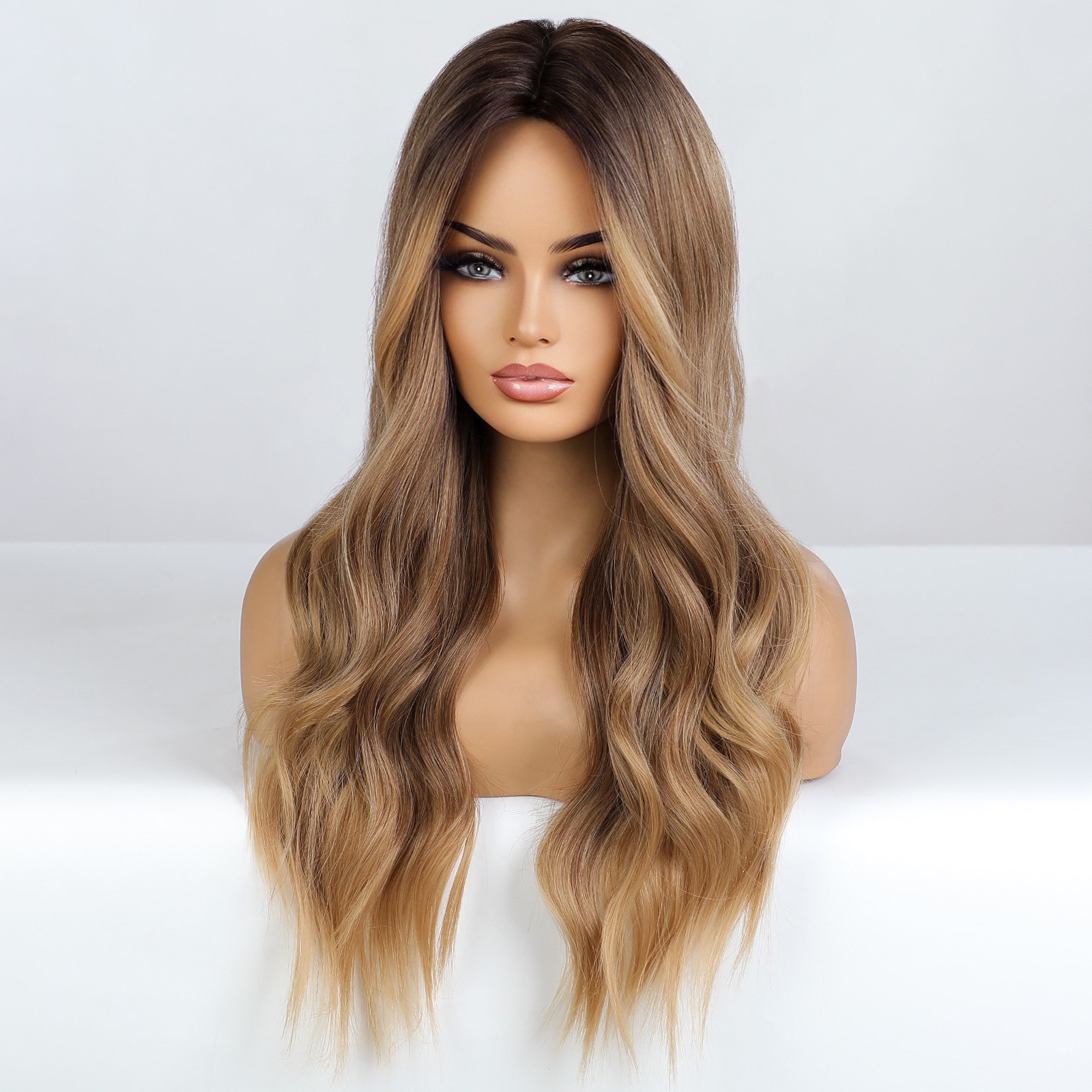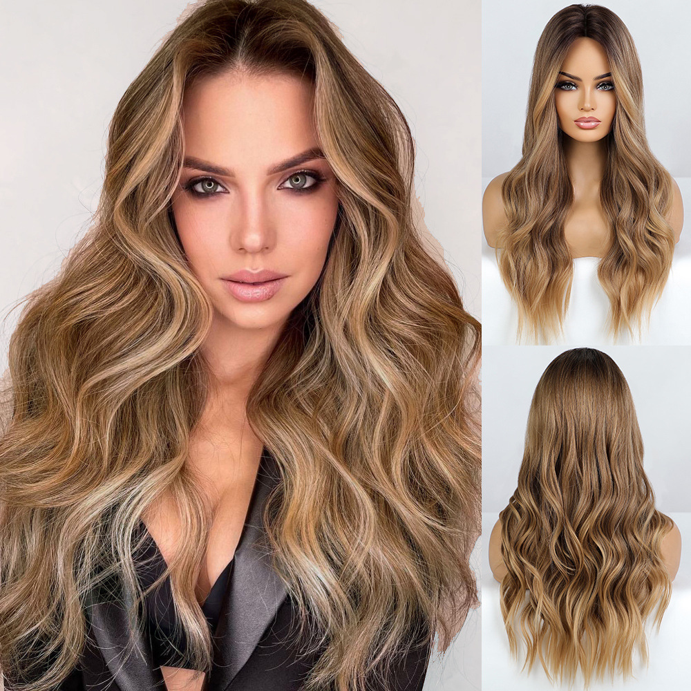 Nueva mitad de la longitud de lino marrón realista gradiente temperamento alta temperatura de seda europea y americana de fibra química larga peluca rizada hembra cubierta de cabeza completa