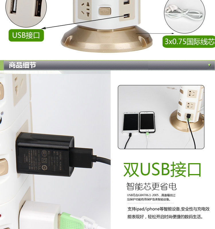 Producción y ventas de oficina de oro, Taihao Jin vertical portátil, carga USB, comercio exterior, exportación, nuevo enchufe de fila