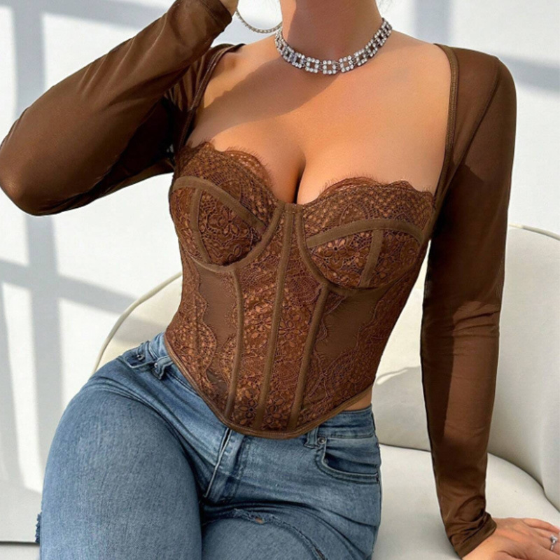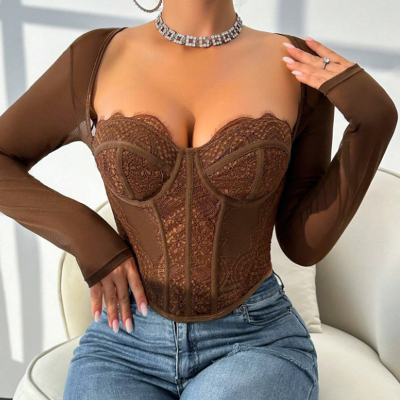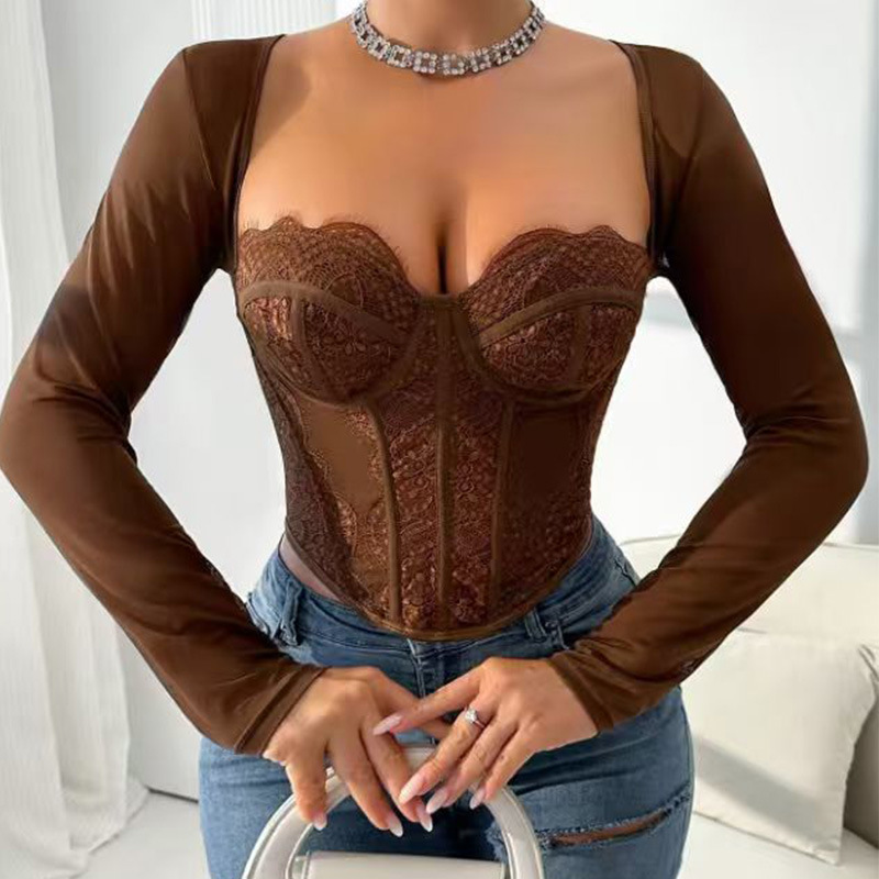 Nuevo anillo de acero transfronterizo de Europa y América delgada malla de malla de empalme chaqueta de encaje sexy perspectiva brazalete de hueso de pez de manga larga