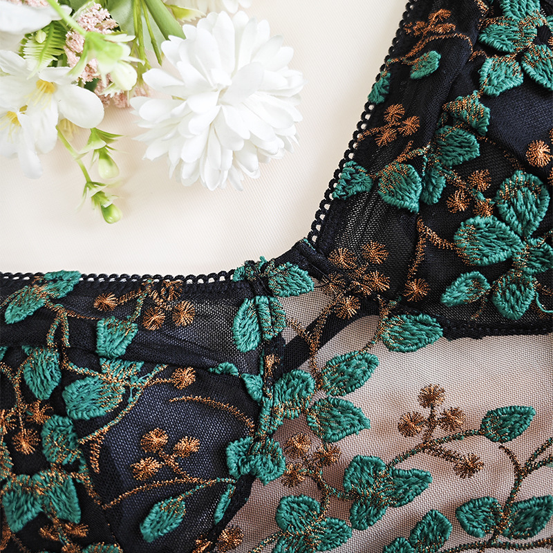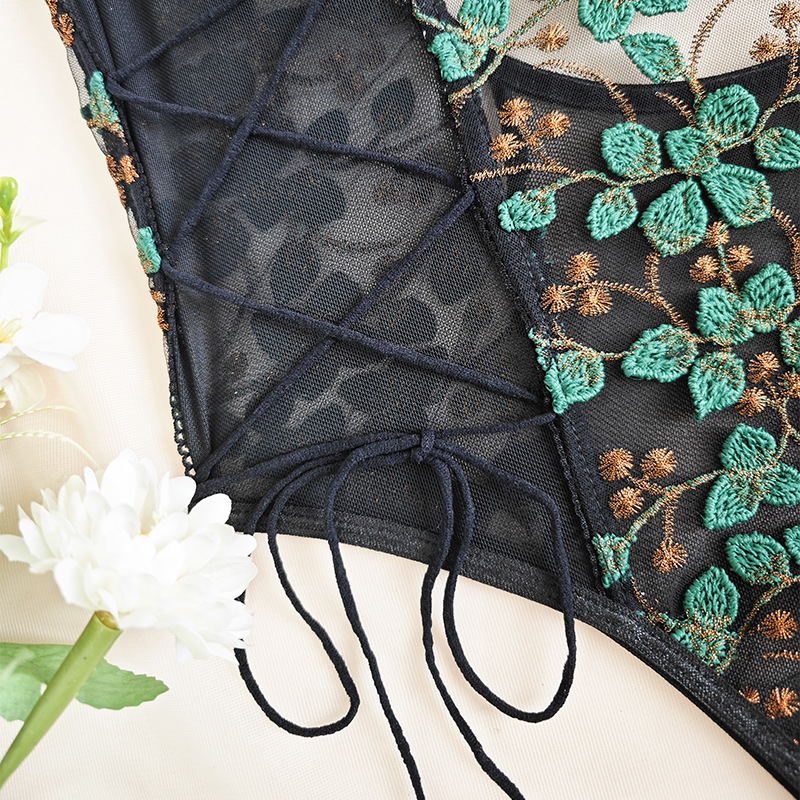 Nuevo estilo transfronterizo caliente malla bordado encaje sexy transparente halter cordón cintura delgada mono mujer