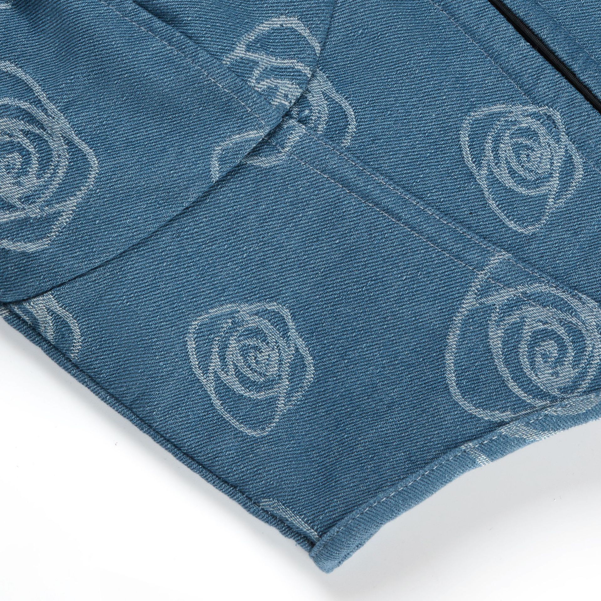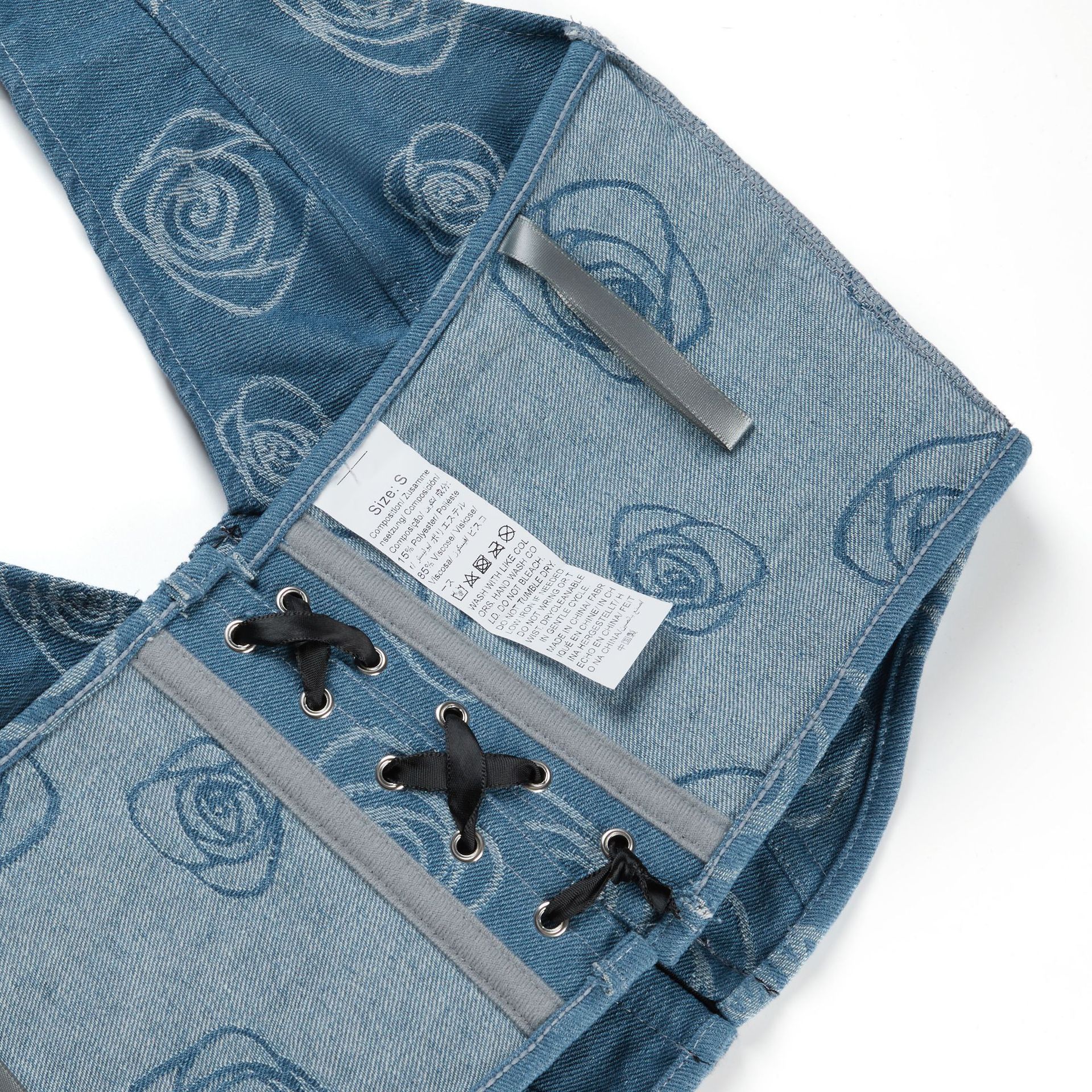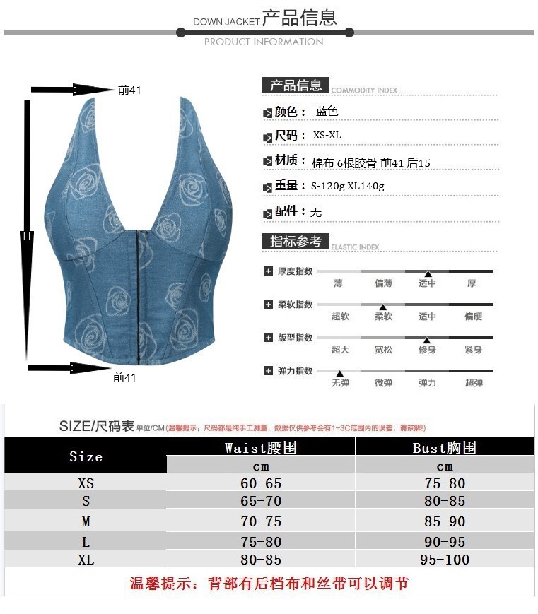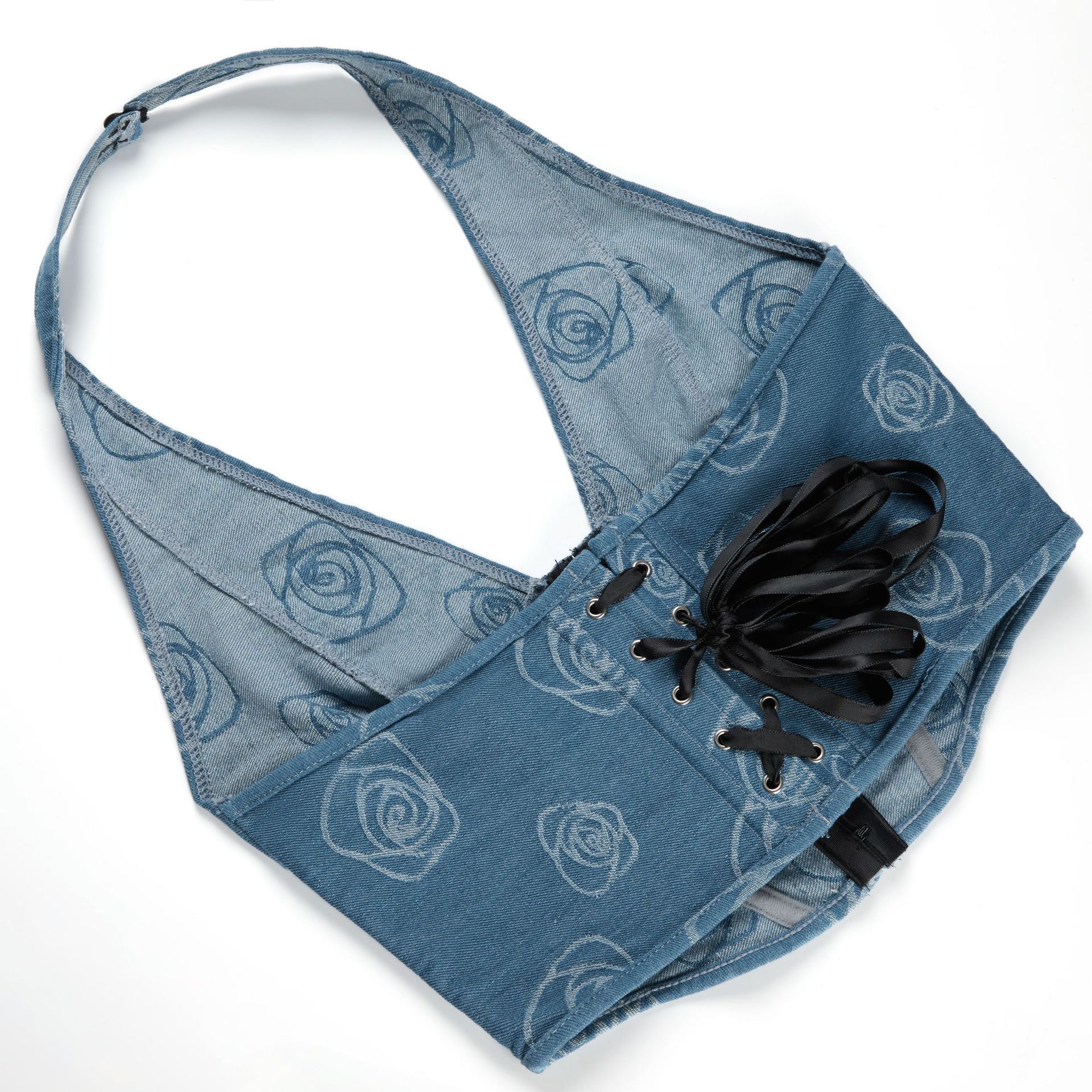 Nuevo retro azul impresión de vaqueros ropa de cuerpo cuello sexy bajo pecho corte plástico ropa de mujer comercio electrónico al por mayor