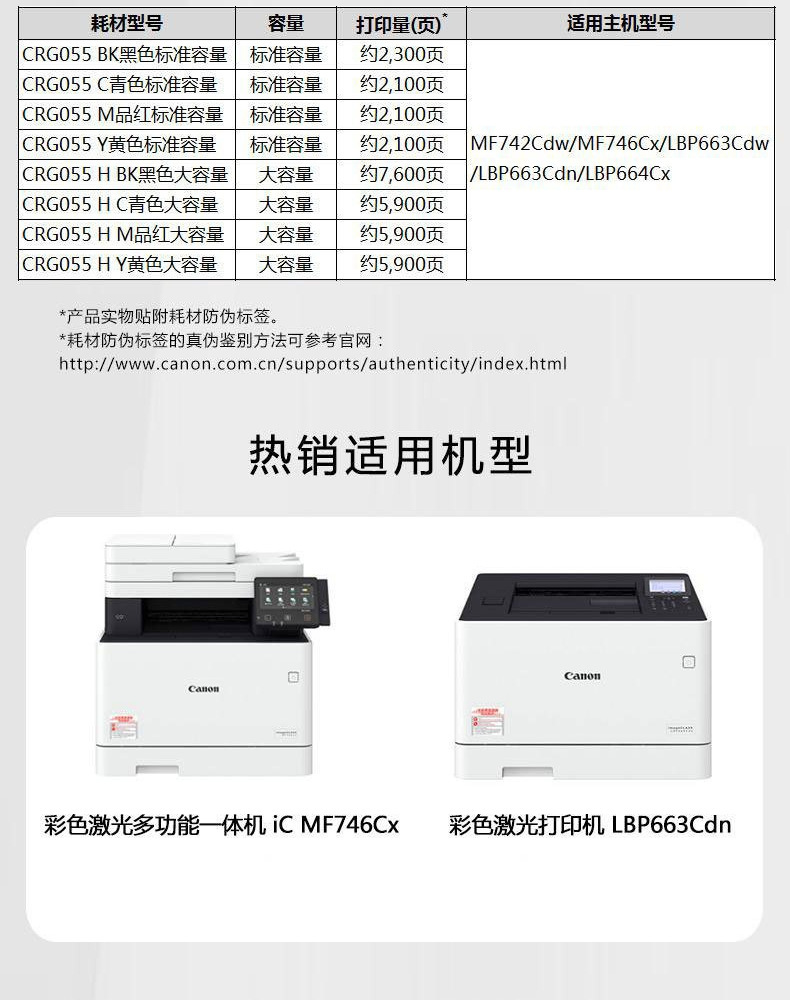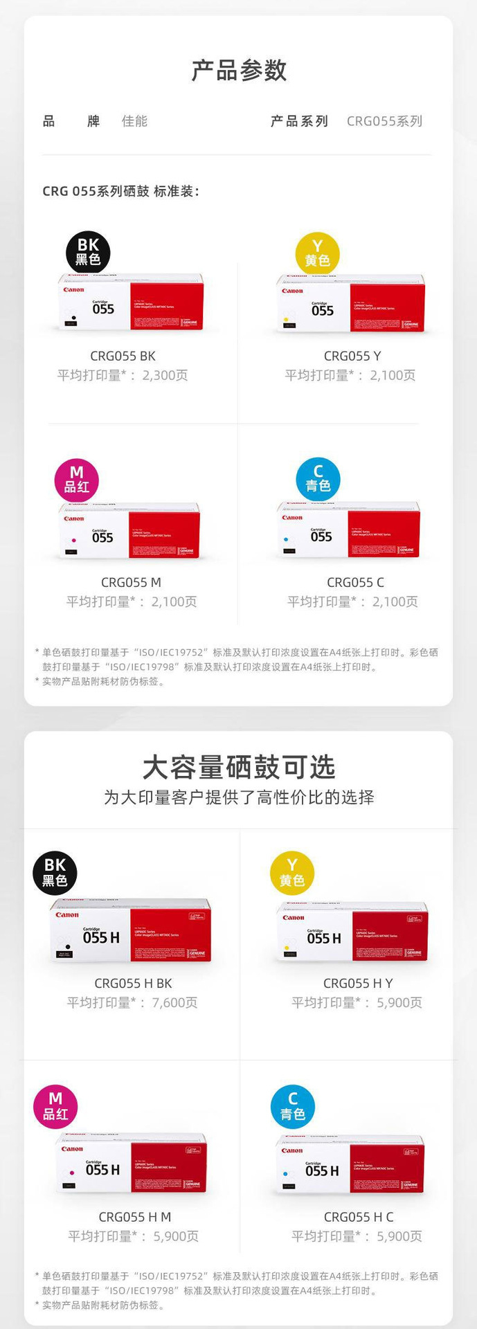 | Color | CRG055 BK (negro, 2300 páginas), CRG055 C (ciano, 2100 páginas), CRG055 M (magenta, 2100 páginas), CRG055 Y (amarillo, 2100 páginas), CRG 055H BK (negro de alto volumen, 7600 páginas), CRG 055H C (ciano de alto volumen, 5900 páginas), CRG 055H M (magenta de alto volumen, 5900 páginas), CRG 055H Y (amarillo de alto volumen, 5900 páginas) |