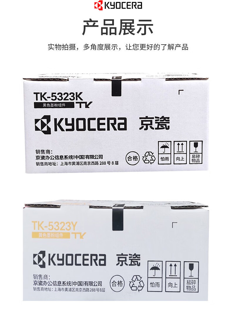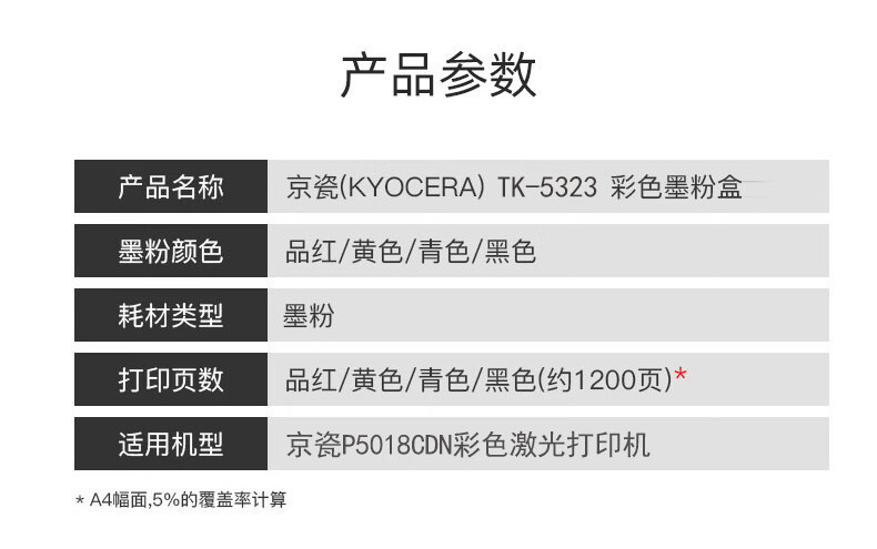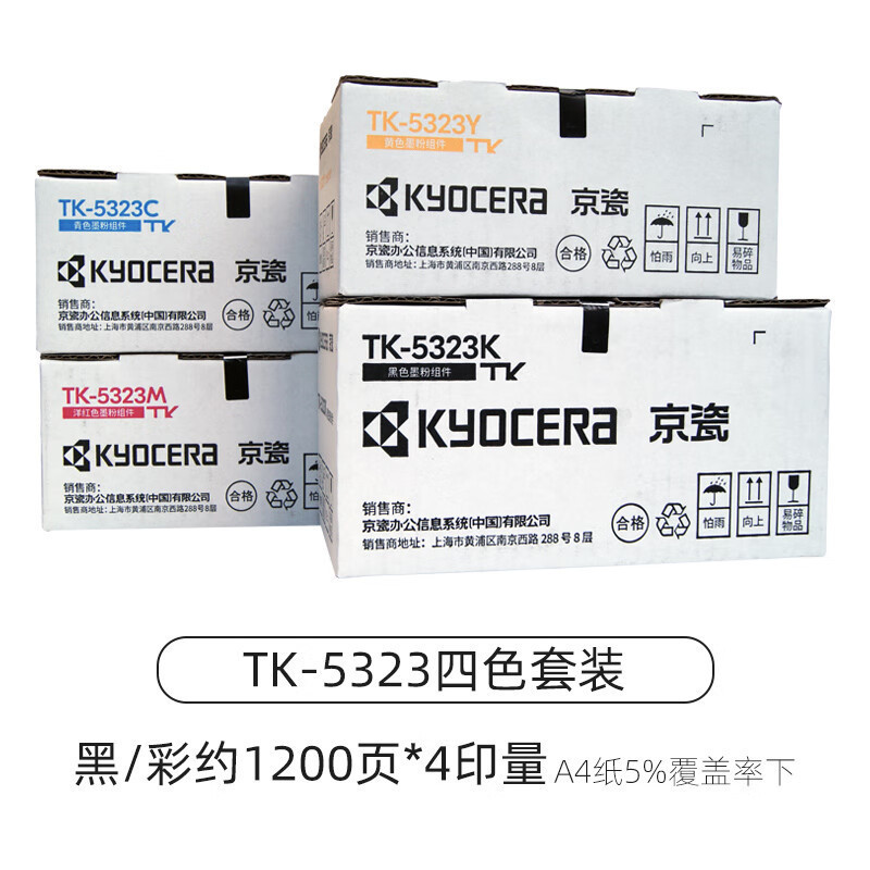 | Colores | Caja de polvo negro Kyocera TK-5323K 1200 páginas,Caja de polvo cian Kyocera TK-5323C 1200 páginas,Caja de polvo rojo Kyocera TK-5323M 1200 páginas,Caja de polvo amarillo Kyocera TK-5323Y 1200 páginas,Juego de cuatro colores en color negro de Kyocera TK-5323 Powder Box |