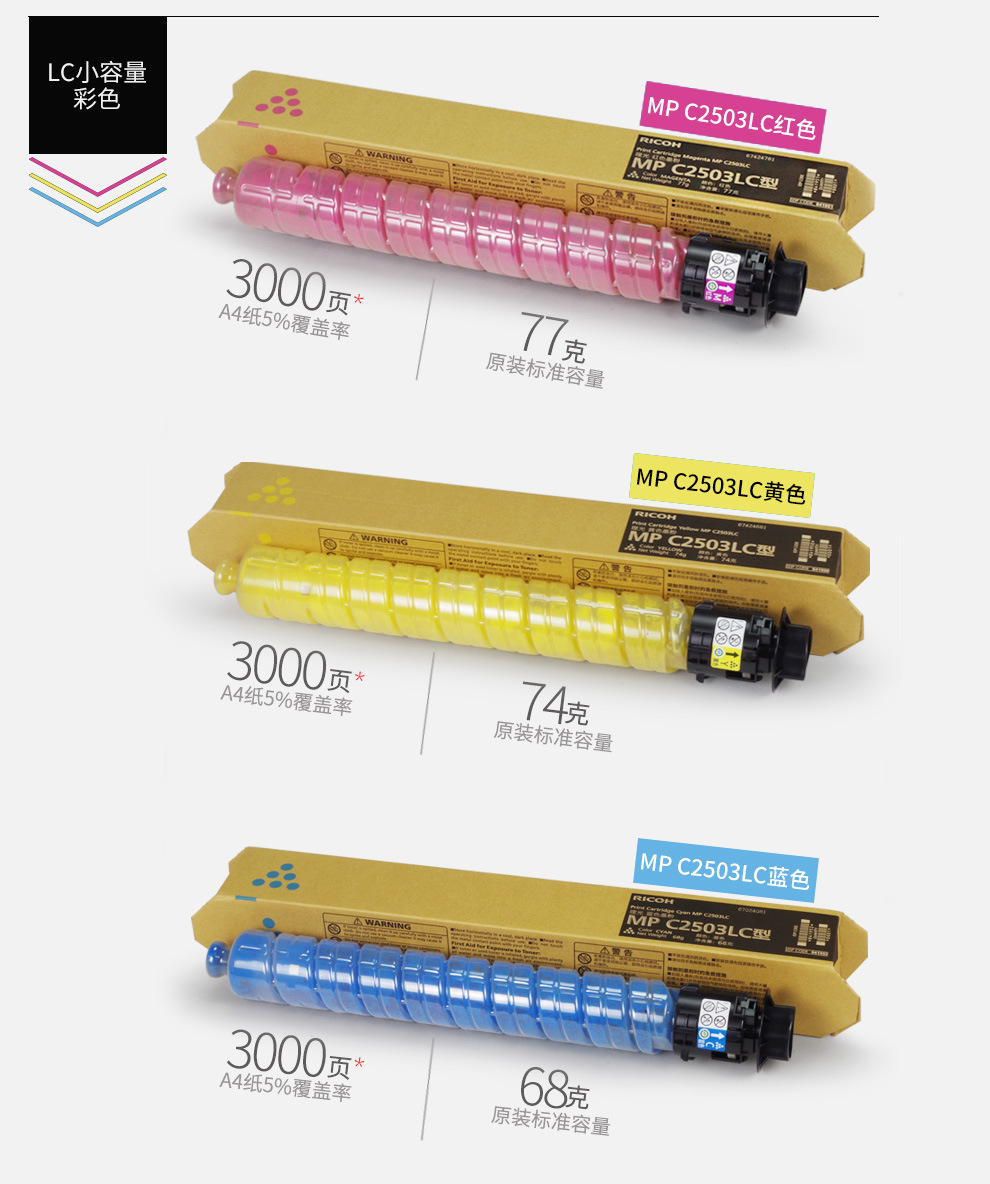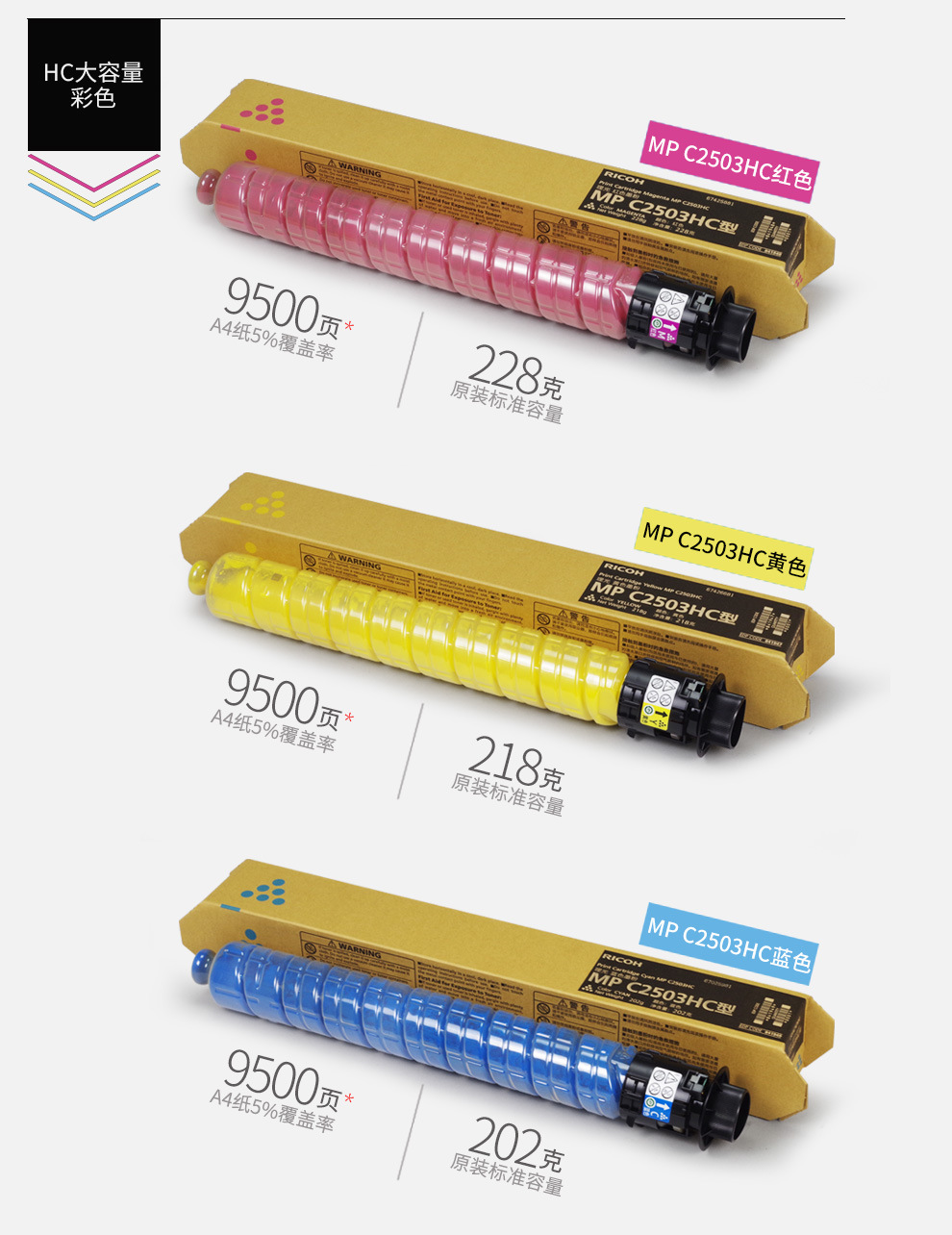 | Color | Ricoh MPC2503LC Azul / 3000 páginas, Ricoh MPC2503LC Rojo / 3000 páginas, Ricoh MPC2503LC Amarillo / 3000 páginas, Ricoh MPC2503LC Negro / 15.000 páginas, Ricoh Cartucho de Toner MPC2503HC Azul / 9500 páginas / 218g, Ricoh Cartucho de Toner MPC2503HC Rojo / 9500 páginas / 228g, Ricoh Cartucho de Toner MPC2503HC Amarillo / 9500 páginas / 202g, un conjunto de capacidad baja, un conjunto de capacidad alta |