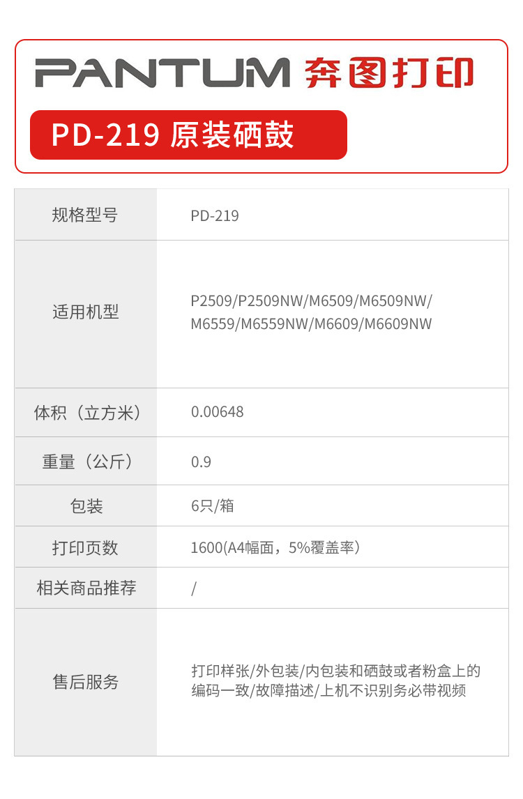 El cartucho de tóner Pantum (PD-219) es adecuado para el tóner de la serie de impresoras P2509/M6509/M6559/M6609
