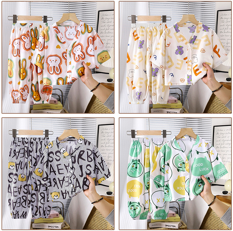 Pajamas de seda de algodón para niños, ropa de aire acondicionado de algodón artificial de verano, ropa para niños y niñas, ropa para el hogar de seda de algodón, dos juegos de ropa infantil